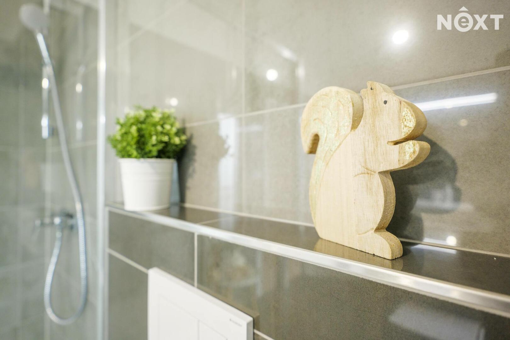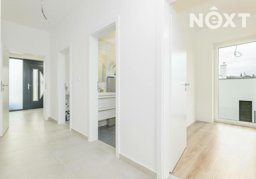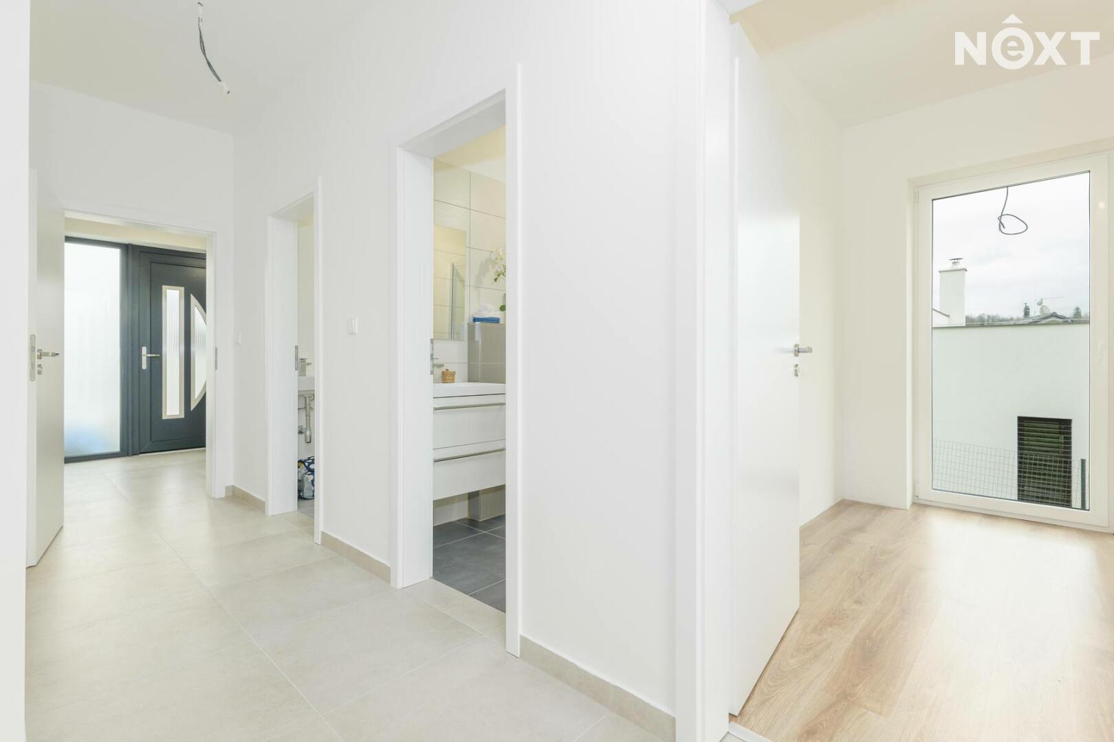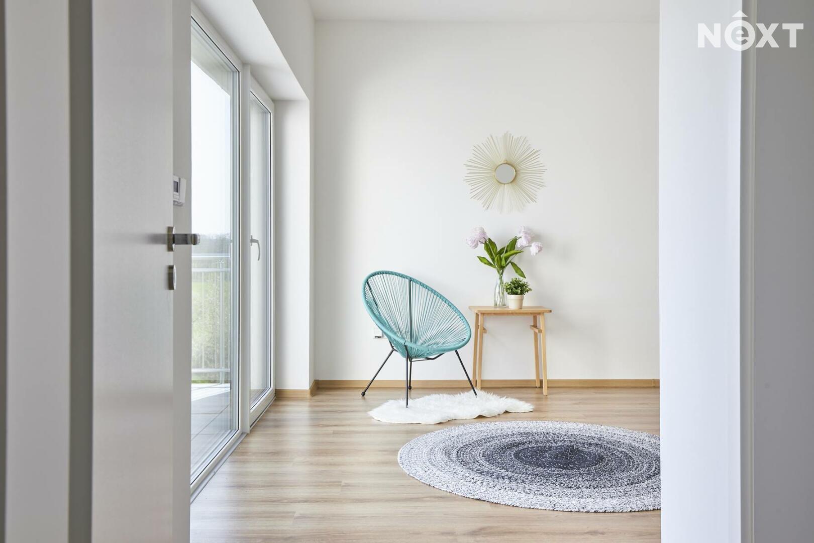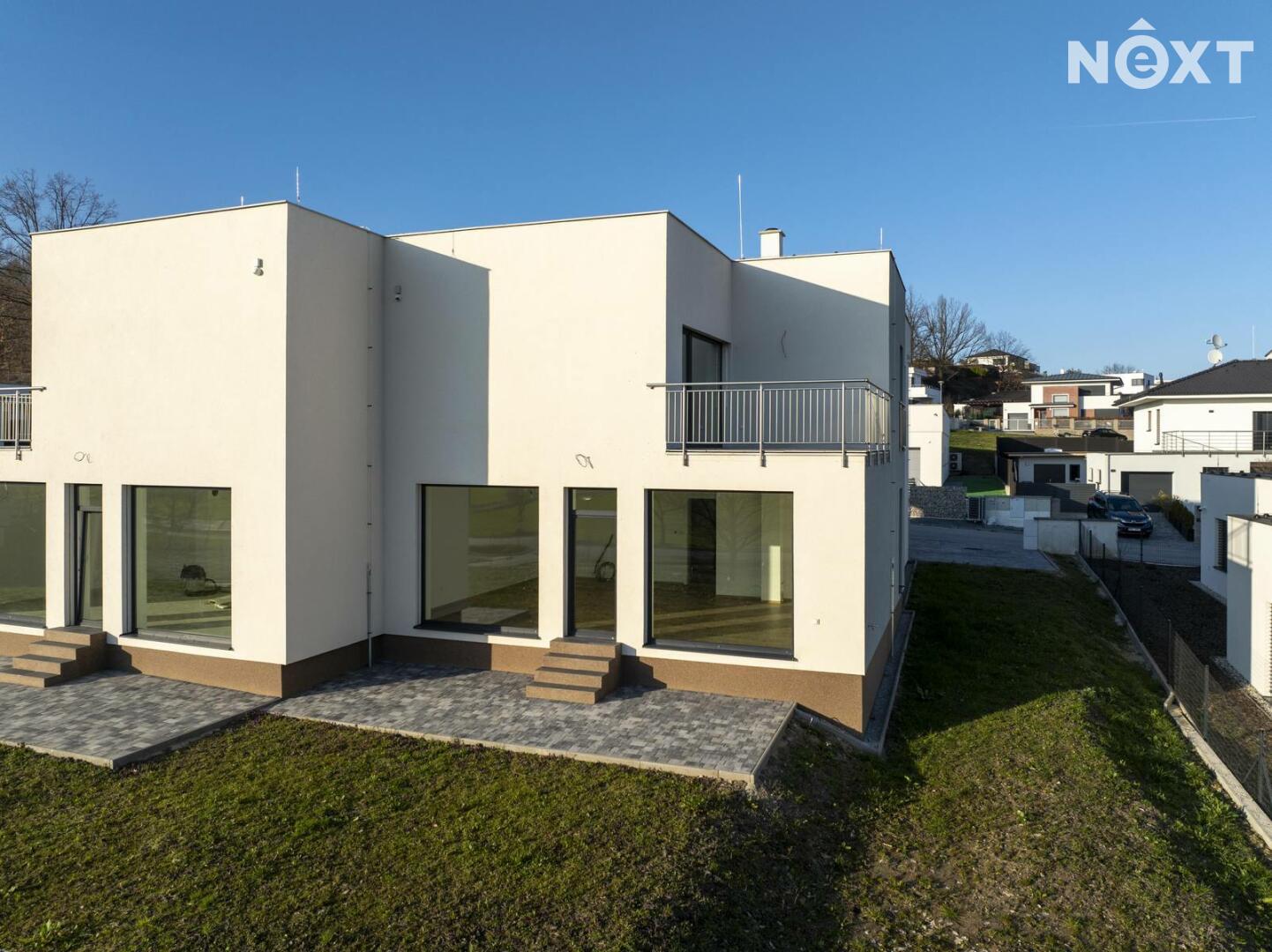Dominantou bytové jednotky je velkorysý obytný prostor s kuchyní o celkové rozloze 56 m². Díky velkoformátovým proskleným plochám a přímému vstupu na venkovní terasu o výměře 21 m² vzniká přirozené propojení interiéru s exteriérem. Jihozápadní orientace přináší dostatek slunečního světla, klid a otevřené výhledy do okolní přírody. Horní podlaží je koncipováno jako soukromá klidová zóna. Hlavní ložnice o rozloze 24,7 m² disponuje vlastní šatnou (7,1 m²) a vstupem na terasu s výhledem do okolní krajiny. Dva další pokoje o velikostech 21,9 m² a 17,4 m² poskytují dostatek prostoru pro rodinu, děti či pracovnu. Samostatná šatna o rozloze 7,6 m² zajišťuje nadstandardní úložné možnosti a luxusní koupelna s vanou, sprchovým koutem a toaletou (9,8 m²) splňuje vysoké nároky na komfort bydlení. Jednotlivé místnosti propojuje hala o velikosti 24,8 m², jejímž architektonickým prvkem je masivní dubové schodiště, které podtrhuje nadčasový charakter interiéru.
