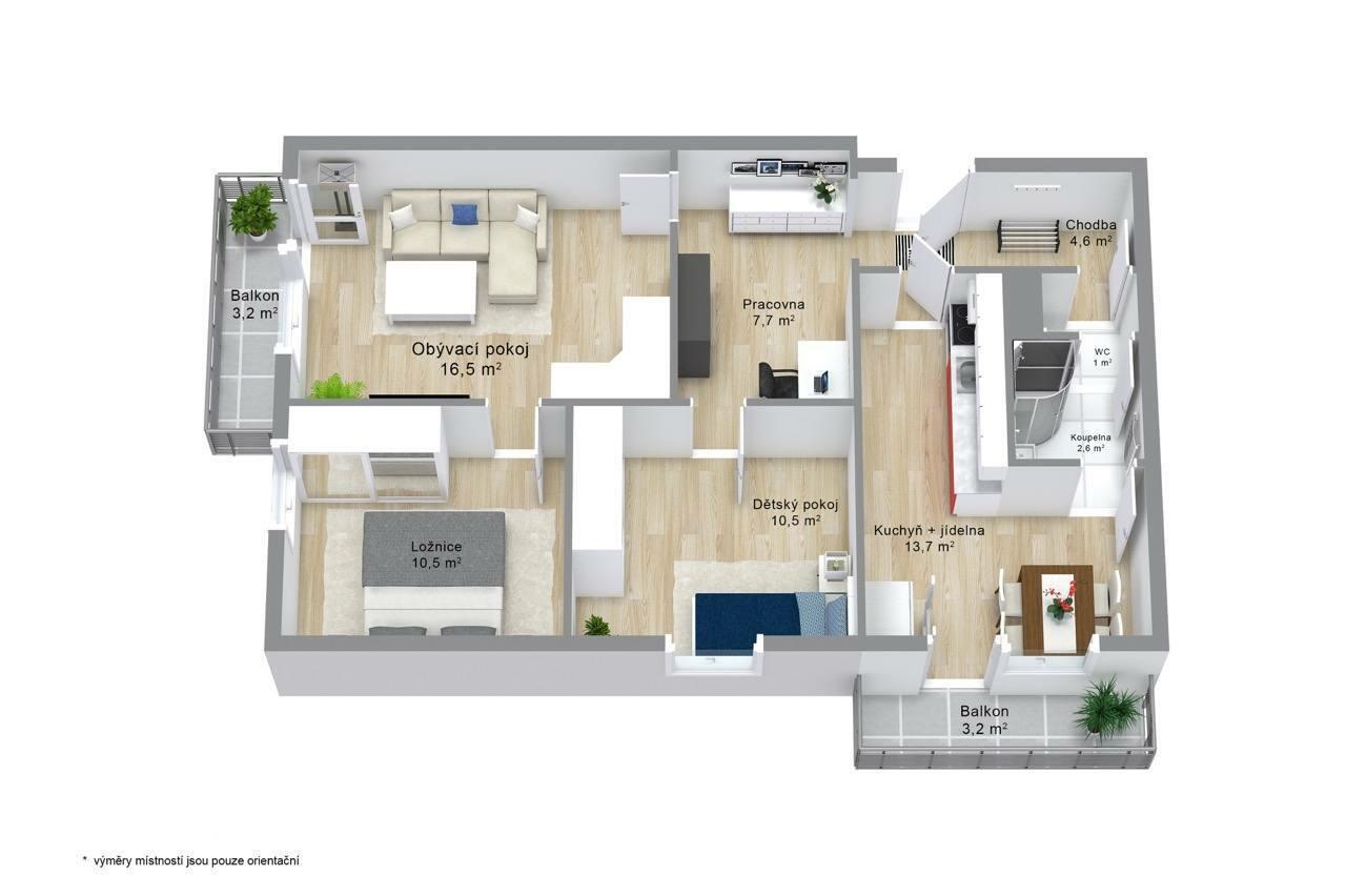 K inzerci připojuji půdorys bytu + fotografie vizualizací místností s vybavením pro lepší představu o vašem novém domově.