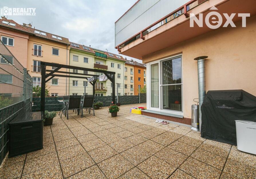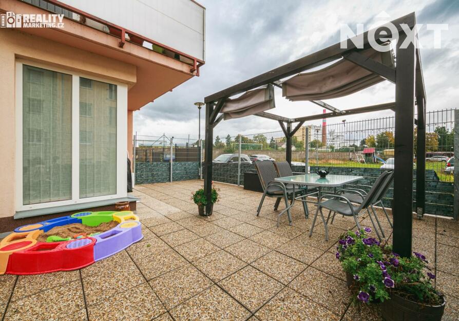 Byt se prodává téměř kompletně vybavený – součástí prodeje je velká šatní skříň, nábytek v obývacím pokoji a pergola na terase.