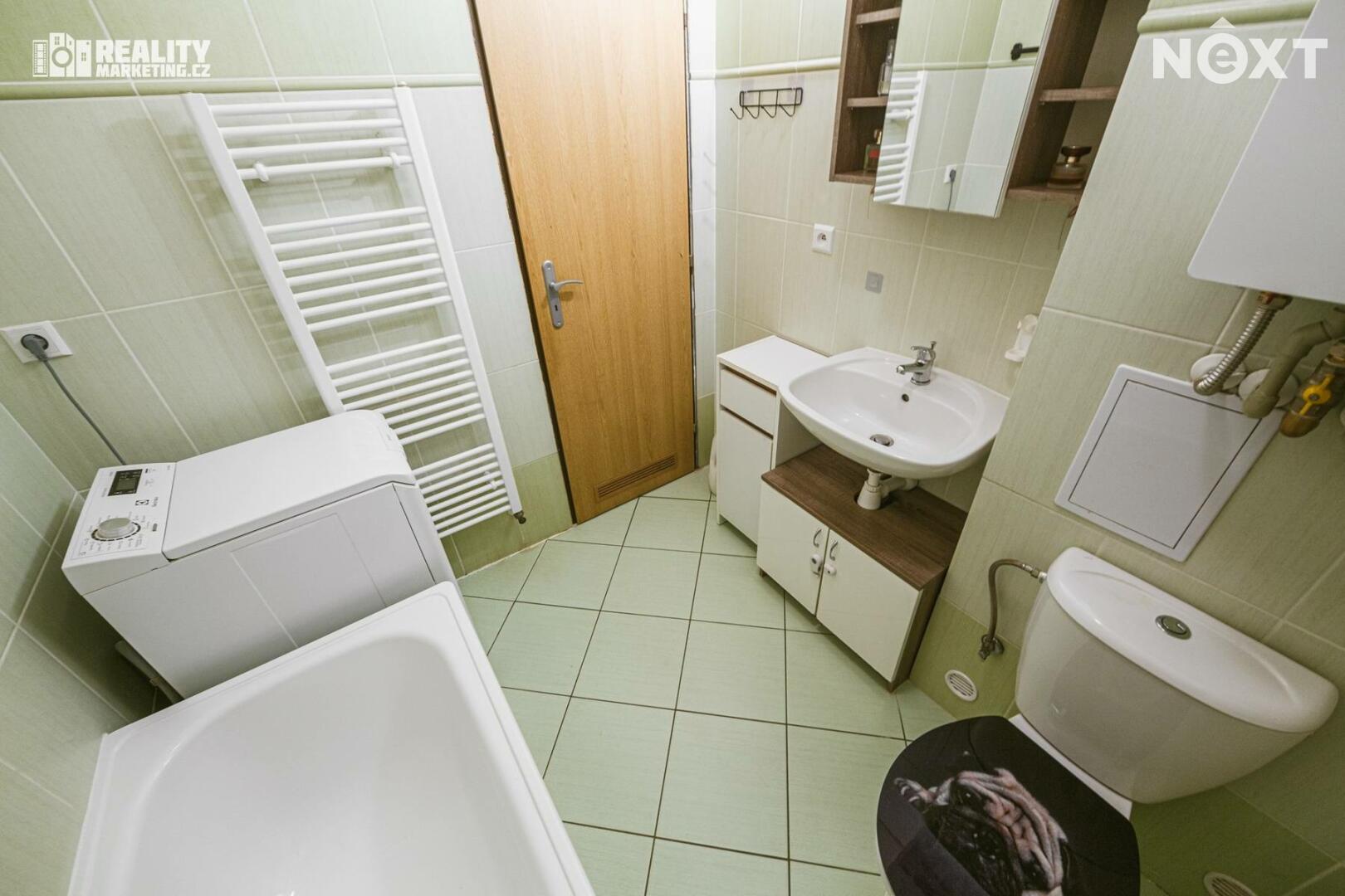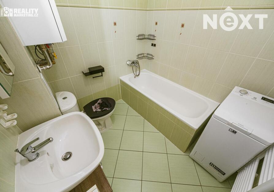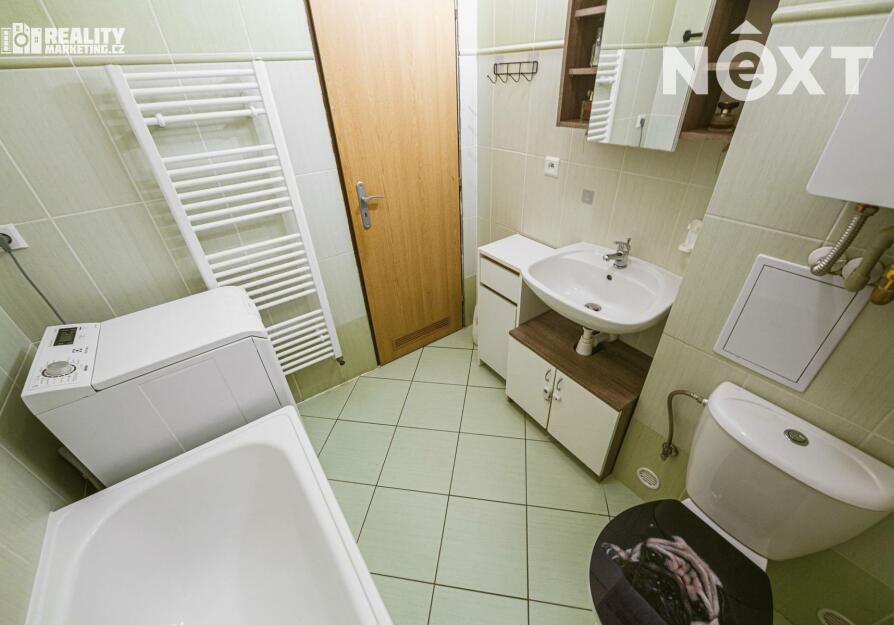 Při vstupu do bytu se nachází prostorná vstupní chodba, ze které je přístup do koupelny s vanou a toaletou. Součástí koupelny je plynový kotel Baxi určený pro vytápění, ohřev vody je centrální domovní.