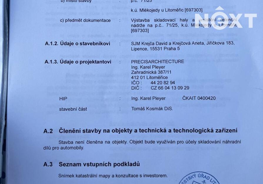 Exkluzivně nabízíme prodej komerčního pozemku v obci Mlékojedy u Litoměřic o výměře 1000 m2. Na pozemek je vydané stavební povolení na skladovací halu o výměře 500 m2. Pozemek se nachází ve vzdálenosti pouhých 6km od dálničního sjezdu na 45. kilometru dálnice D8 a v bezprostřední blízkosti od centra města Litoměřice.