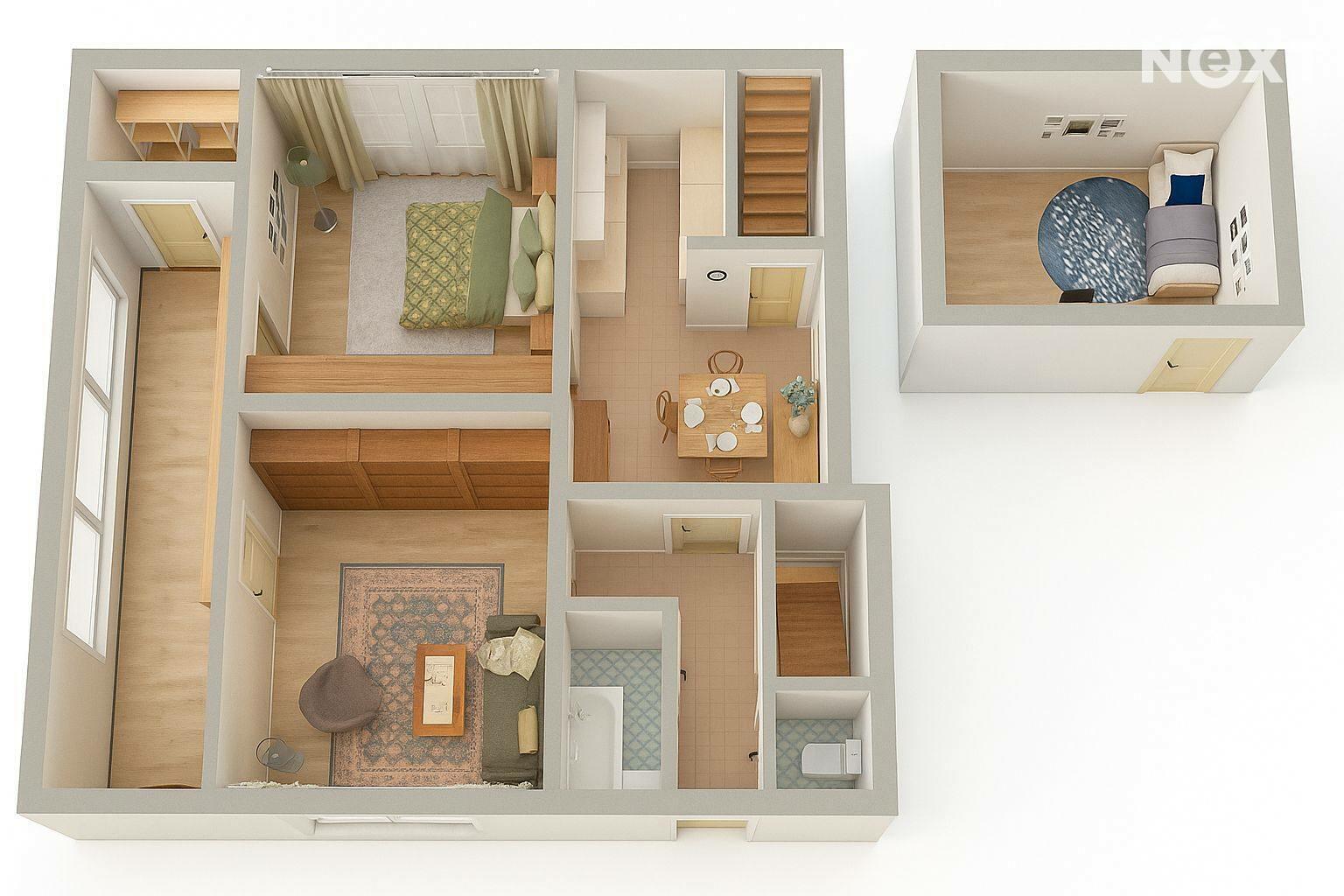 Součástí nemovitosti je také zahrada a hospodářské stavení, které může sloužit jako dílna, úložný prostor nebo menší chovné zázemí.
