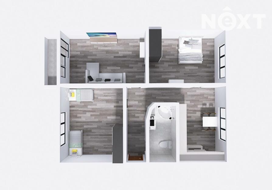 Dispozice bytu je praktická a umožňuje široké možnosti úprav. Po vstupu do bytu se nachází prostorná chodba s dostatkem úložného prostoru, koupelna s vanou, samostatné WC a tři neprůchozí pokoje, které zajišťují naprosté soukromí.