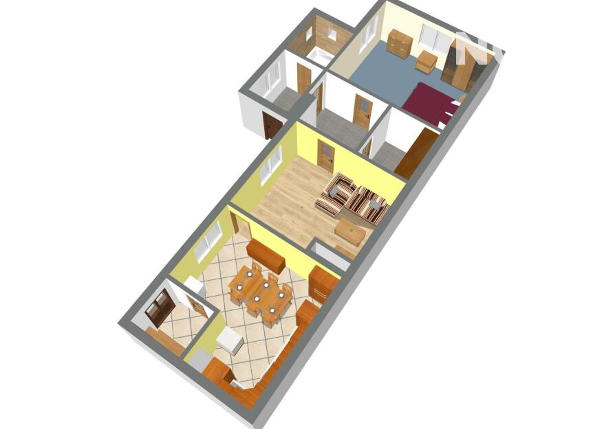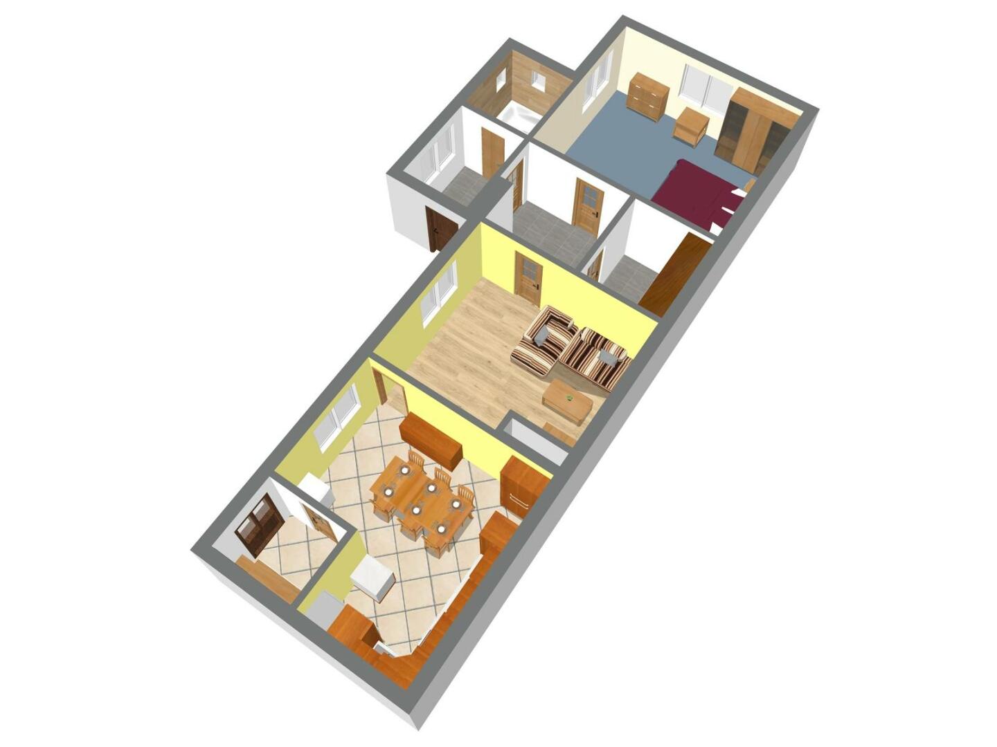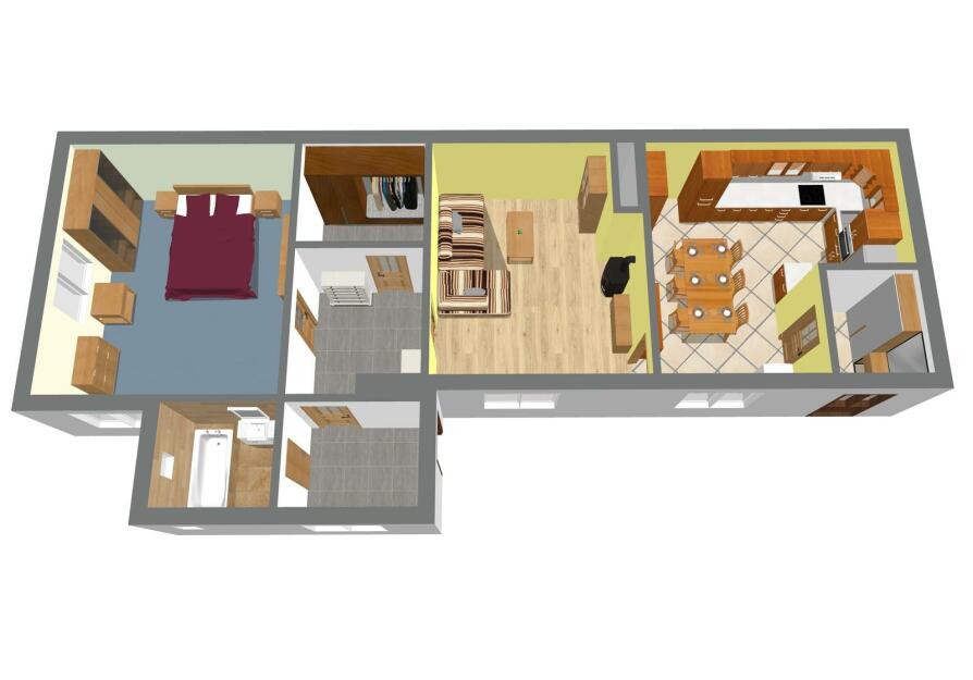 Dům má podlahovou plochu 87 m² a aktuální dispozici 2+kk. Kdyby vám časem začalo být těsno, vytvoříte z něj bez problému 3+kk.