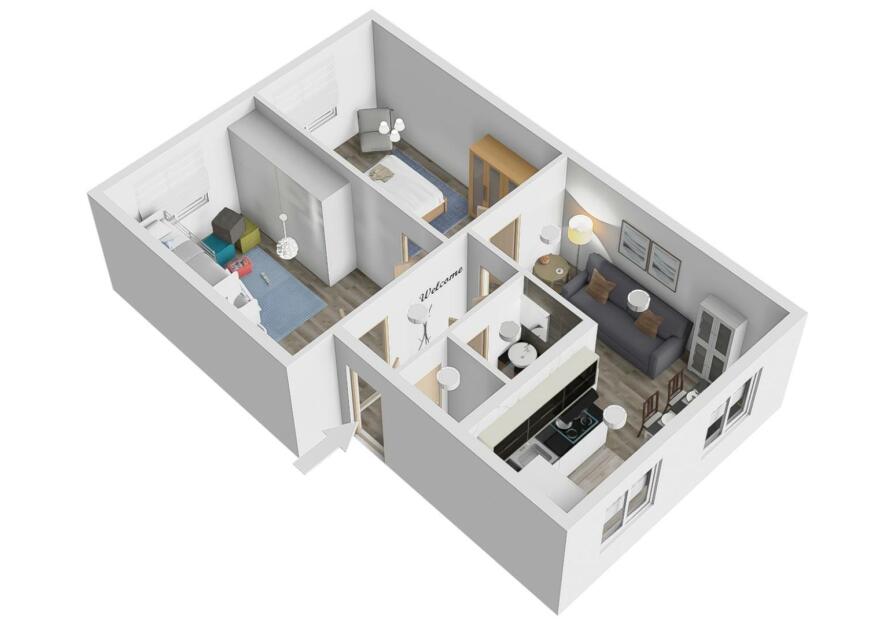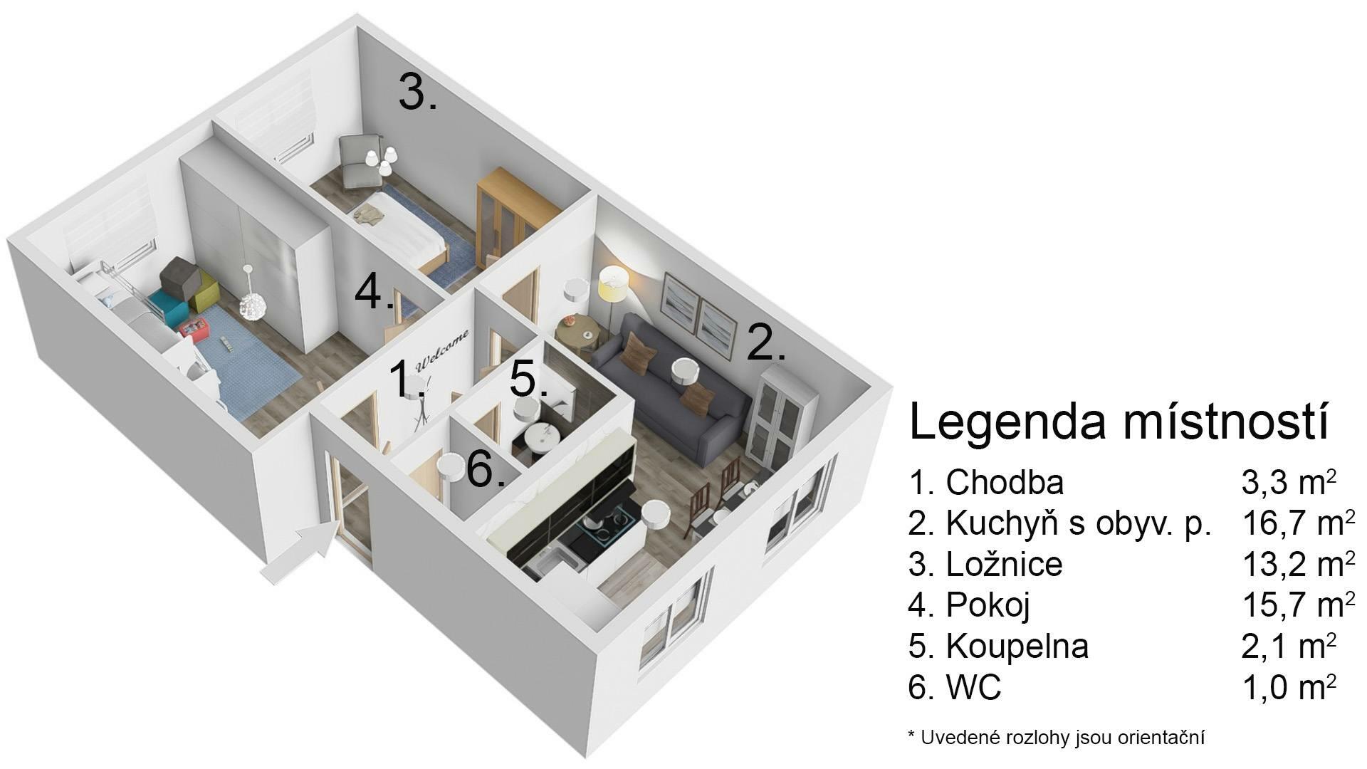 K dispozici je vstupní chodba (3,3 m2), kuchyňský kout s jídelnou a obývacím pokojem (16,7 m2), ložnice (13,2 m2), pokoj (15,7 m2), koupelna s vanou (2,1 m2), samostatné WC (1 m2). K bytu navíc náleží vlastní garáž, velmi prostorný sklep (10,2 m2) a zahrada (81 m2) za bytovým domem. Na zahradu se lze dostat přes garáž. Vytápění bytu je ústřední, zajištěno vlastním elektrickým kotlem.