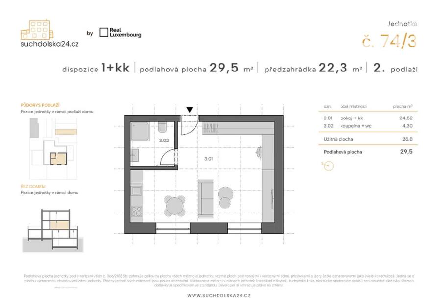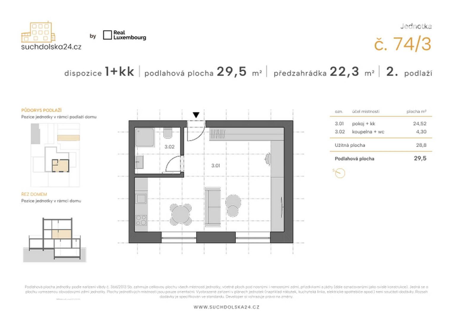 Jednotka se skládá z pokoje s přípravou pro kuchyňskou linku o ploše 24,52 m² a kompletně zařízenou koupelnou s toaletou a podlahovým vytápěním o ploše 4,30 m² .