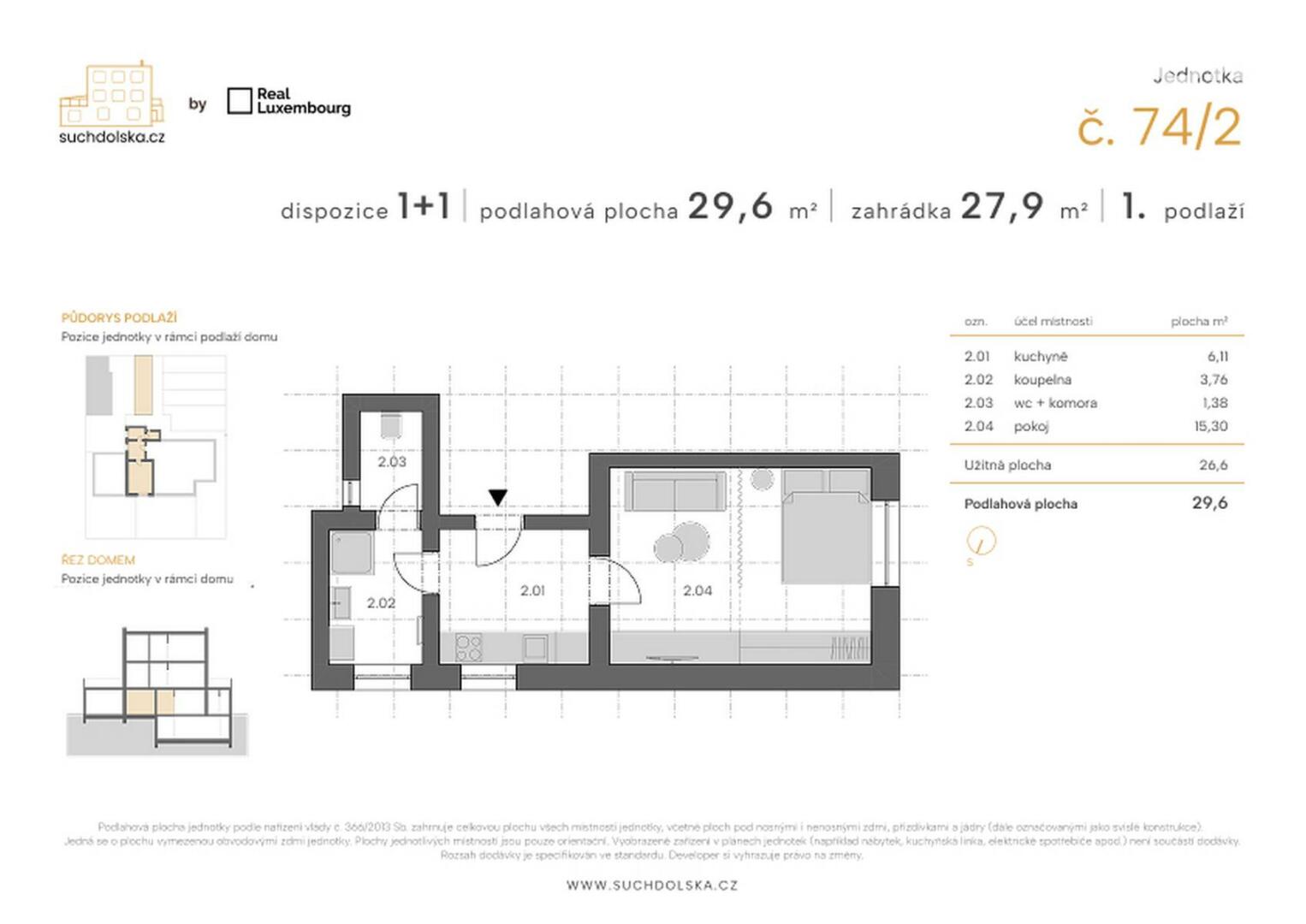 Jednotka se skládá z pokoje o ploše 15,30 m², kuchyně s přípravou pro kuchyňskou linku o ploše 6,11 m², kompletně zařízenou koupelnou s podlahovým vytápěním o ploše 3,76 m² a toaletou o velikosti 1,38 m².