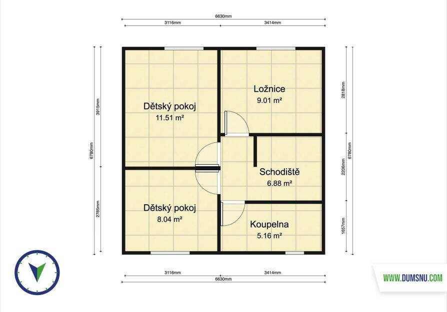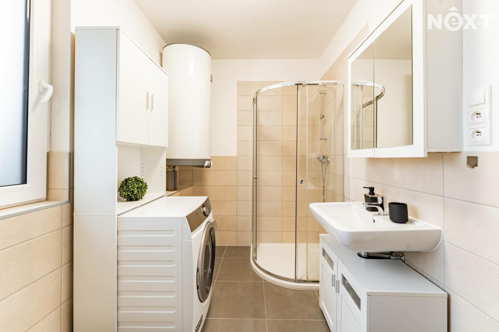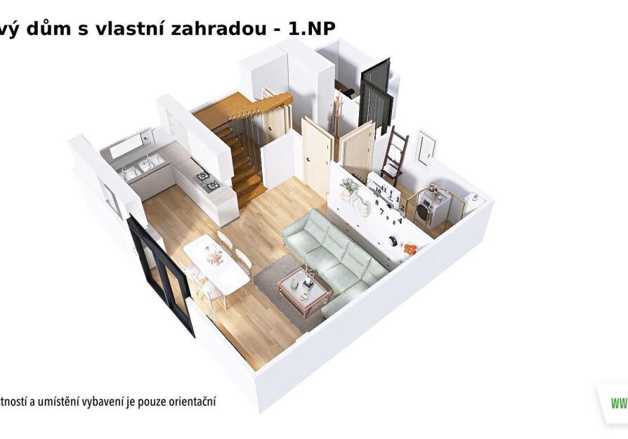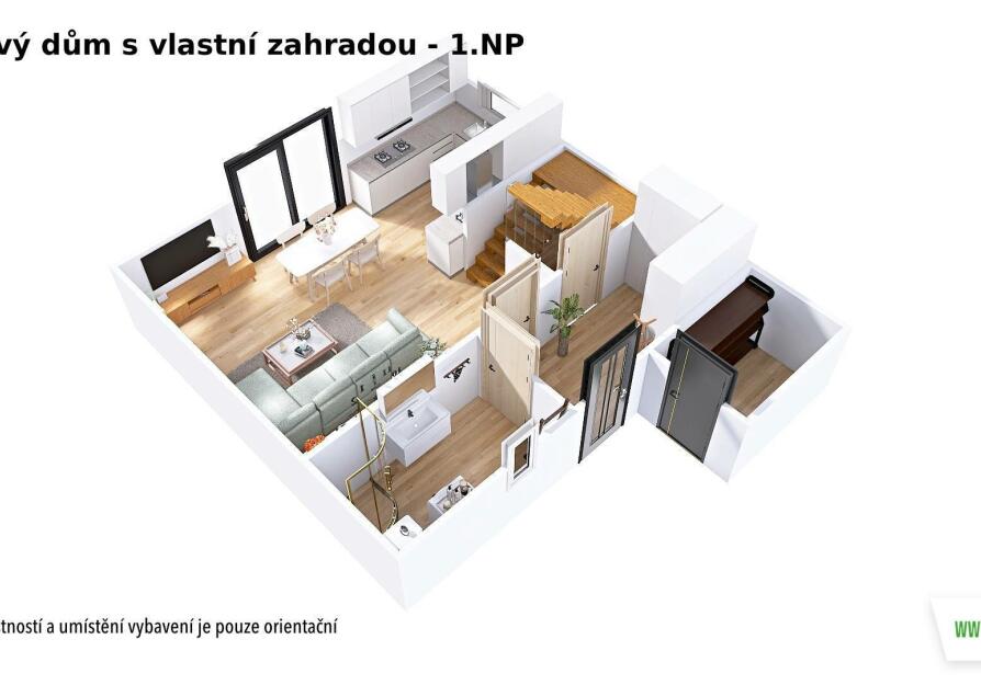 V přízemí domu se nachází prostorný obývací pokoj s moderní kuchyní, ze kterého je přímý vstup na terasu. Dále zde najdete zádveří s místem pro vestavěnou skříň, technické zázemí a koupelnu se sprchovým koutem. V patře jsou tři ložnice a druhá koupelna s vanou.