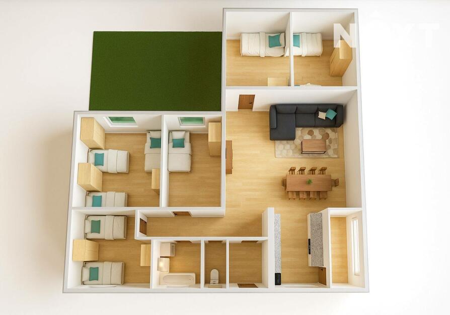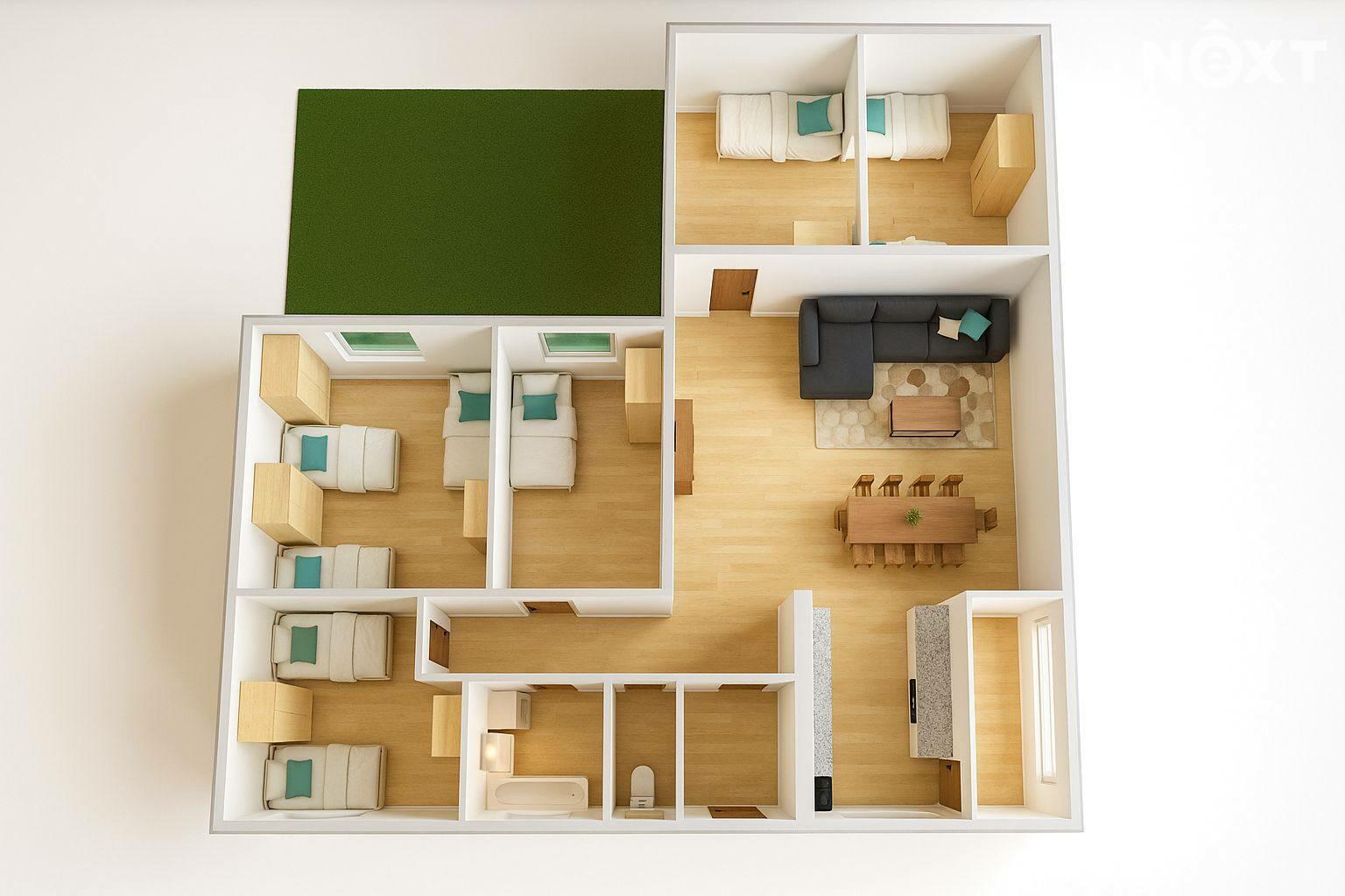 Dům disponuje čtyřmi samostatnými pokoji a obývacím prostorem s kuchyňským koutem. Celková kapacita je až 9 osob, v každém pokoji jsou jednolůžkové postele, lednice a skříňky – vše zcela nové.