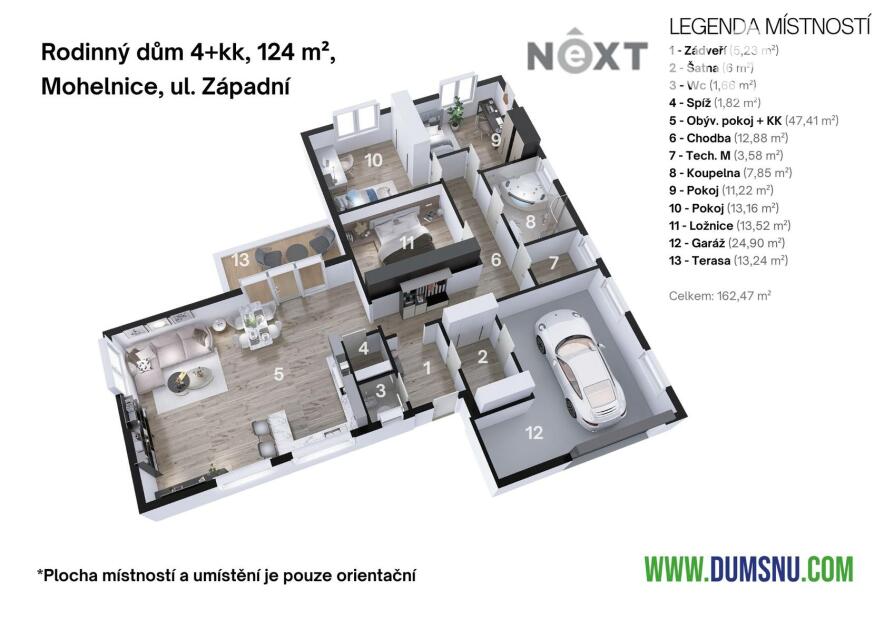 Nabízíme vám moderní rodinný dům typu bungalov s užitnou plochou 124 m² a zahradou o rozloze 615 m², nacházející se v klidné a žádané části Mohelnice, v ulici Západní. Jedná se o samostatně stojící přízemní dům kolaudovaný v roce 2018, postavený ve zděném provedení, který zaujme kvalitním zpracováním, praktickou dispozicí a pečlivě udržovaným okolím.