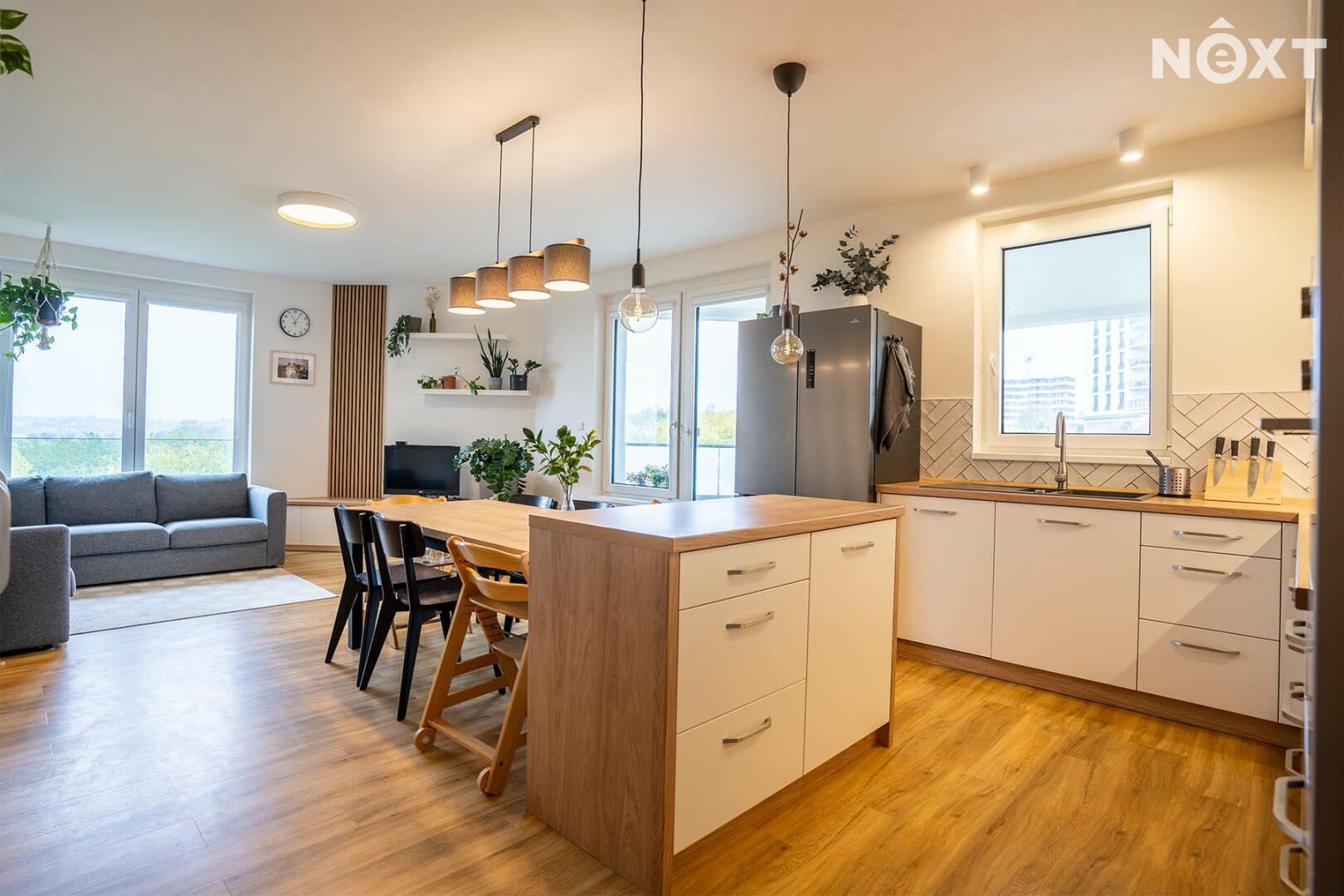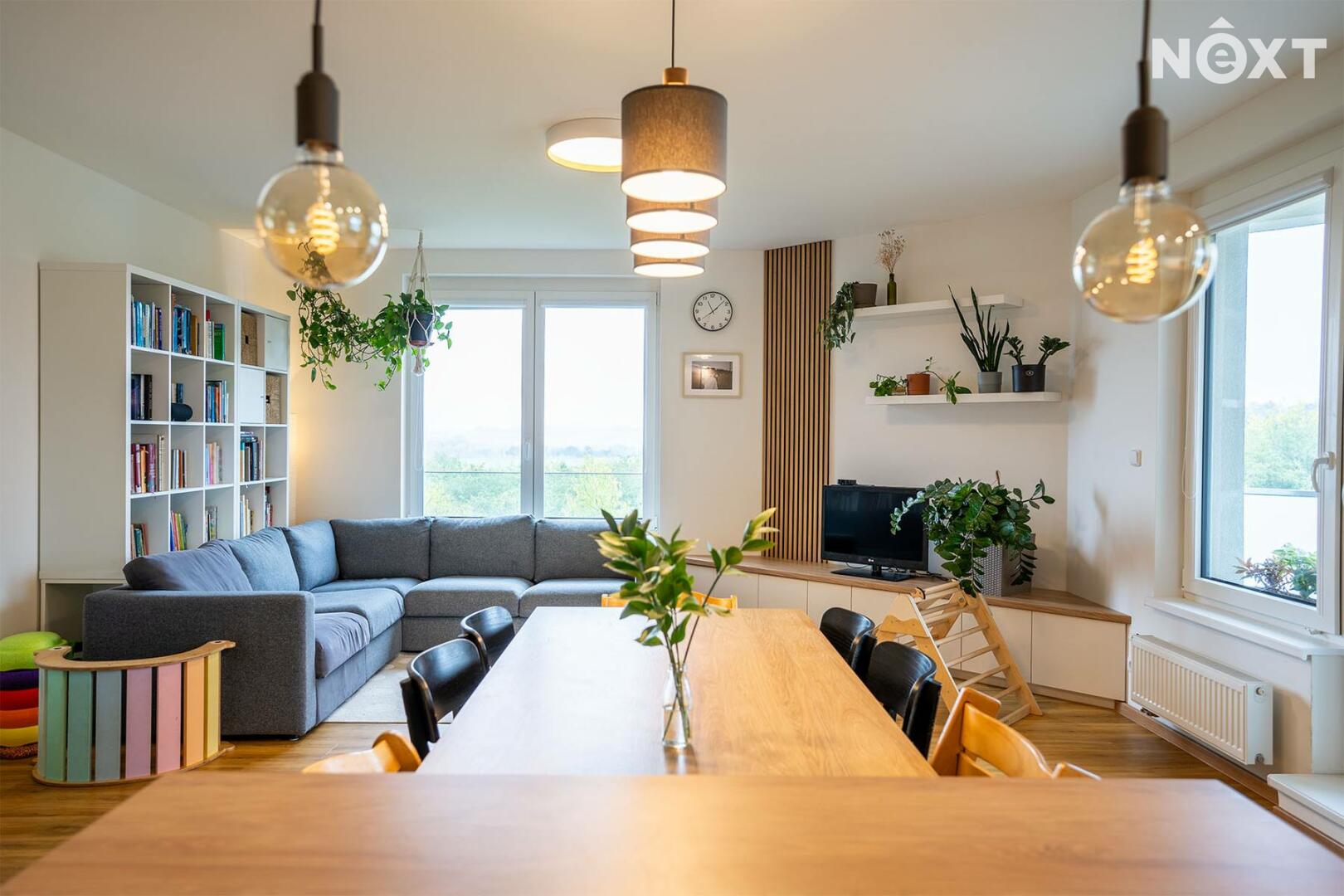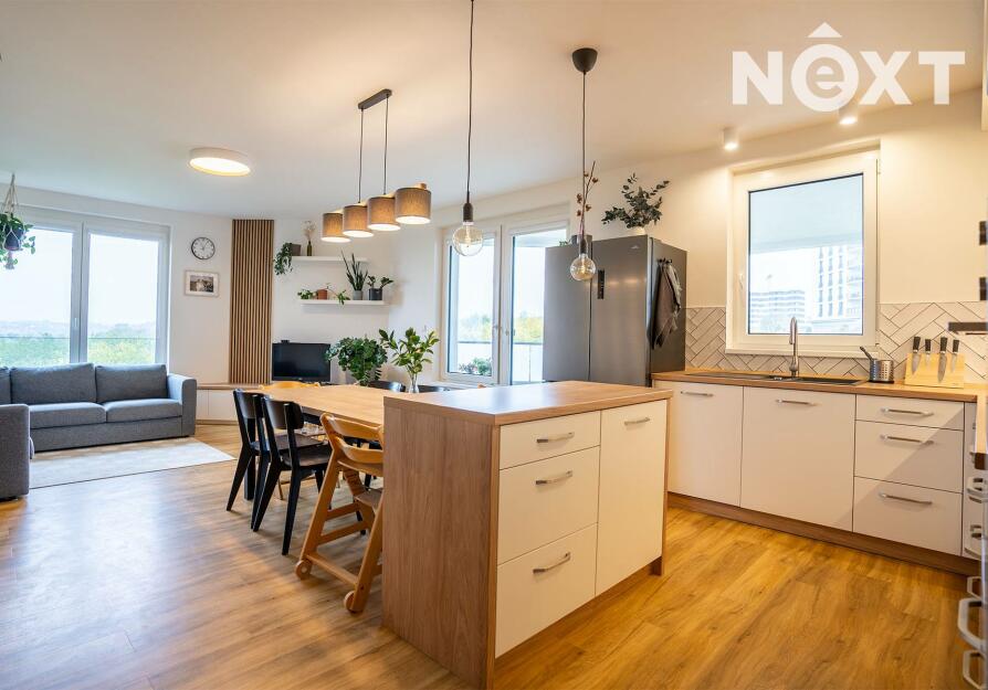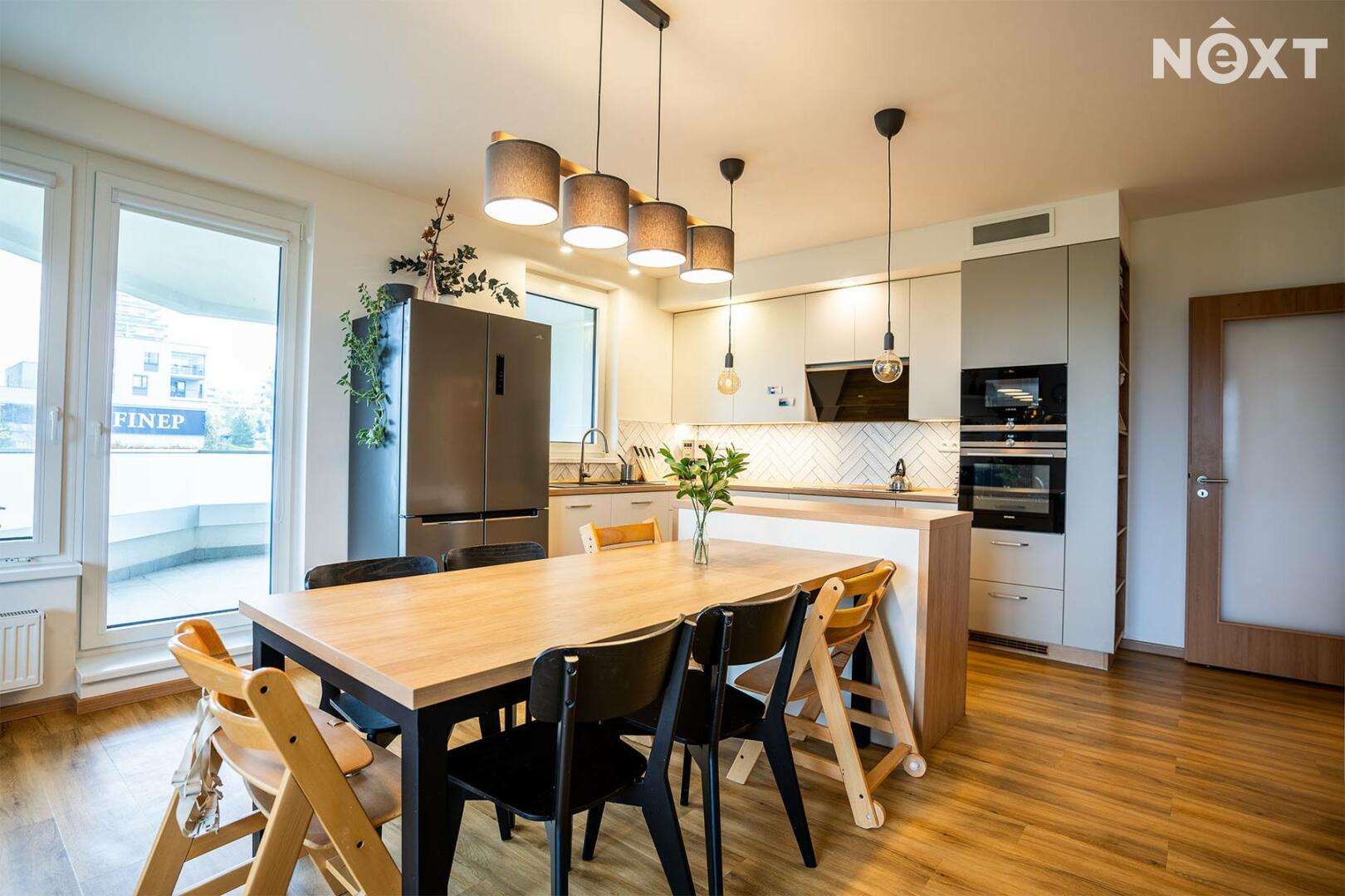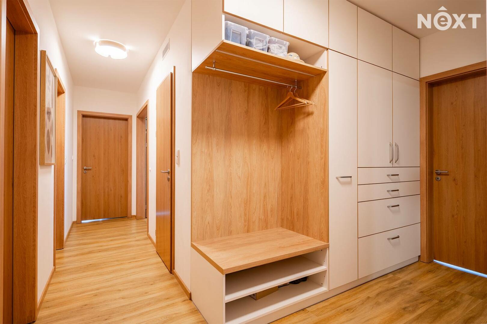 Dispozice bytu nabízí velkorysý obývací prostor s kuchyňským koutem a jídelní částí, tři samostatné ložnice, dvě koupelny (jedna en suite) a dvě toalety. V bytě se nachází také komora a šikovně řešené úložné prostory.