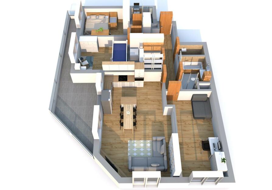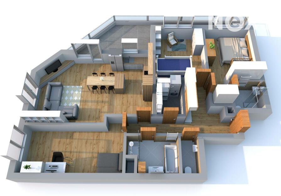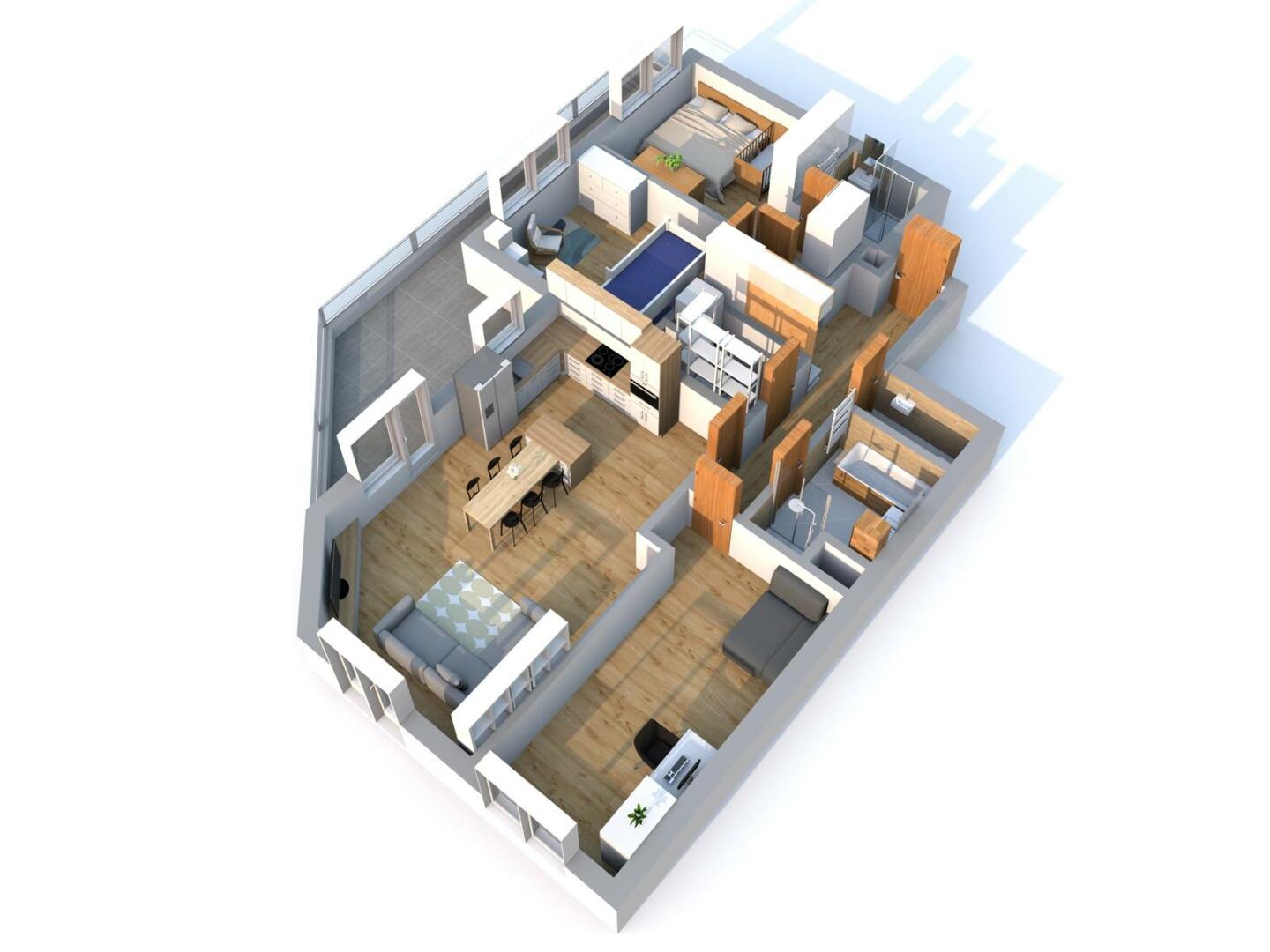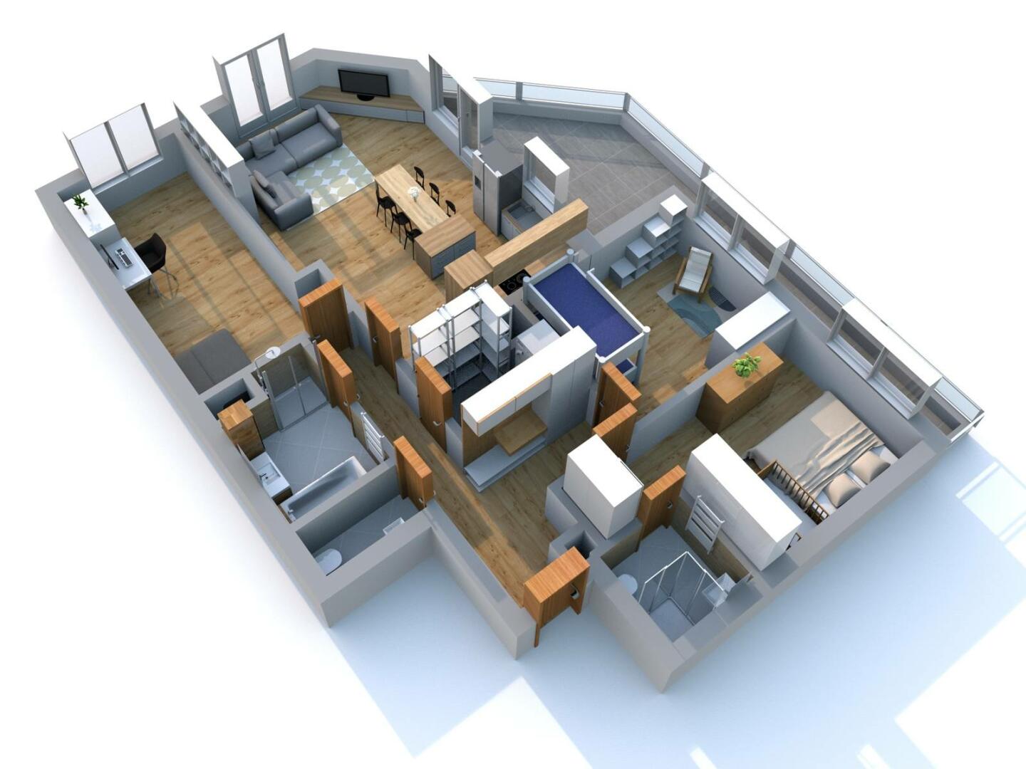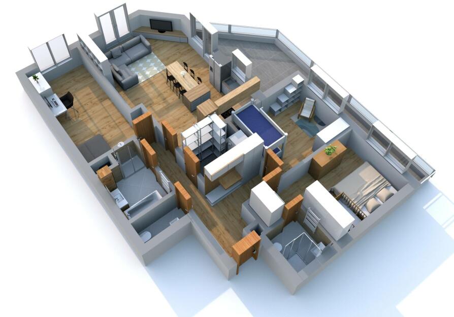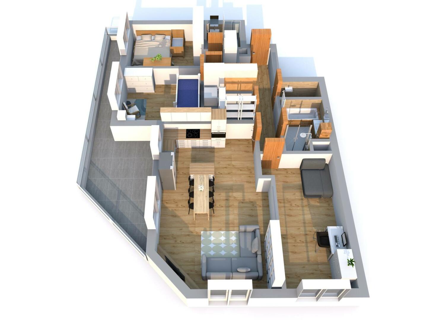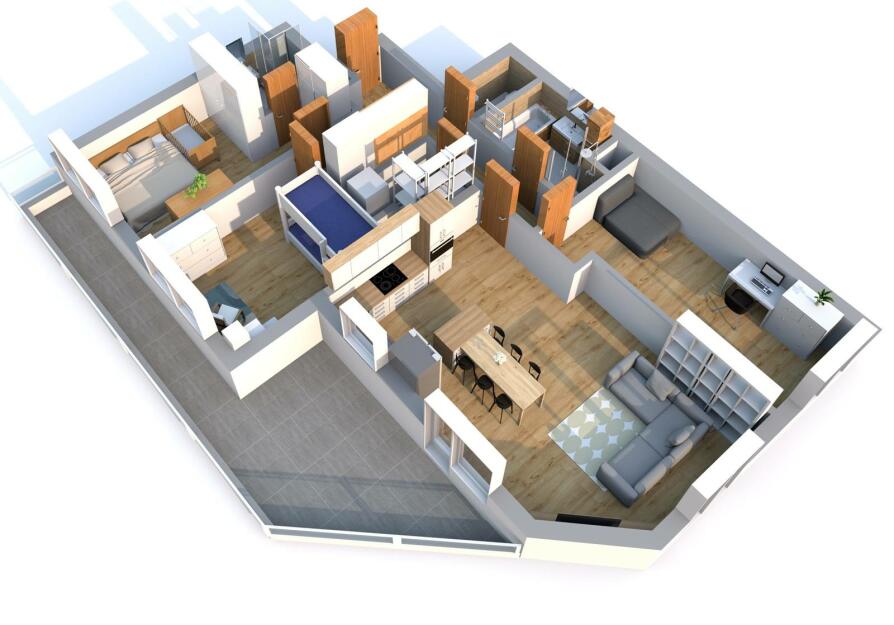 Dispozice bytu nabízí velkorysý obývací prostor s kuchyňským koutem a jídelní částí, tři samostatné ložnice, dvě koupelny (jedna en suite) a dvě toalety. V bytě se nachází také komora a šikovně řešené úložné prostory.