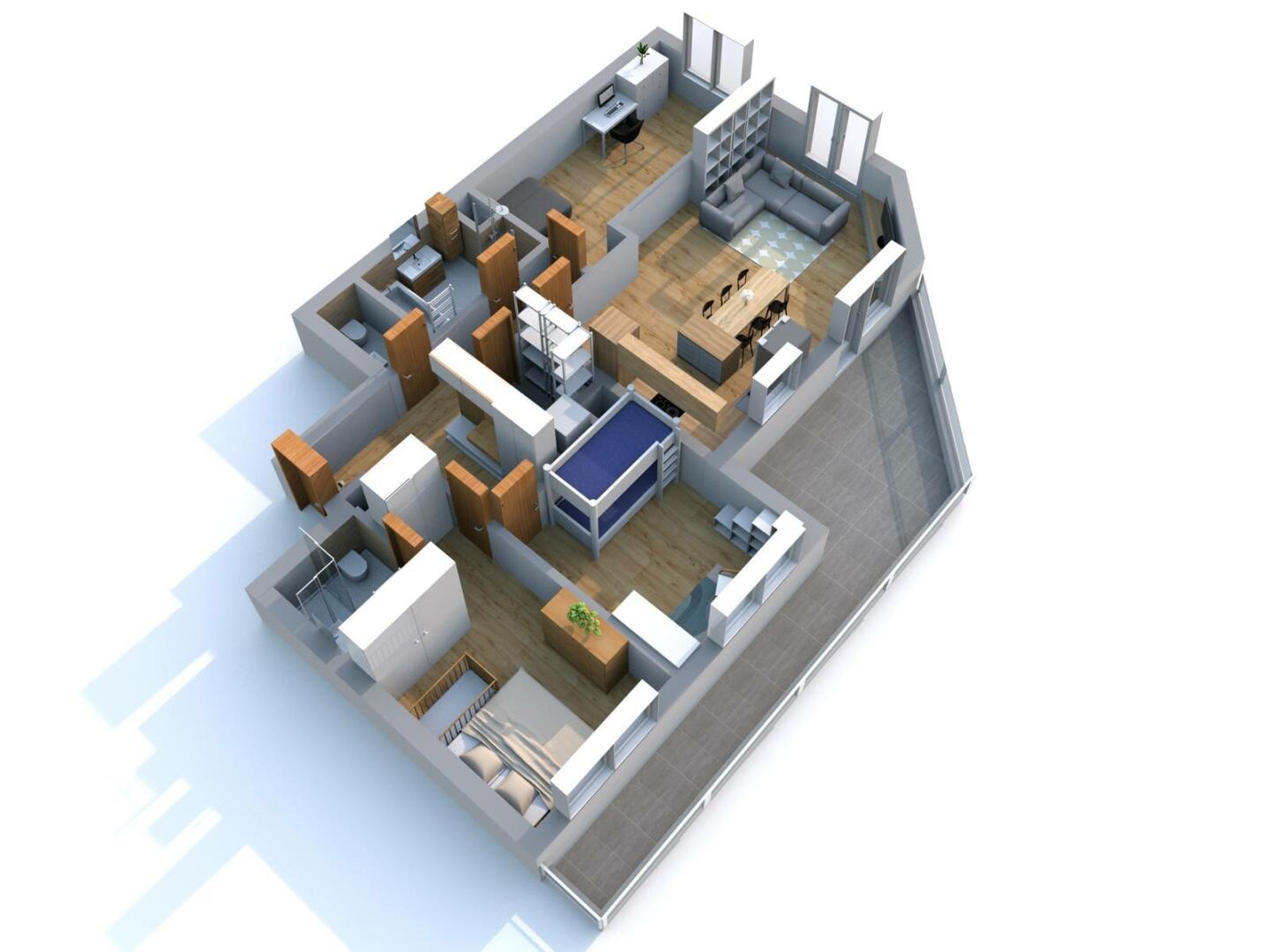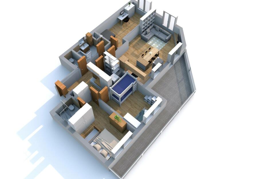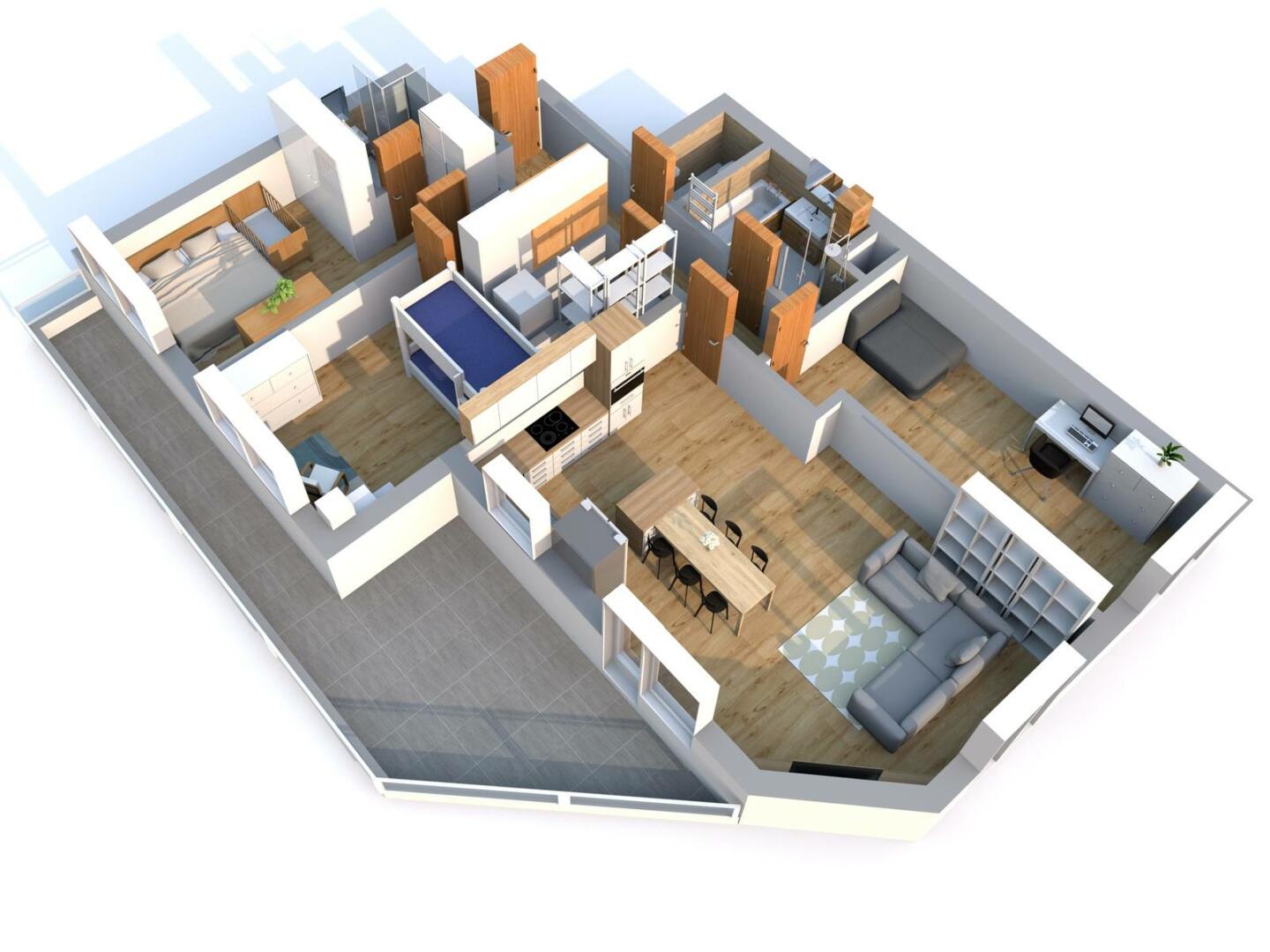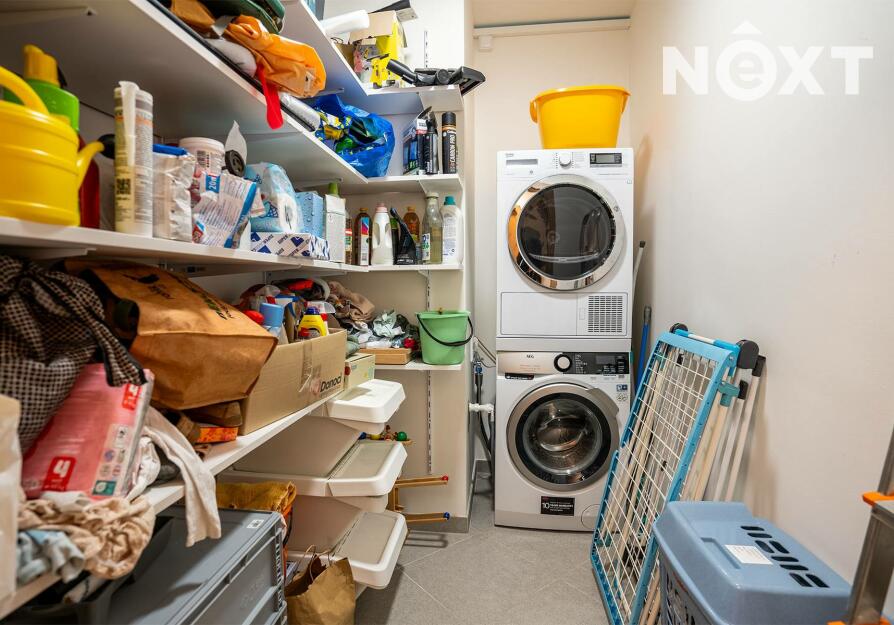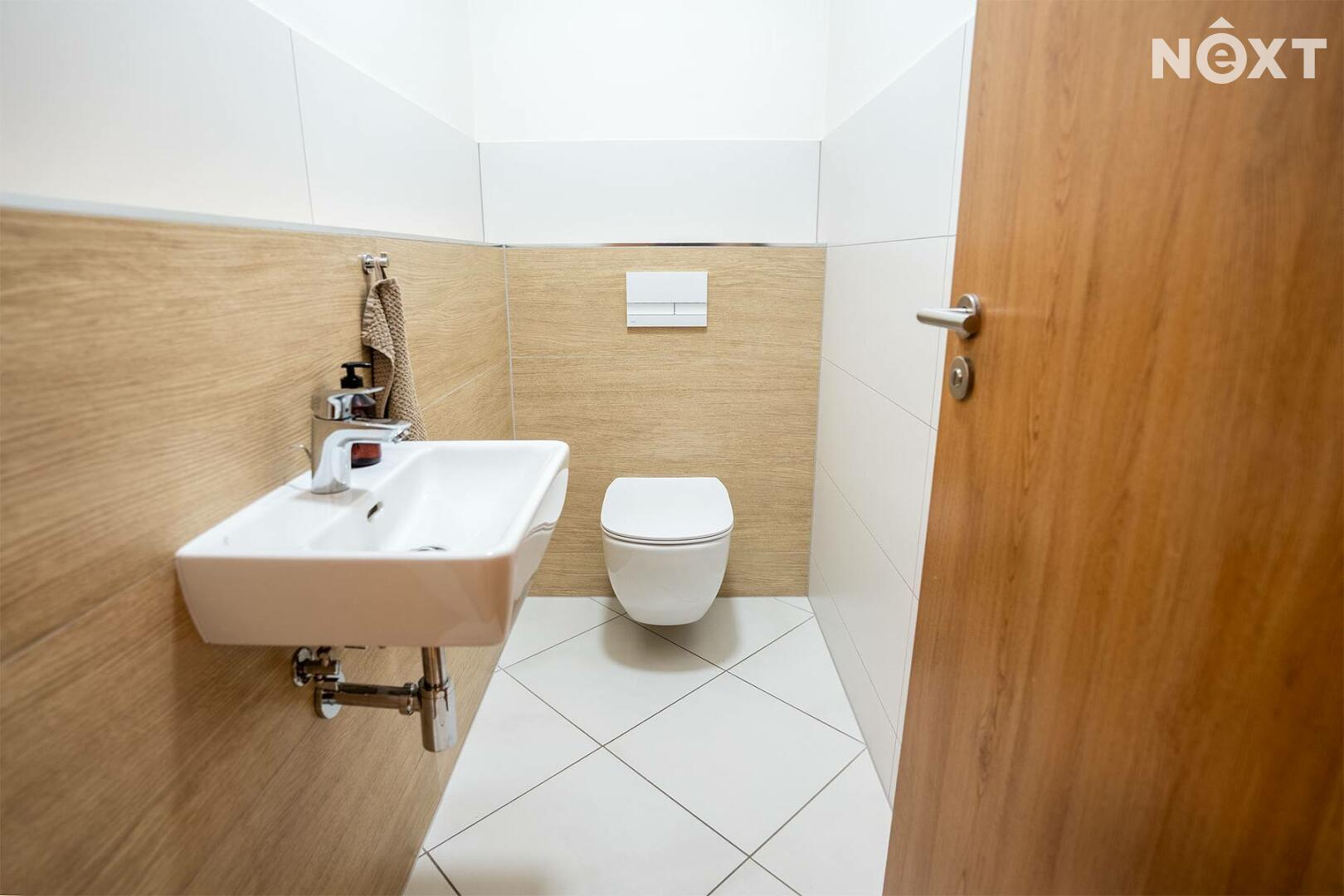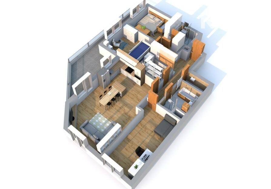 Dispozice bytu nabízí velkorysý obývací prostor s kuchyňským koutem a jídelní částí, tři samostatné ložnice, dvě koupelny (jedna en suite) a dvě toalety. V bytě se nachází také komora a šikovně řešené úložné prostory.