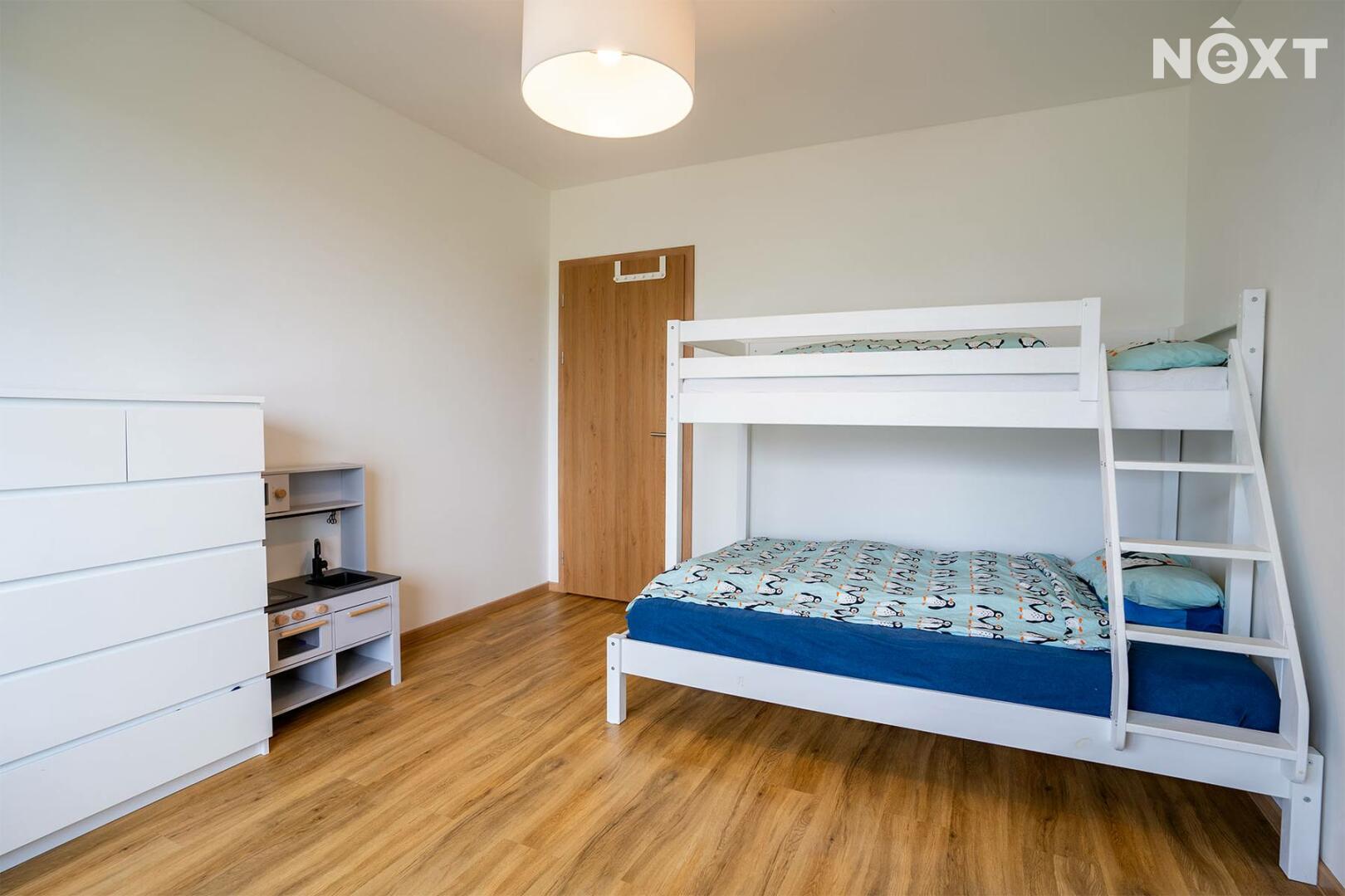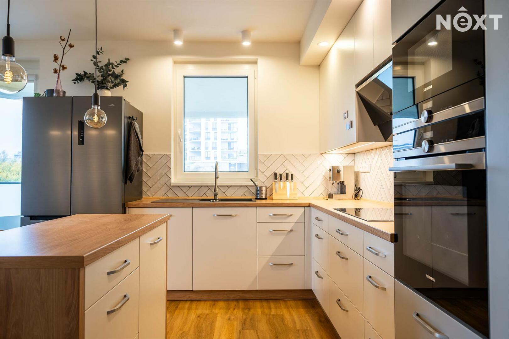 Byt se prodává částečně vybavený – zůstává moderní kuchyňská linka s ostrůvkem a vestavnými spotřebiči (myčka, trouba, mikrovlnná trouba, varná deska, digestoř), vestavné skříně v ložnici i předsíni, koupelnový nábytek, lavice na míru v obývacím pokoji, police na květiny a potravinová skříň v kuchyni.