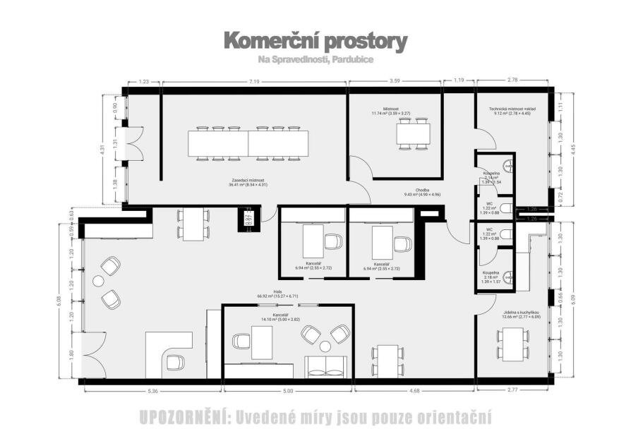 Dispozice - Vstup do komerčních prostor skrze recepci, na který navazují čtyři samostatné kanceláře a zasedací místnost se samostatným vstupem. V zadní části komerčních prostor je zázemí pro kanceláře - toalety, dětský koutek, kuchyňka s jídelnou, skladovací prostory - technická místnost, Součástí pronájmu 3x garážové stání v budově.