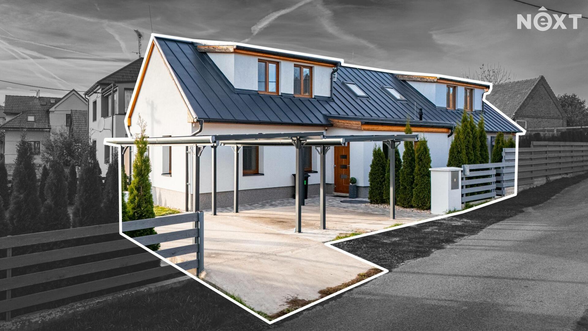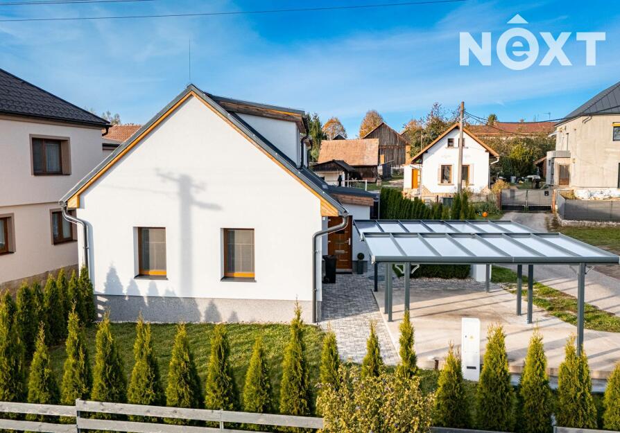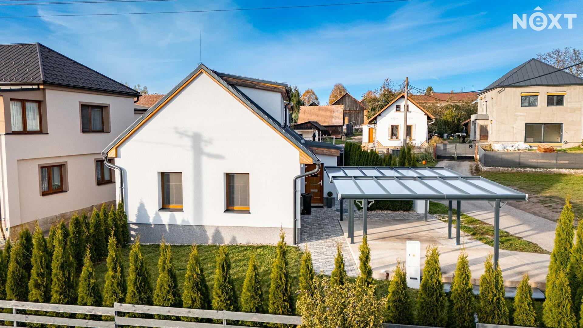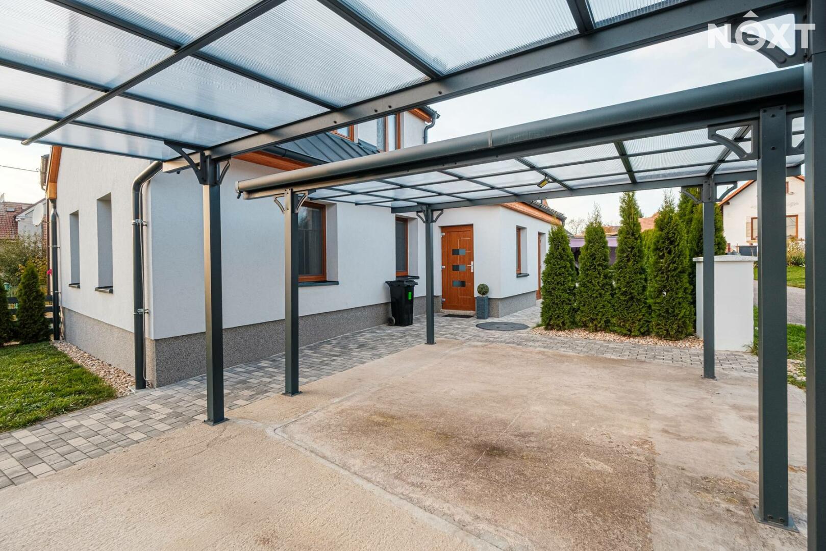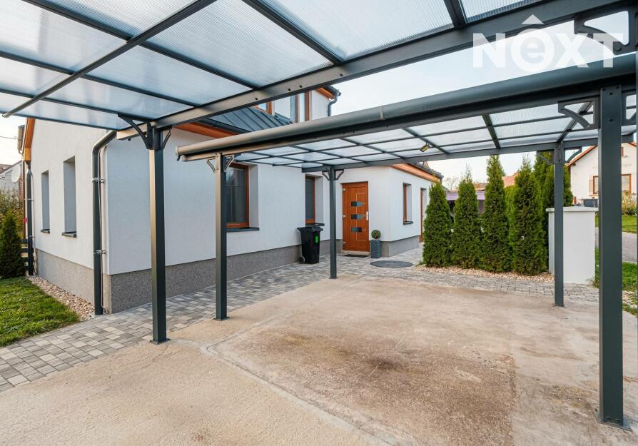 U domu zastřešené stání pro dvě auta. Pergola pro příjemné posezení venku. Pozemek kompletně oplocen.