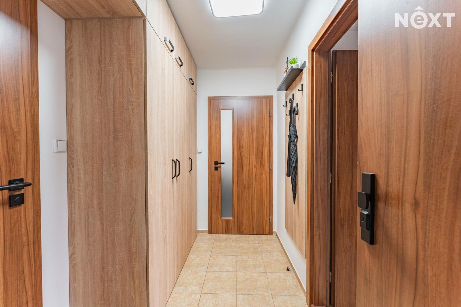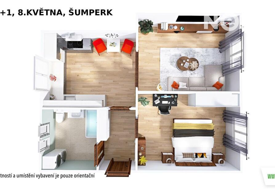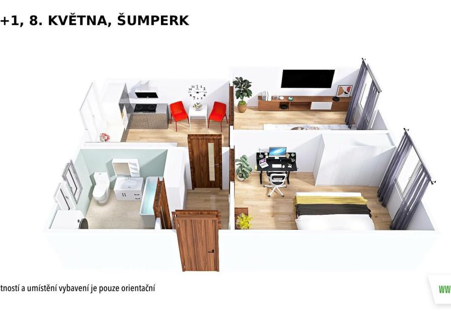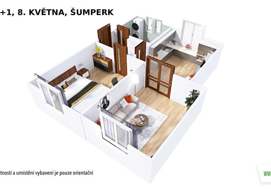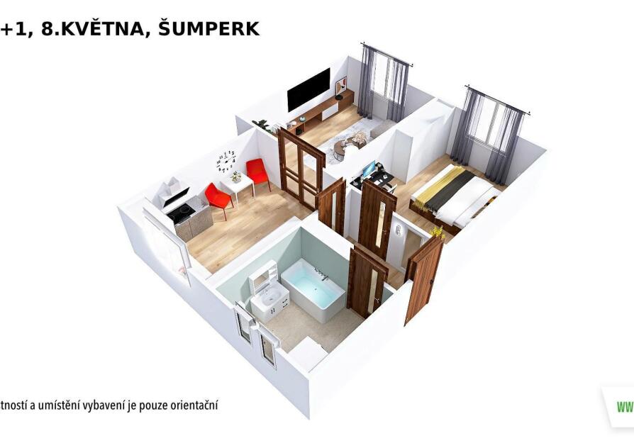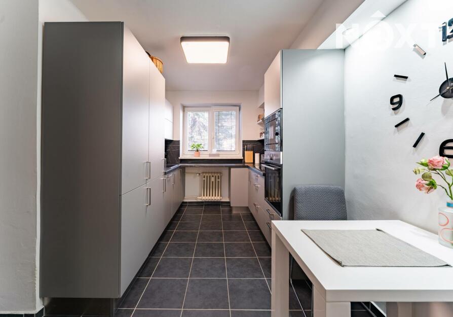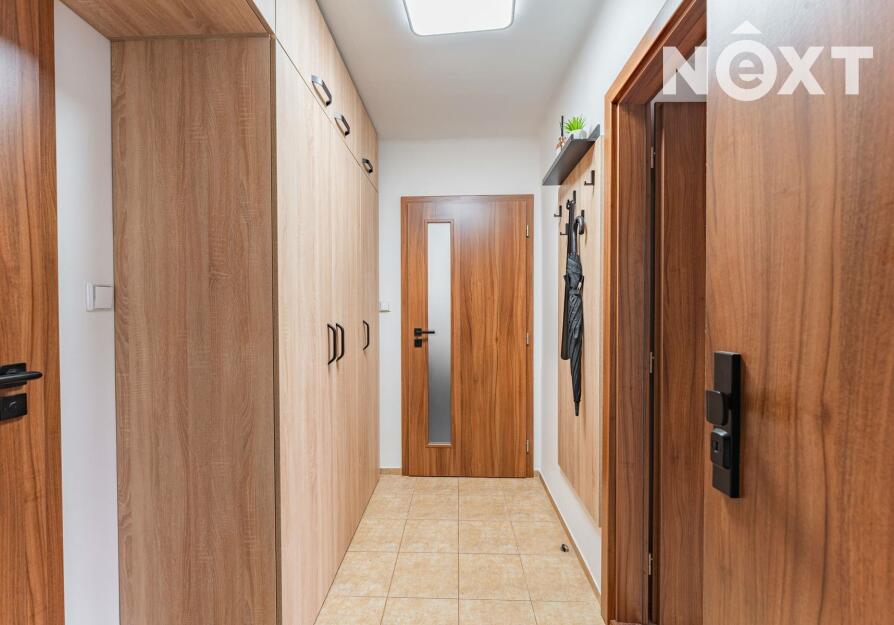 Dispozice bytu je praktická a promyšlená. Z prostorné chodby, ve které se nacházejí vestavěné skříně poskytující dostatek úložného prostoru, se vstupuje do ložnice a kuchyně. Z kuchyně je následně vstup do obývacího pokoje, který nabízí příjemné místo pro odpočinek. Kuchyň je vybavena moderní kuchyňskou linkou a spotřebiči, ložnice je dostatečně prostorná pro manželskou postel i další nábytek.