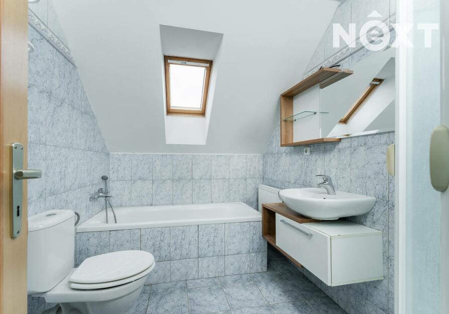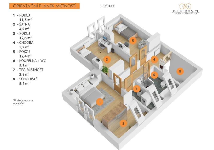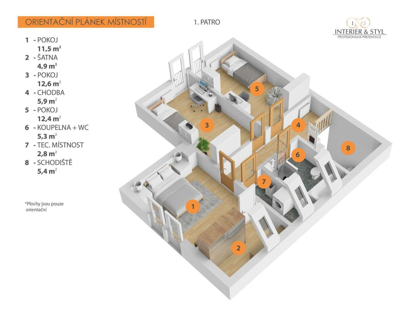 V prvním podlaží domu se nachází obývací pokoj s kuchyňským koutem a krbem, toaleta a technická místnost. Po schodech se dostáváme do druhého podlaží, kde na nás čeká ložnice s šatnou, dva dětské pokoje, koupelnu s vanou, sprchovým koutem, WC a komoru.
