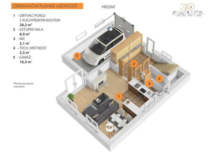 Dům má podlahovou plochu bez garáže cca 102m2 a garáž cca 16,5m2.