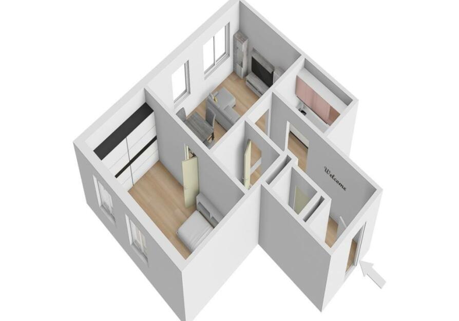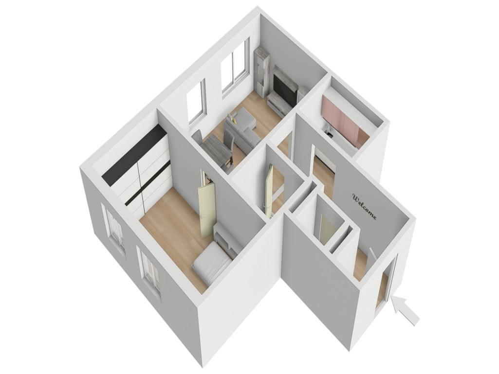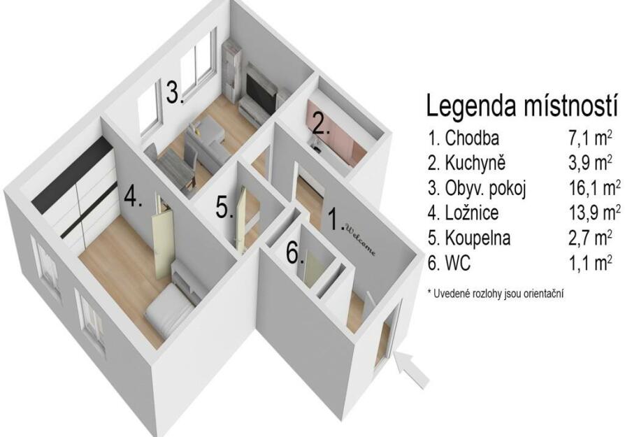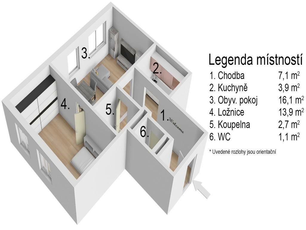 K dispozici je chodba (7,1 m2), kuchyňský kout (3,9 m2), obývací pokoj (16,1 m2), ložnice (13,9 m2),