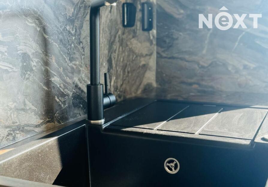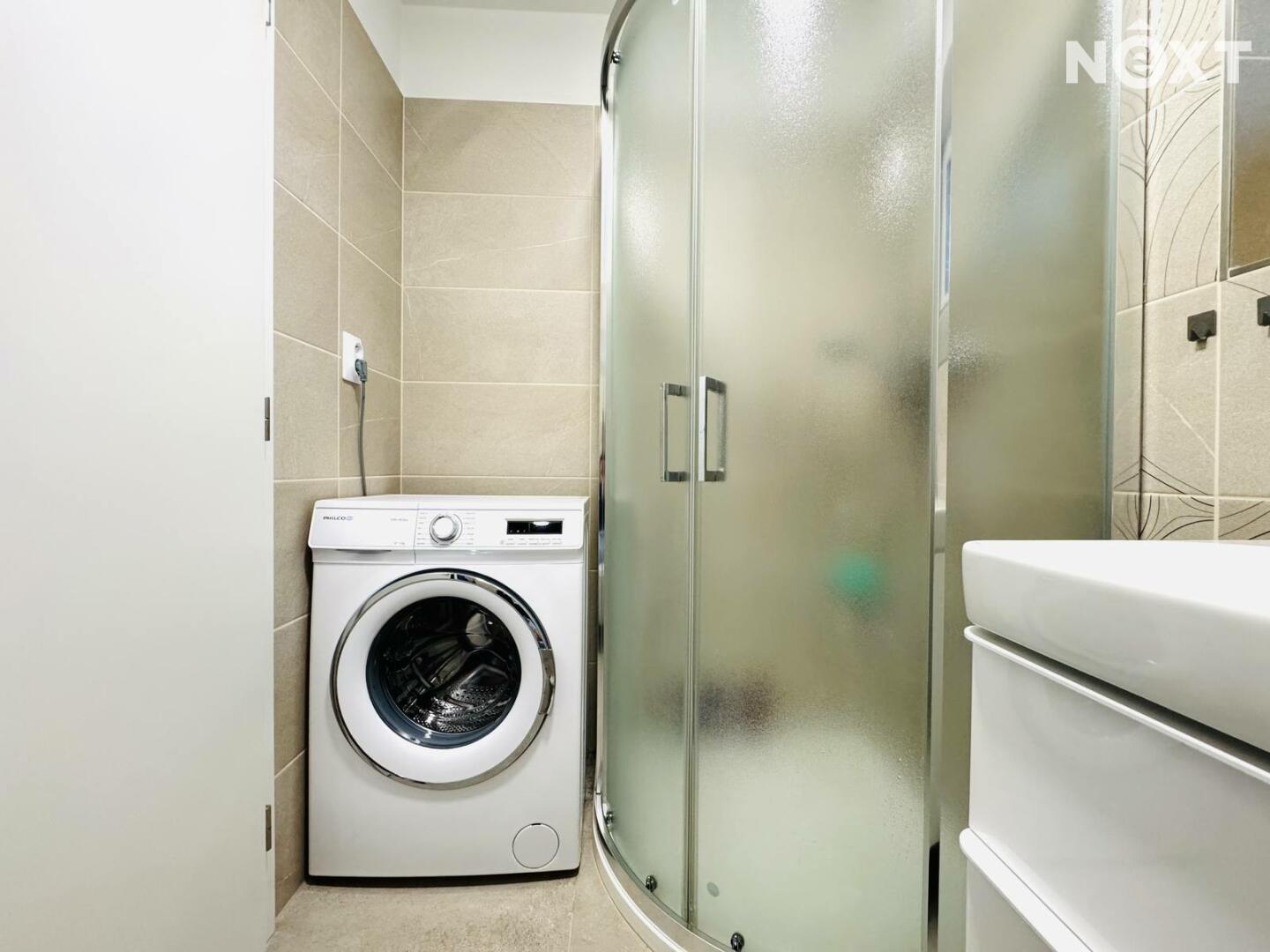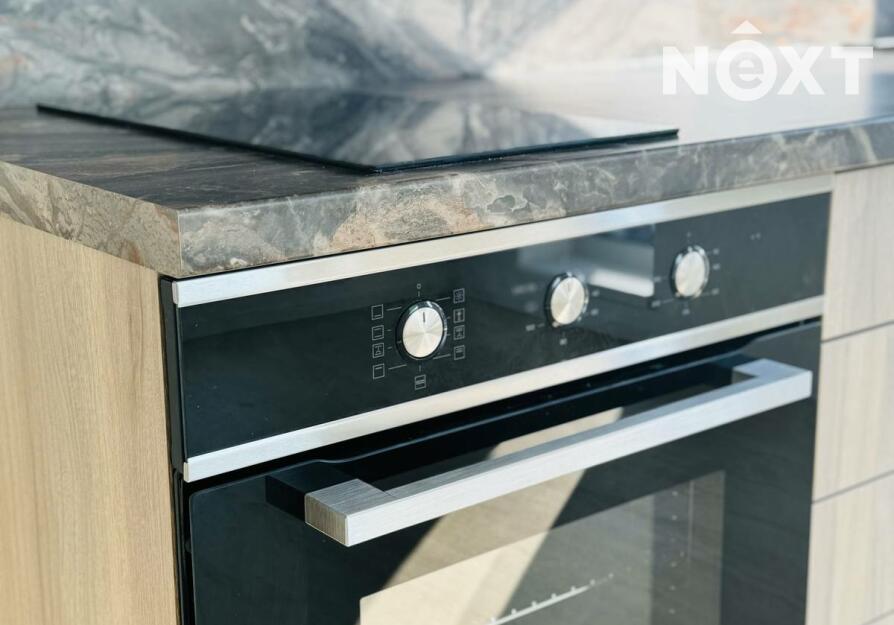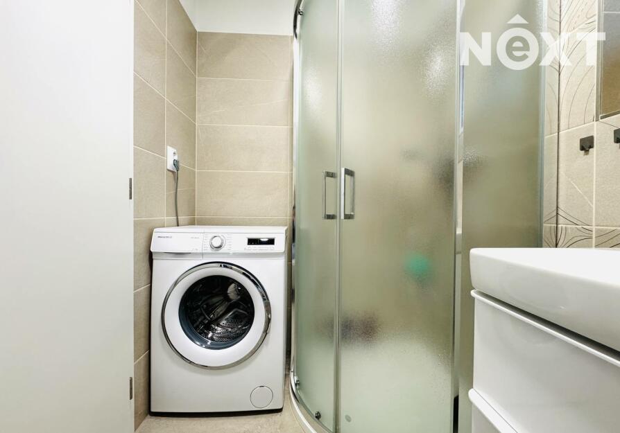 Byt vás přivítá promyšlenou dispozicí a čistým designem. Ze vstupní chodby o velikosti 2,3 m² se vstupuje do koupelny se sprchovým koutem, toaletou a pračkou o výměře 3,5 m². Hlavní obytný prostor s kuchyňským koutem o velikosti 16,5 m² působí vzdušně a svěže – kuchyňská linka je vybavena vestavěnými spotřebiči, lednicí, mikrovlnnou troubou i elegantním černým dřezem.