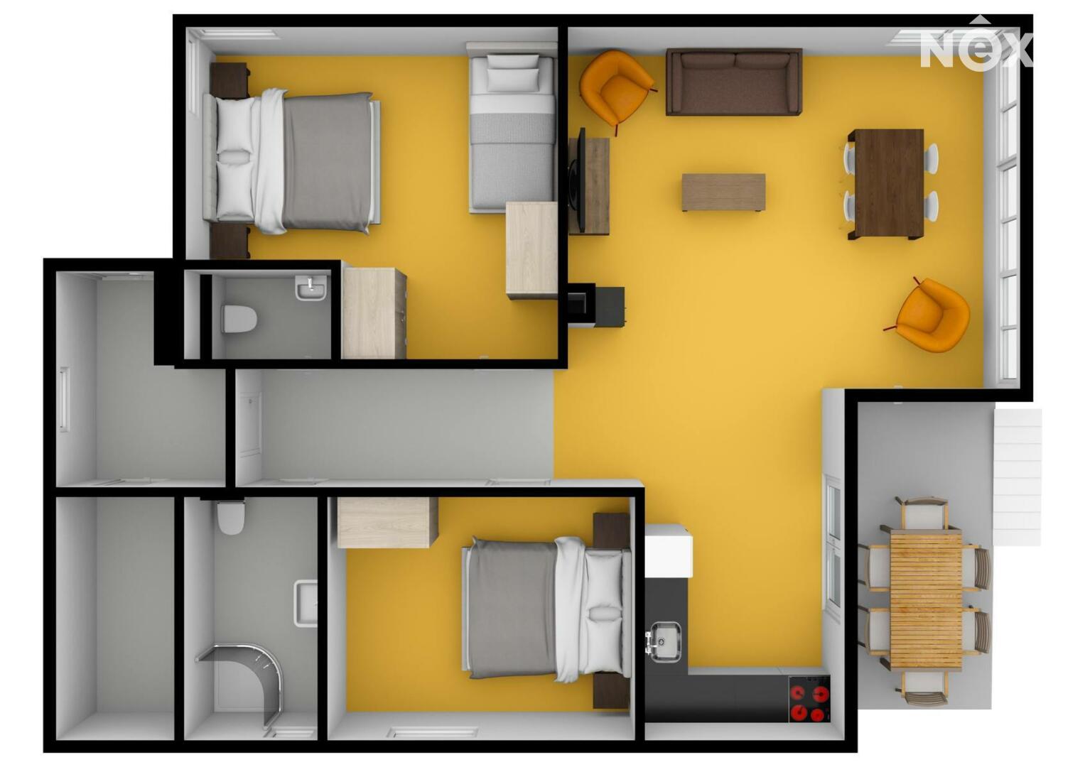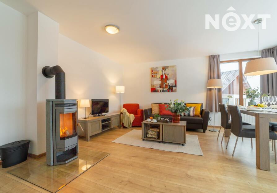 Chodba vás provede k dvěma útulným ložnicím, koupelně se sprchovým koutem a dvěma toaletám. A pak… přichází srdce domova. Prostorný obývací pokoj se stylovou kuchyní, plně vybavenou spotřebiči, jídelním koutem a ikonickým výhledem na jezero Lipno. Krbová kamna přinesou teplo, které není jen teplem – je to atmosféra, kterou znáte z chalup svých snů.