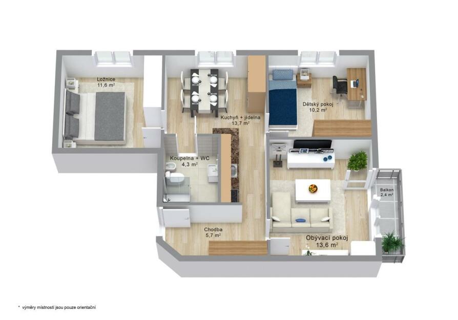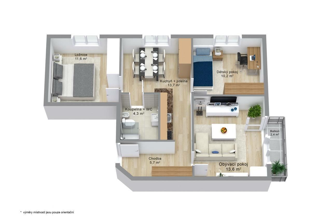 Byt je umístěn ve 2. nadzemním podlaží revitalizovaného panelového domu s euro-výtahem, s užitnou plochou 60 m2 a celkovou výměrou 63 m2 (včetně balkónu a lodžie) a nabízí tak dostatek prostoru pro rodinný život.