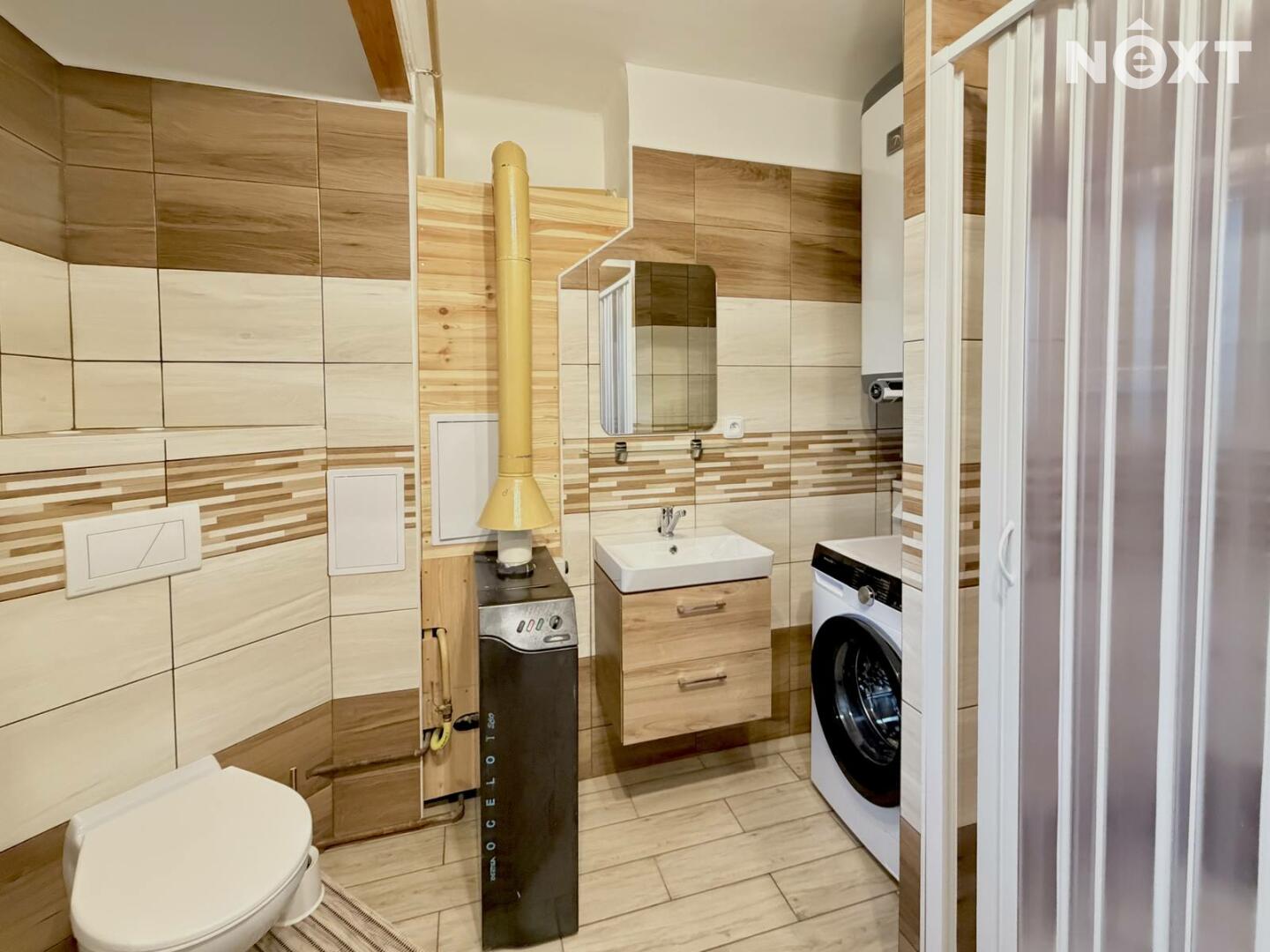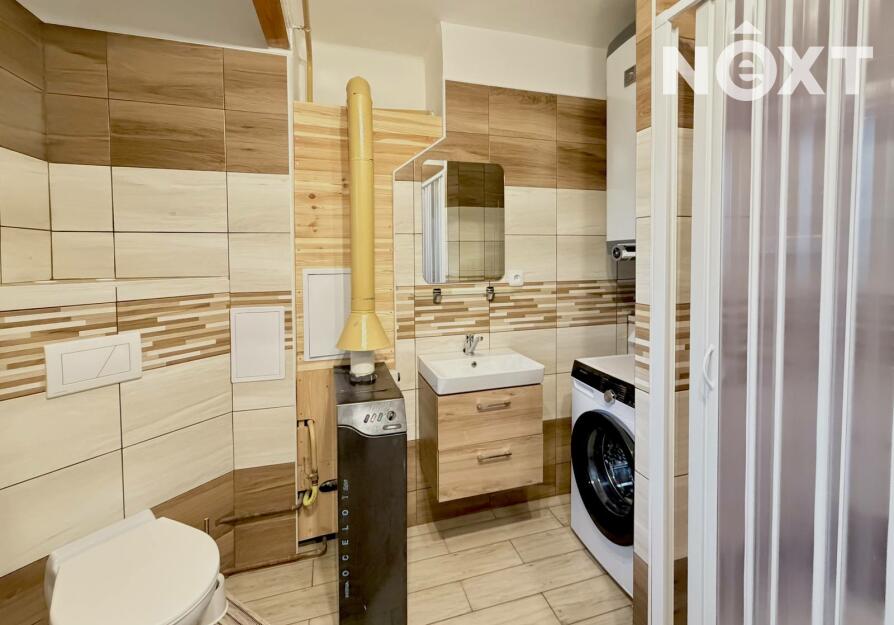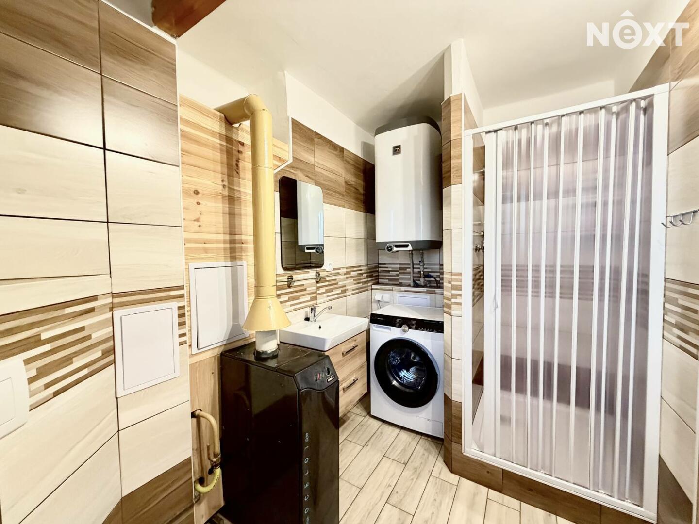 V prostorné vstupní chodbě se vlevo nachází koupelna se sprchovým koutem a toaletou, ohřev vody a vytápění zajišťuje plynový kotel.