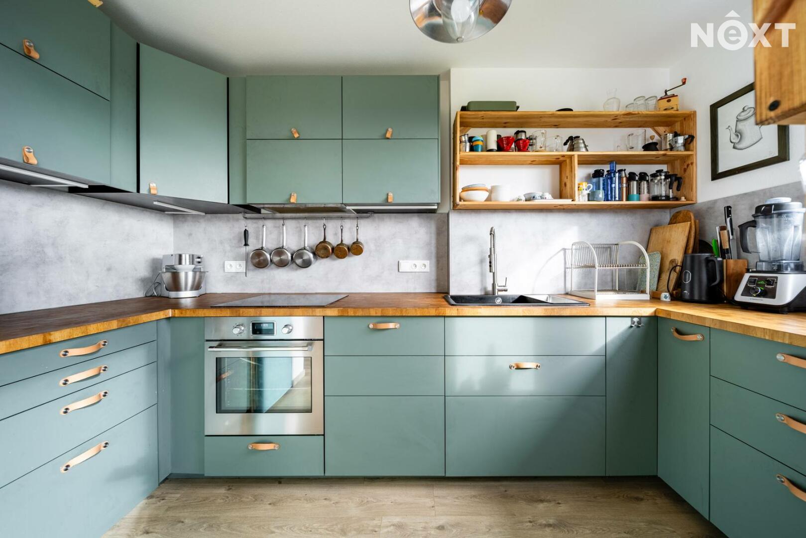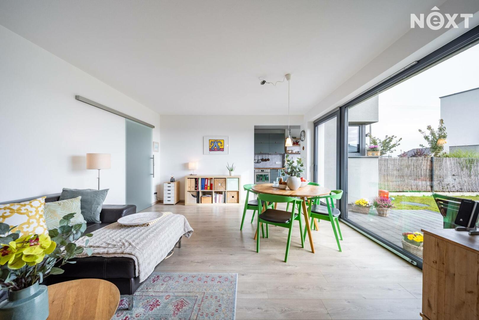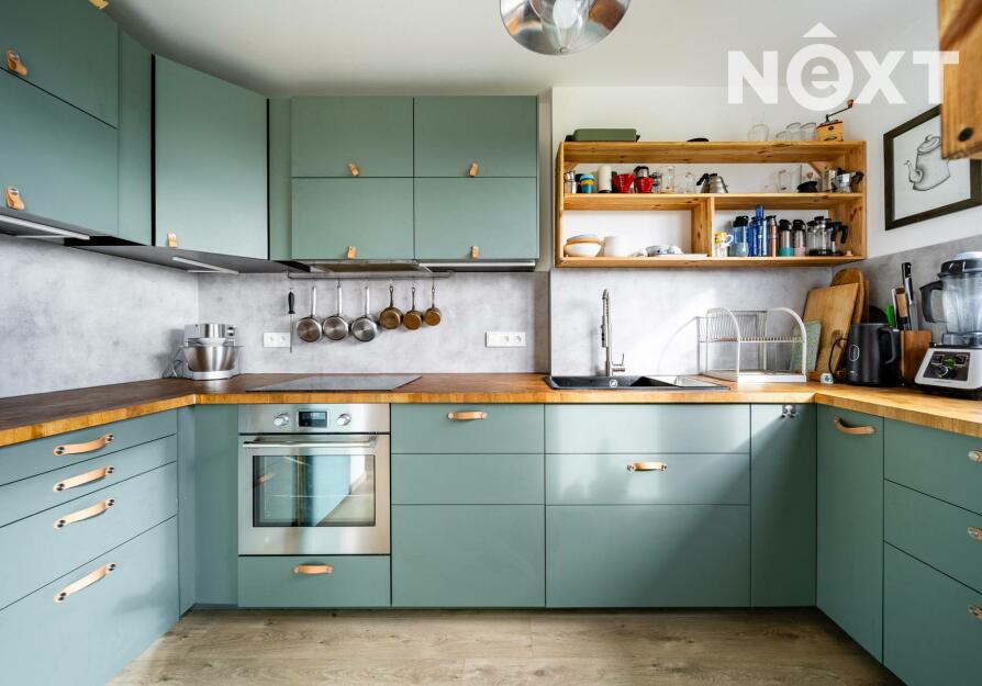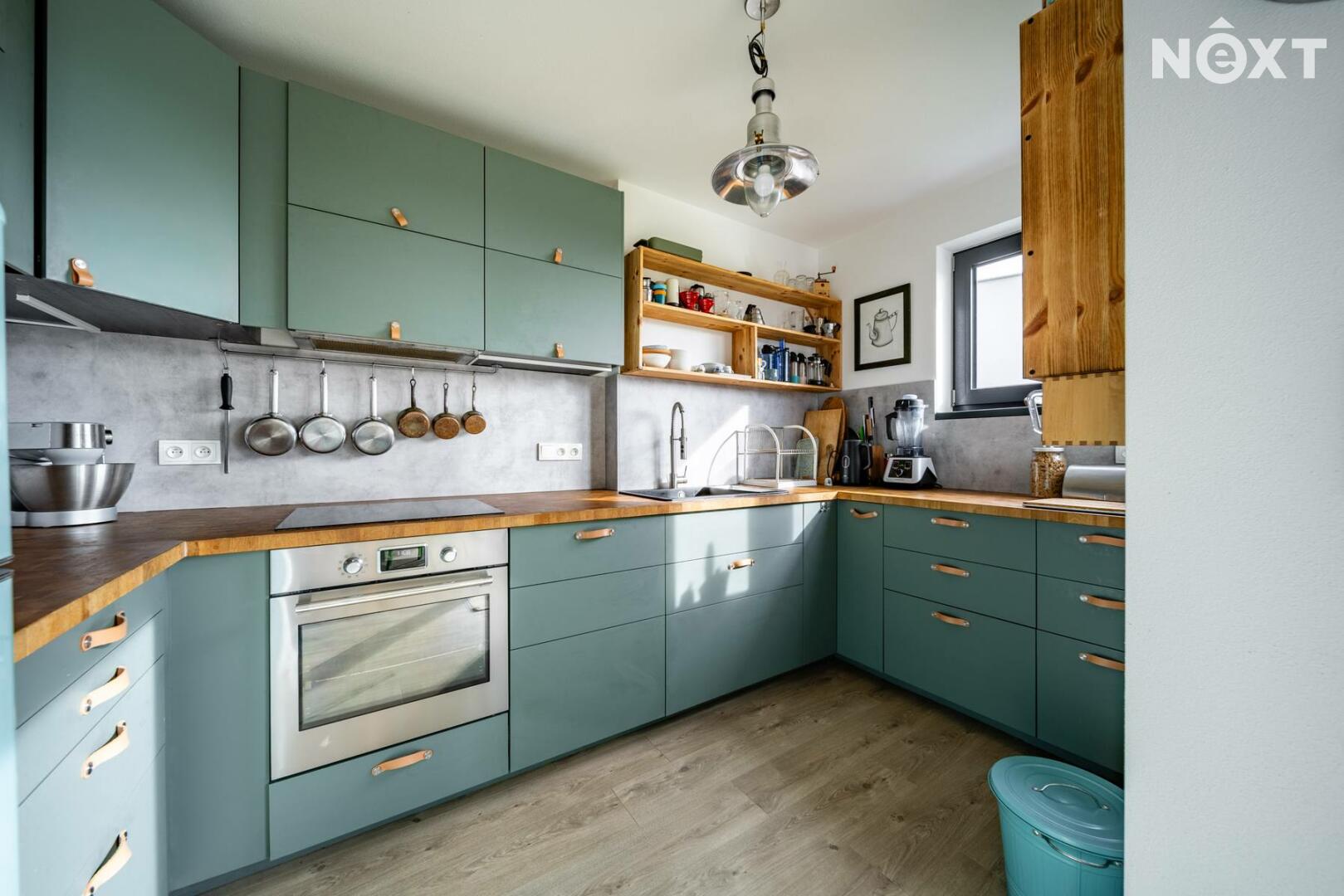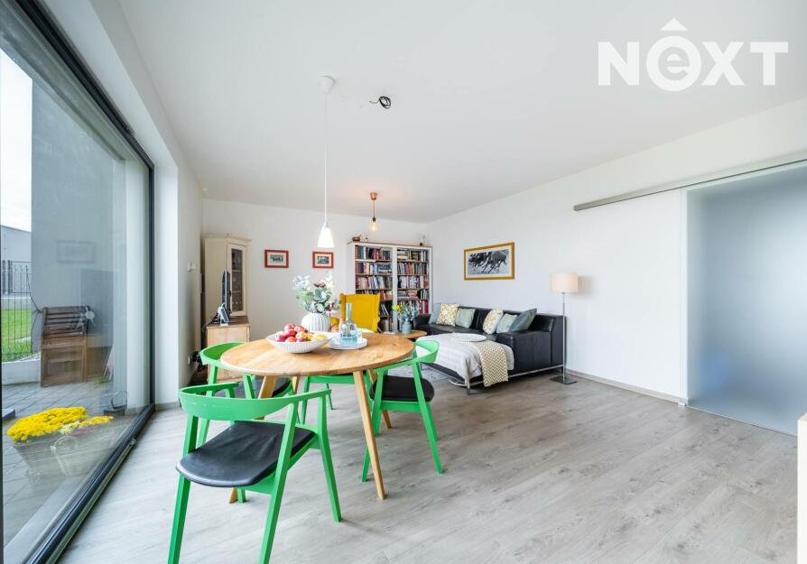 Při příjezdu k domu vás zaujmou dvě krytá parkovací stání o velikosti 23,5 m² a praktický venkovní sklad o 6,99 m², ideální na kola nebo sportovní vybavení. Vstupní hala o 8,79 m² navazuje na světlý obývací pokoj s kuchyňským koutem o 34,25 m², který je srdcem celého domu. Kuchyně je výrazným designovým prvkem – masivní dřevo, kožené úchytky, ručně působící detaily a mimořádně příjemná barevnost tvoří prostor, který působí domácky a zároveň moderně. Z obývací části vedou velké prosklené dveře na terasu o 8,23 m² a na zahradu, které díky své orientaci přivádějí do interiéru dostatek denního světla po celý den.