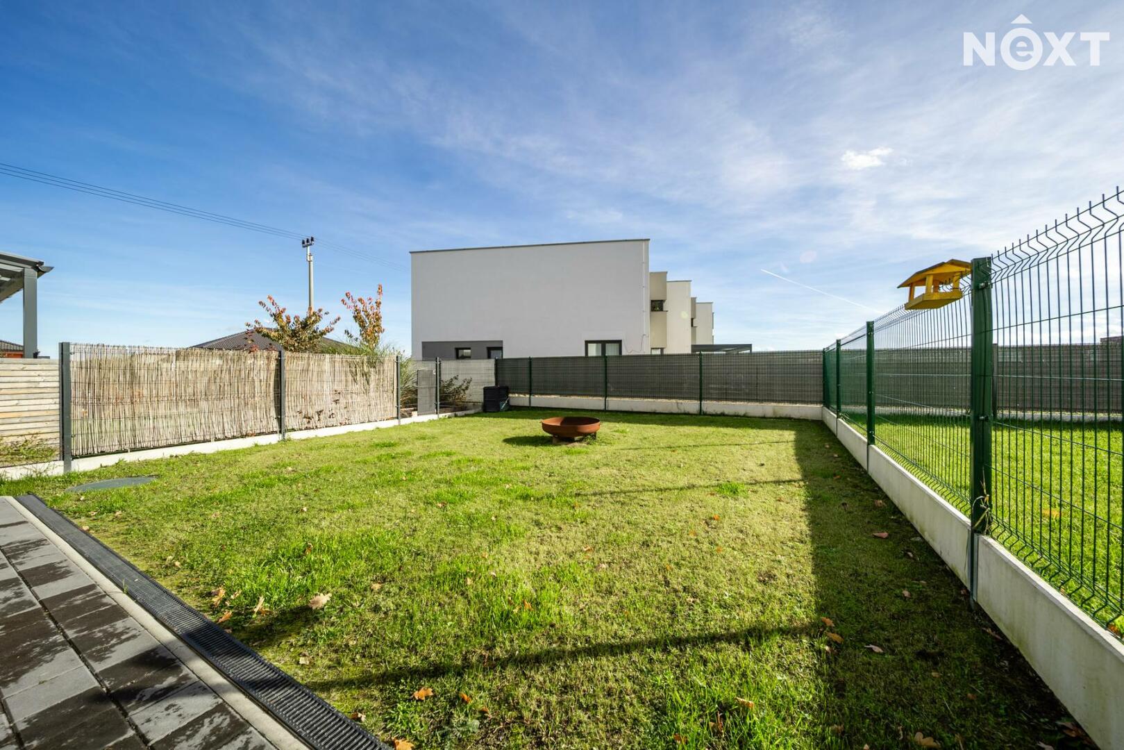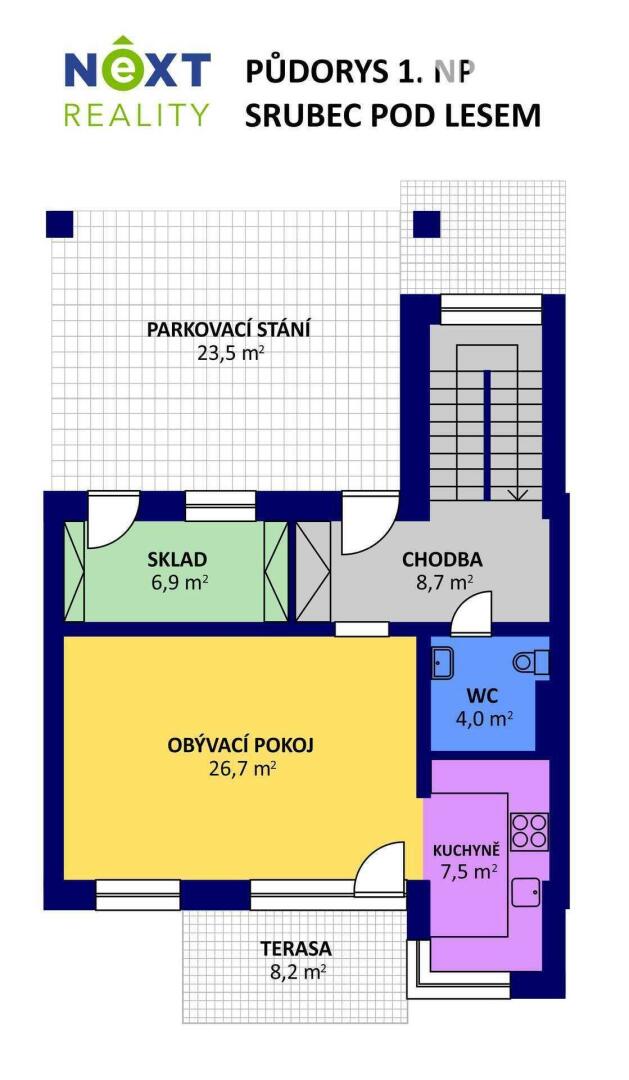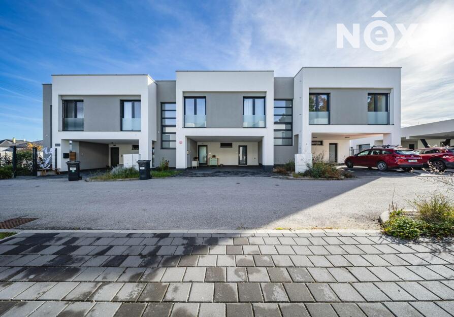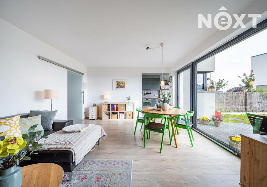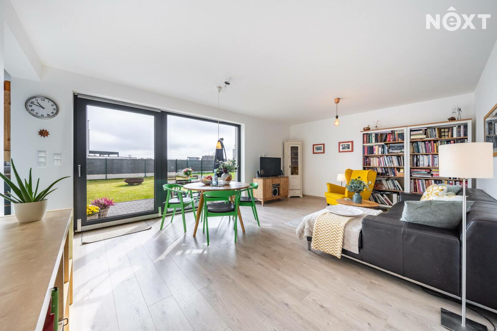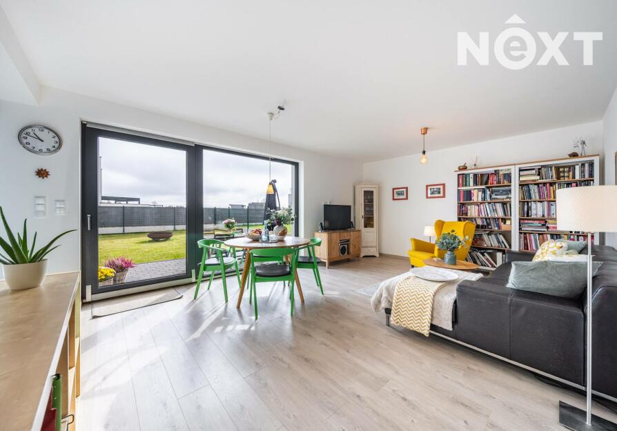 Při příjezdu k domu vás zaujmou dvě krytá parkovací stání o velikosti 23,5 m² a praktický venkovní sklad o 6,99 m², ideální na kola nebo sportovní vybavení. Vstupní hala o 8,79 m² navazuje na světlý obývací pokoj s kuchyňským koutem o 34,25 m², který je srdcem celého domu. Kuchyně je výrazným designovým prvkem – masivní dřevo, kožené úchytky, ručně působící detaily a mimořádně příjemná barevnost tvoří prostor, který působí domácky a zároveň moderně. Z obývací části vedou velké prosklené dveře na terasu o 8,23 m² a na zahradu, které díky své orientaci přivádějí do interiéru dostatek denního světla po celý den.