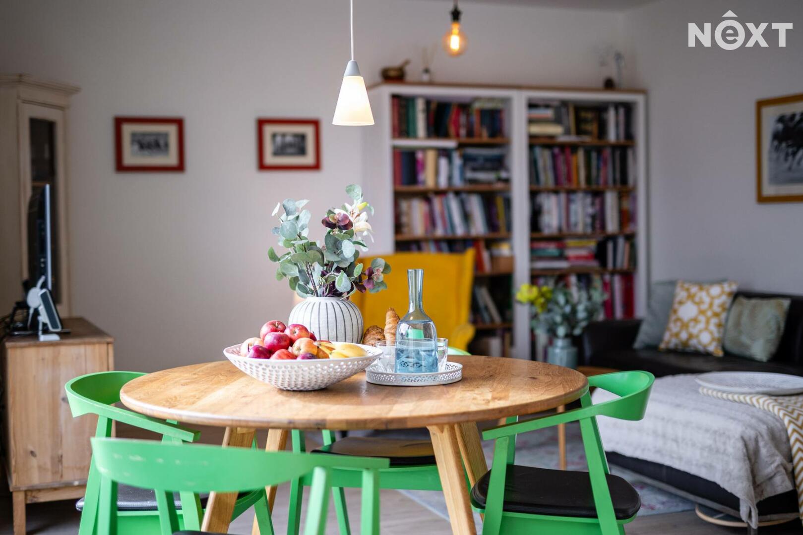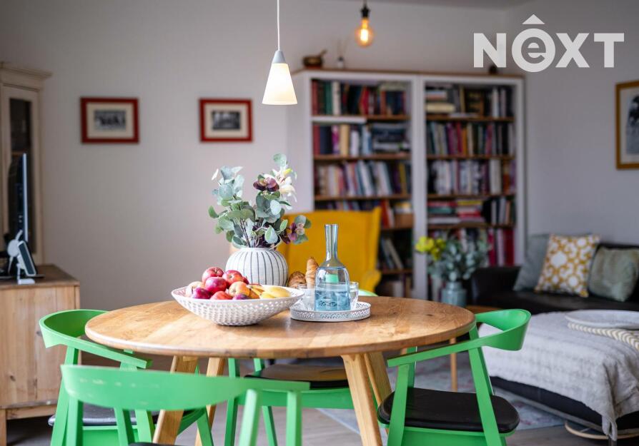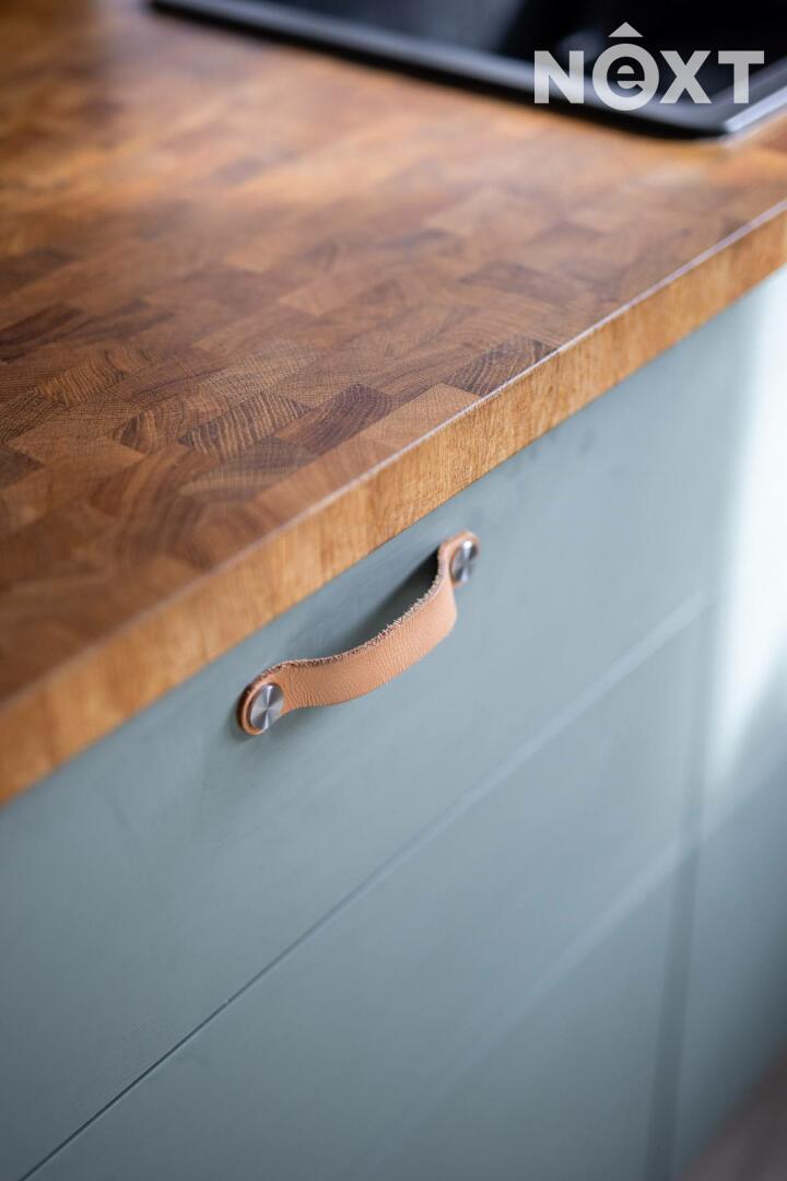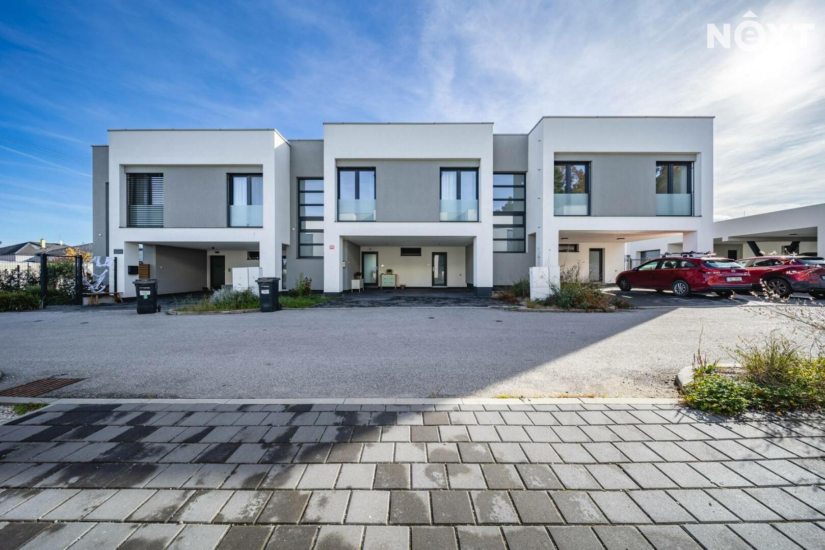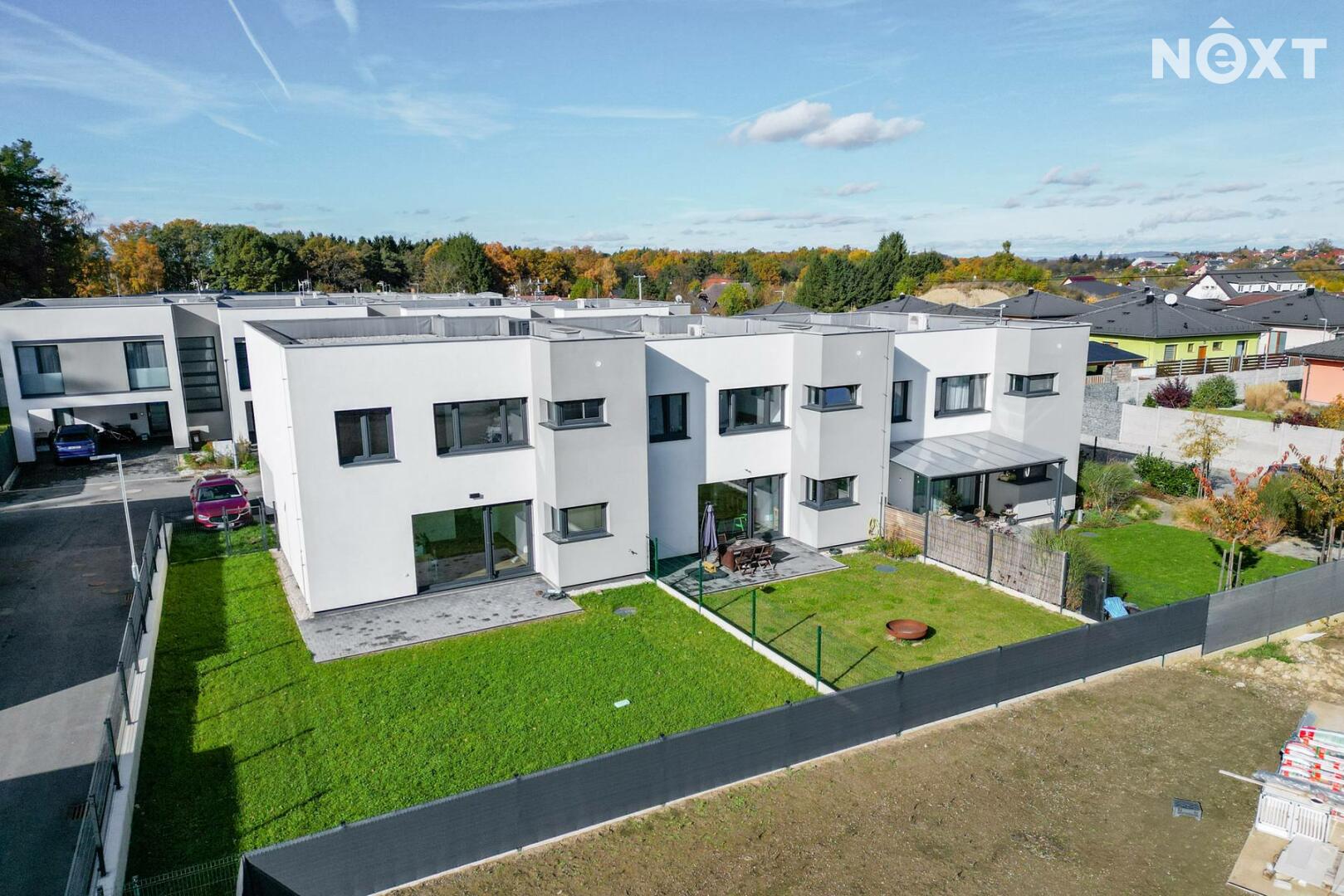 Při příjezdu k domu vás zaujmou dvě krytá parkovací stání o velikosti 23,5 m² a praktický venkovní sklad o 6,99 m², ideální na kola nebo sportovní vybavení. Vstupní hala o 8,79 m² navazuje na světlý obývací pokoj s kuchyňským koutem o 34,25 m², který je srdcem celého domu. Kuchyně je výrazným designovým prvkem – masivní dřevo, kožené úchytky, ručně působící detaily a mimořádně příjemná barevnost tvoří prostor, který působí domácky a zároveň moderně. Z obývací části vedou velké prosklené dveře na terasu o 8,23 m² a na zahradu, které díky své orientaci přivádějí do interiéru dostatek denního světla po celý den.