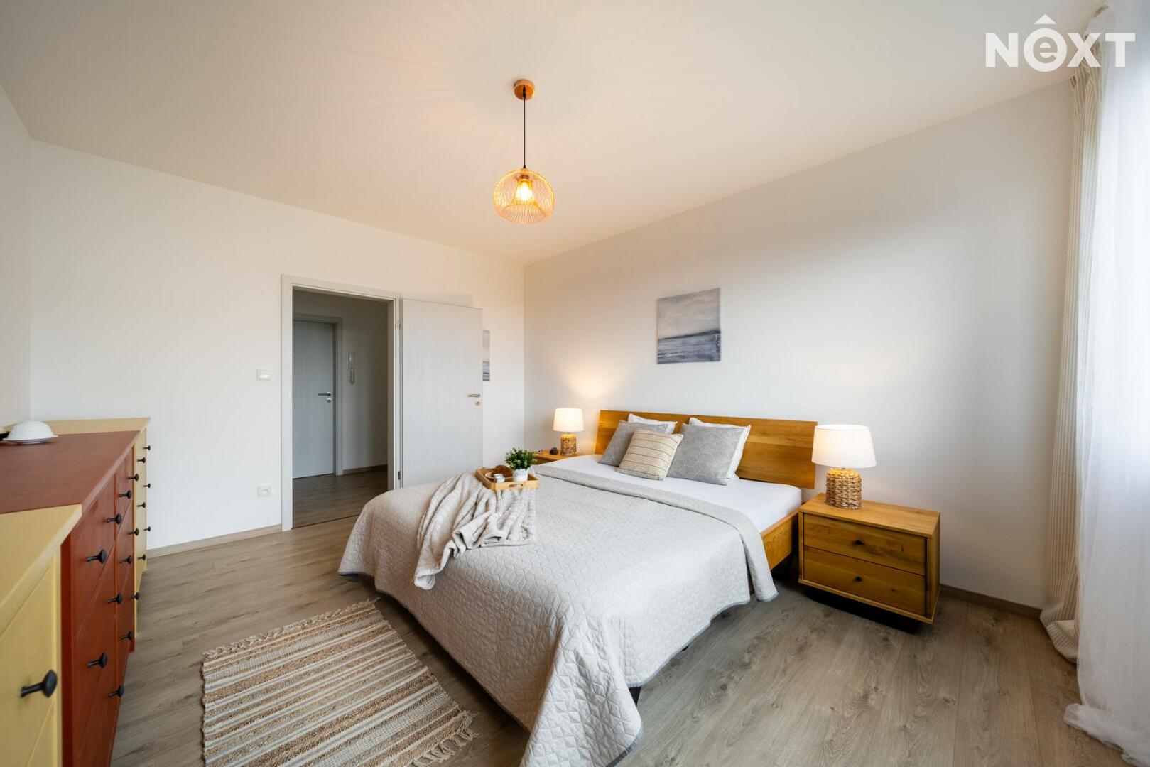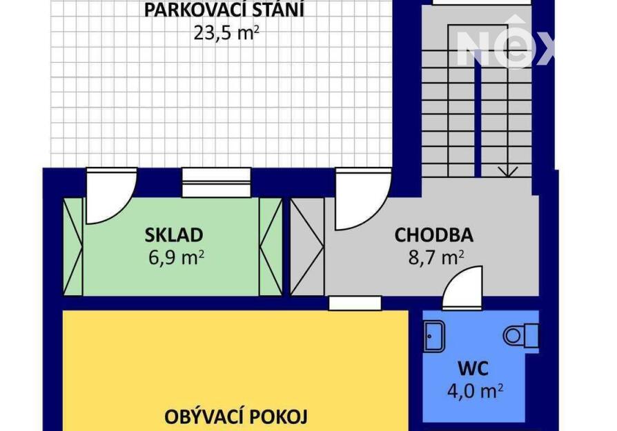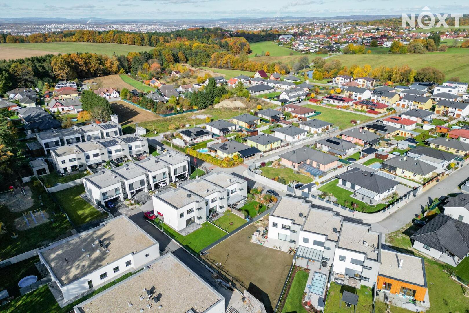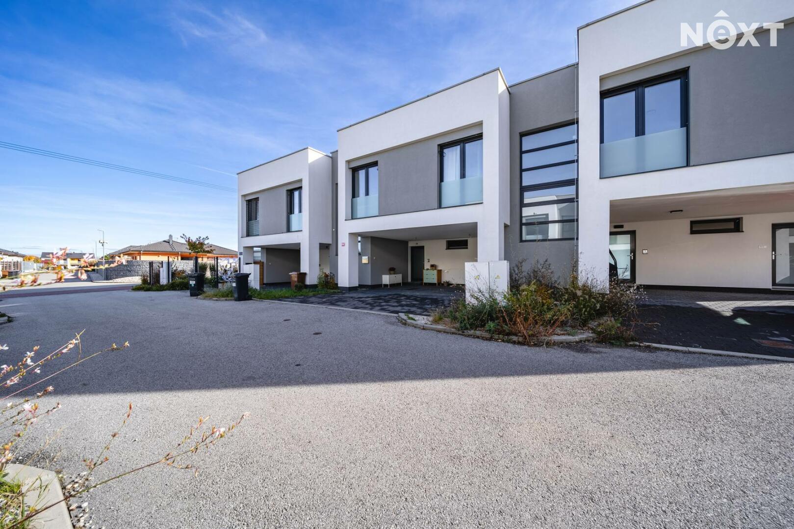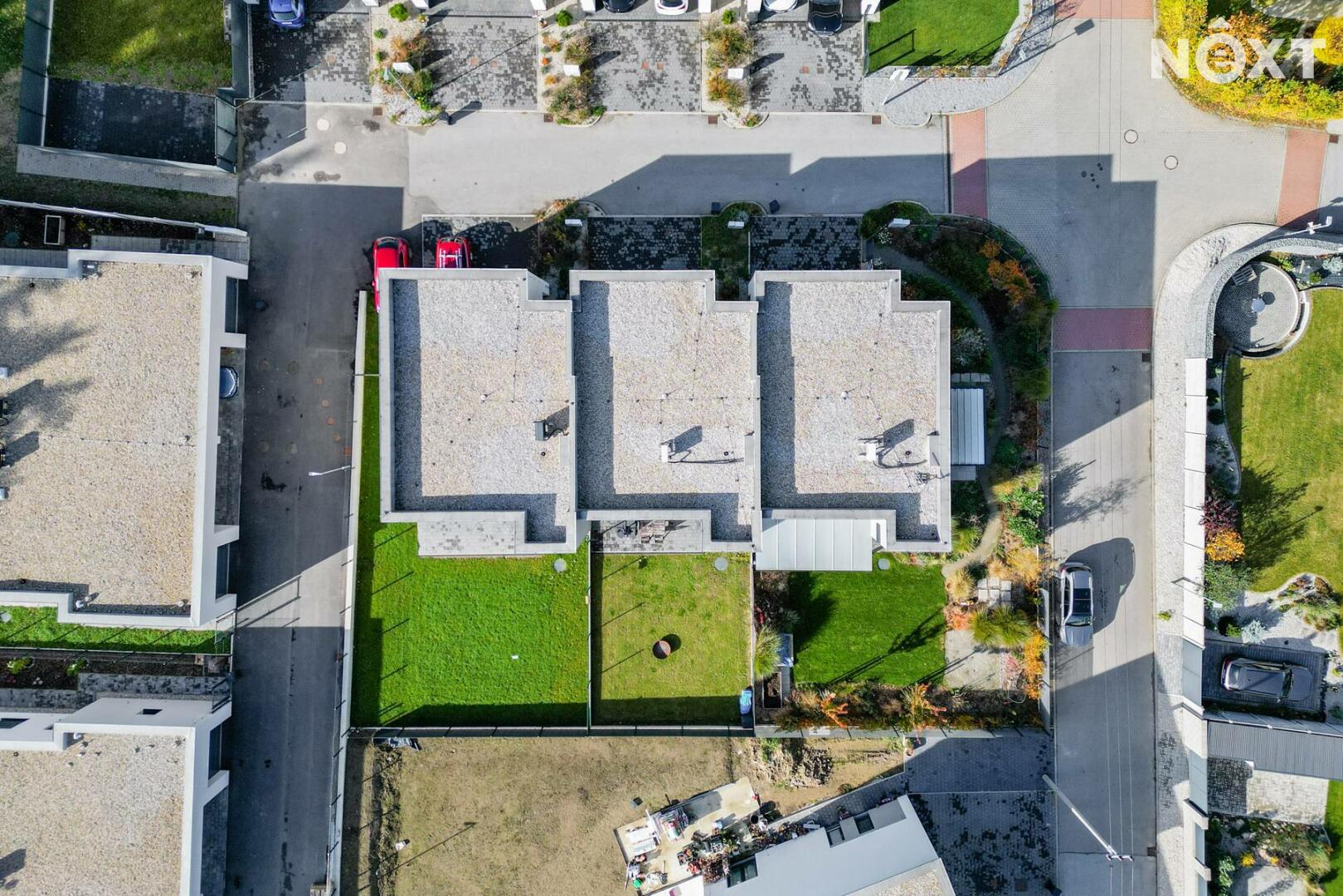 Při příjezdu k domu vás zaujmou dvě krytá parkovací stání o velikosti 23,5 m² a praktický venkovní sklad o 6,99 m², ideální na kola nebo sportovní vybavení. Vstupní hala o 8,79 m² navazuje na světlý obývací pokoj s kuchyňským koutem o 34,25 m², který je srdcem celého domu. Kuchyně je výrazným designovým prvkem – masivní dřevo, kožené úchytky, ručně působící detaily a mimořádně příjemná barevnost tvoří prostor, který působí domácky a zároveň moderně. Z obývací části vedou velké prosklené dveře na terasu o 8,23 m² a na zahradu, které díky své orientaci přivádějí do interiéru dostatek denního světla po celý den.