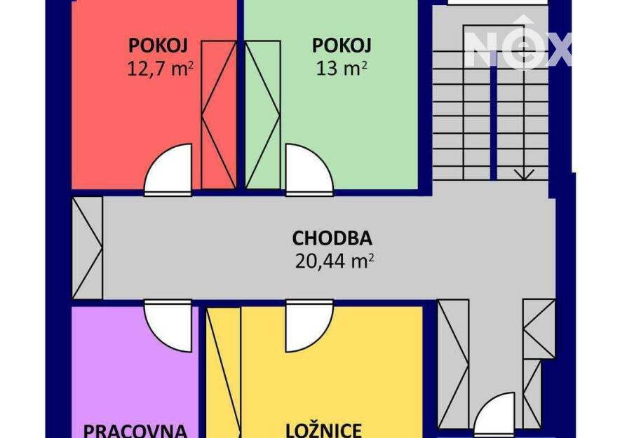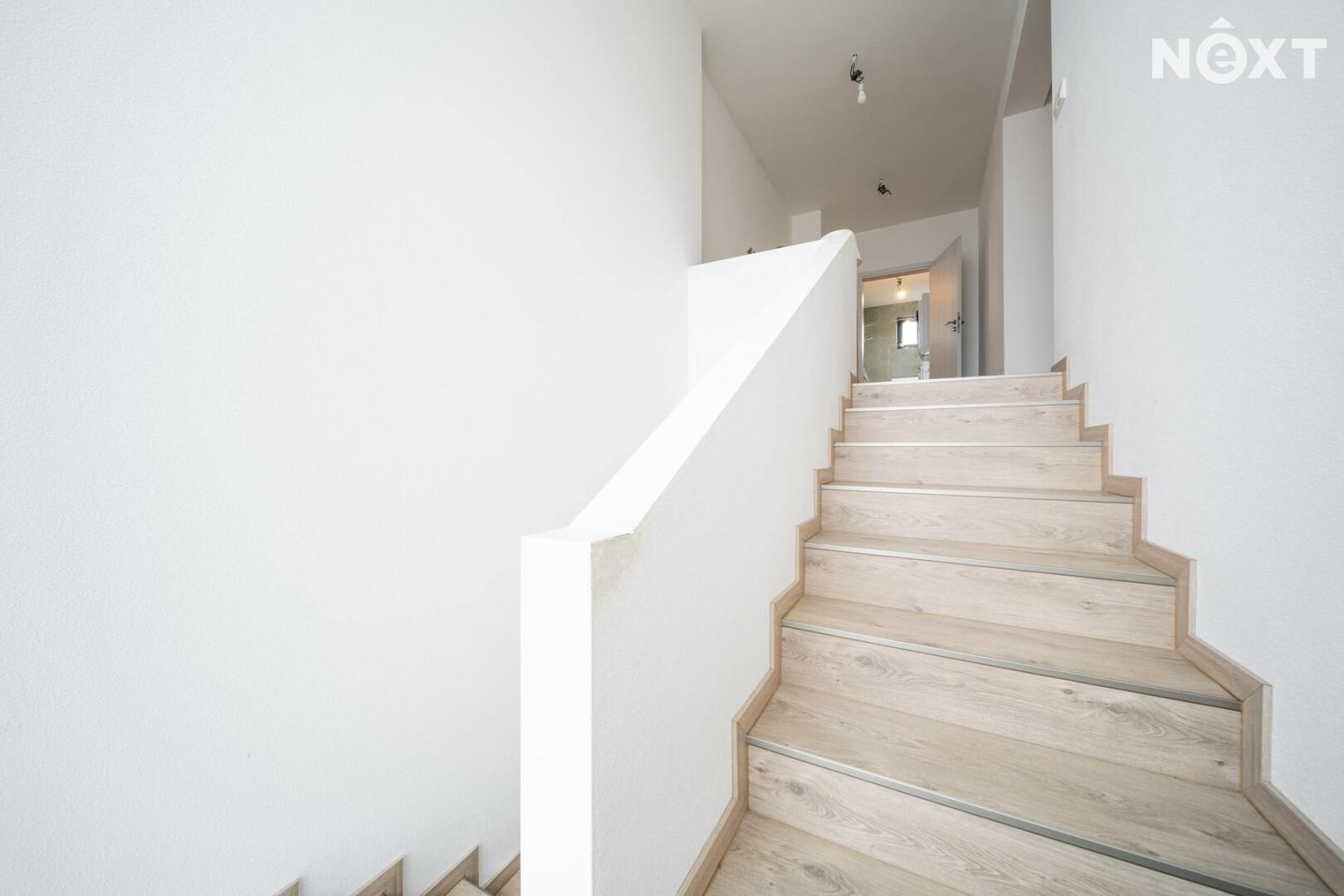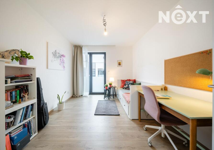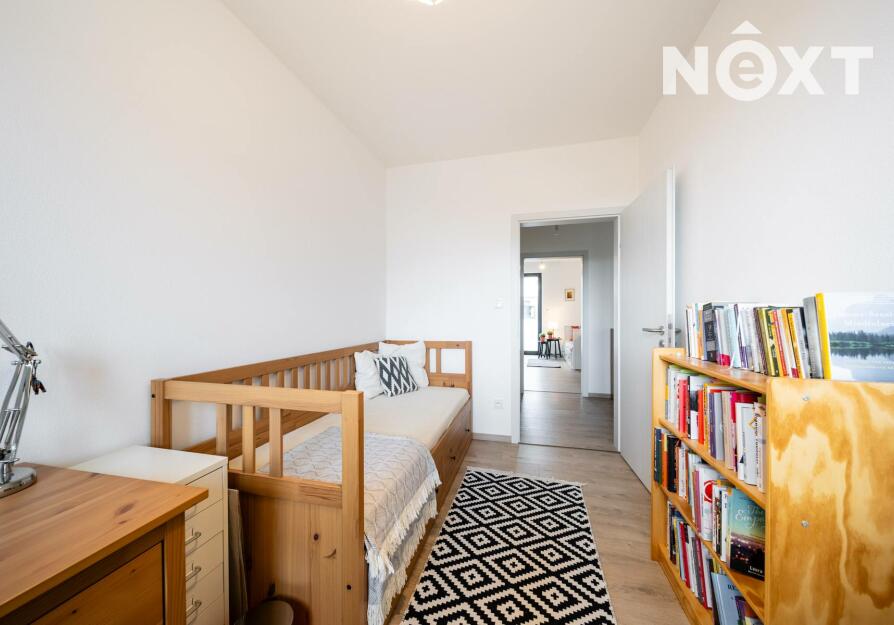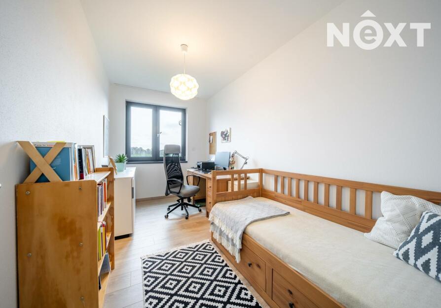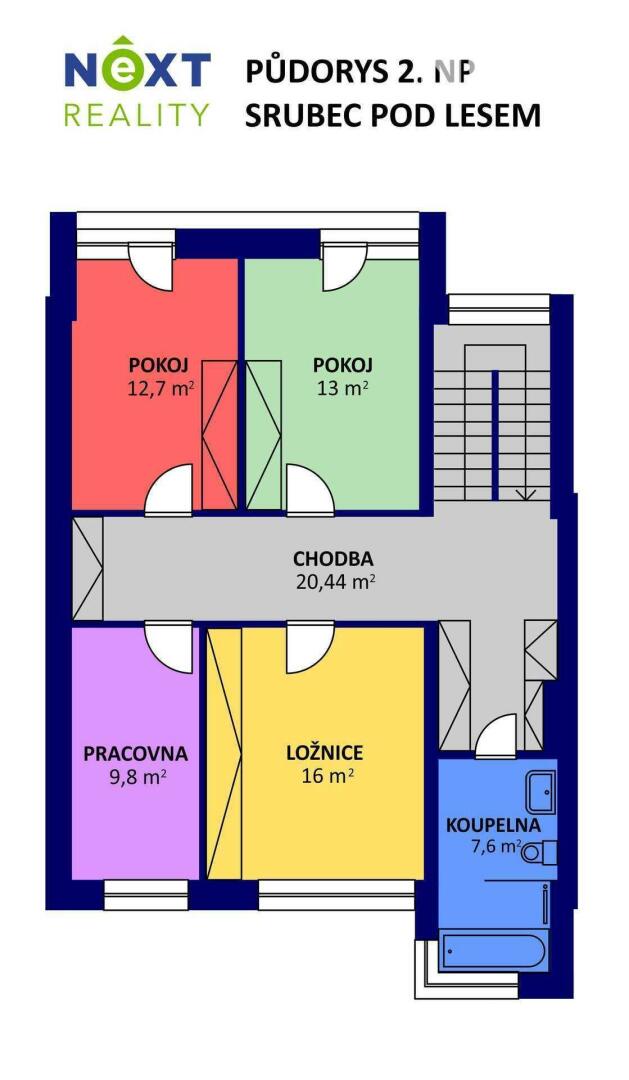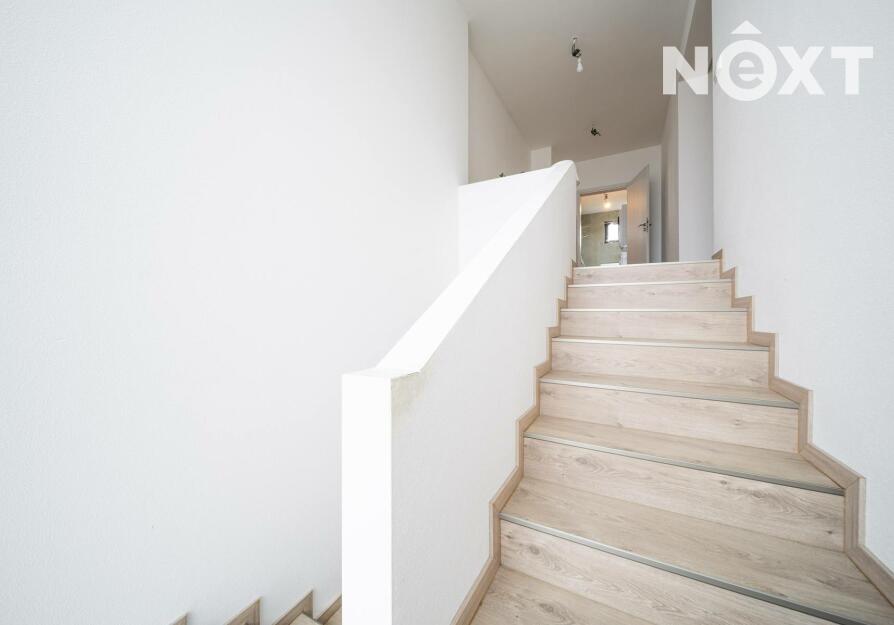 Elegantní prosklené schodiště vede do prvního patra, kde se nachází soukromá část domu. Hlavní ložnice o 16,09 m² působí vzdušně a nabízí klid s příjemným výhledem. Druhý pokoj o 13,95 m² je ideální jako dětský pokoj nebo pracovna. Třetí pokoj o velikosti 12,6 m² může sloužit jako druhý dětský pokoj, hobby místnost nebo pracovna pro dva. Nechybí ani čtvrtá místnost o 9,89 m², vhodná jako šatna, menší pracovna nebo pokoj pro hosty. Koupelna v patře má 7,59 m², je vybavena vanou i sprchovým koutem a díky oknu působí příjemně, svěže a umožňuje přirozené větrání.