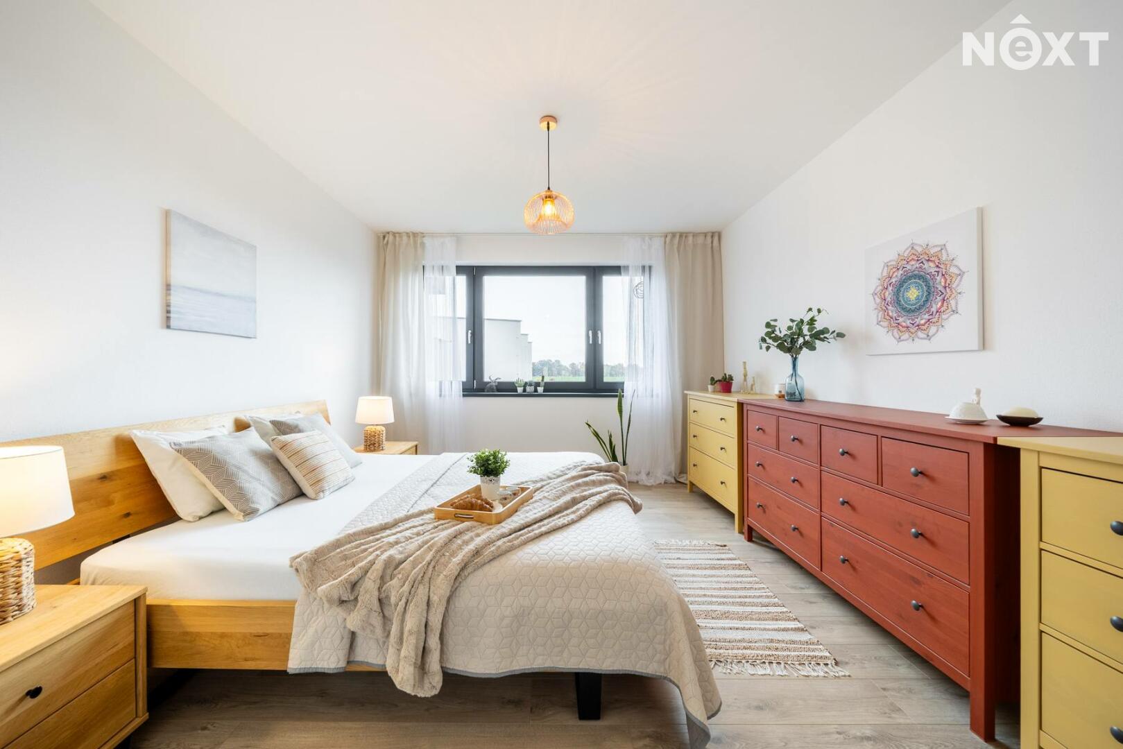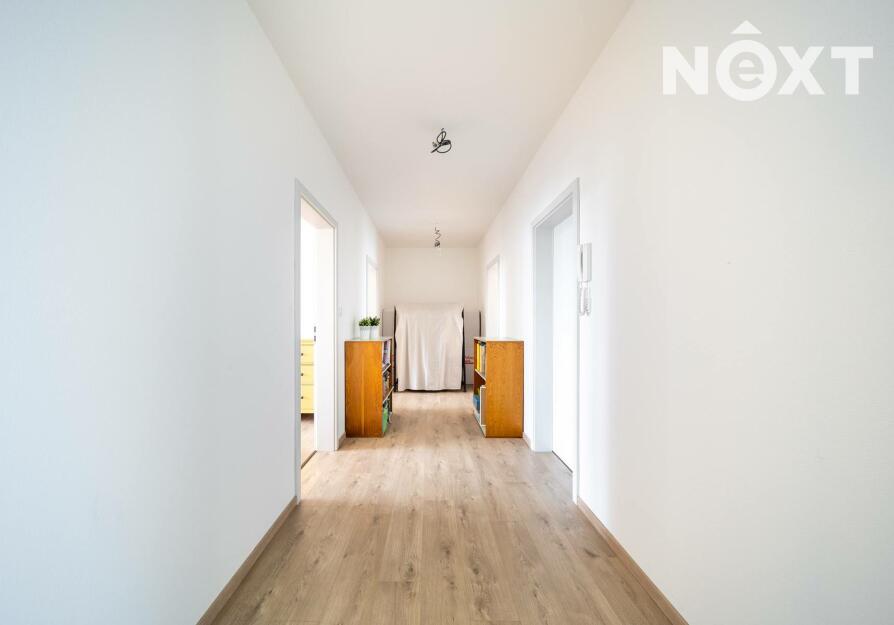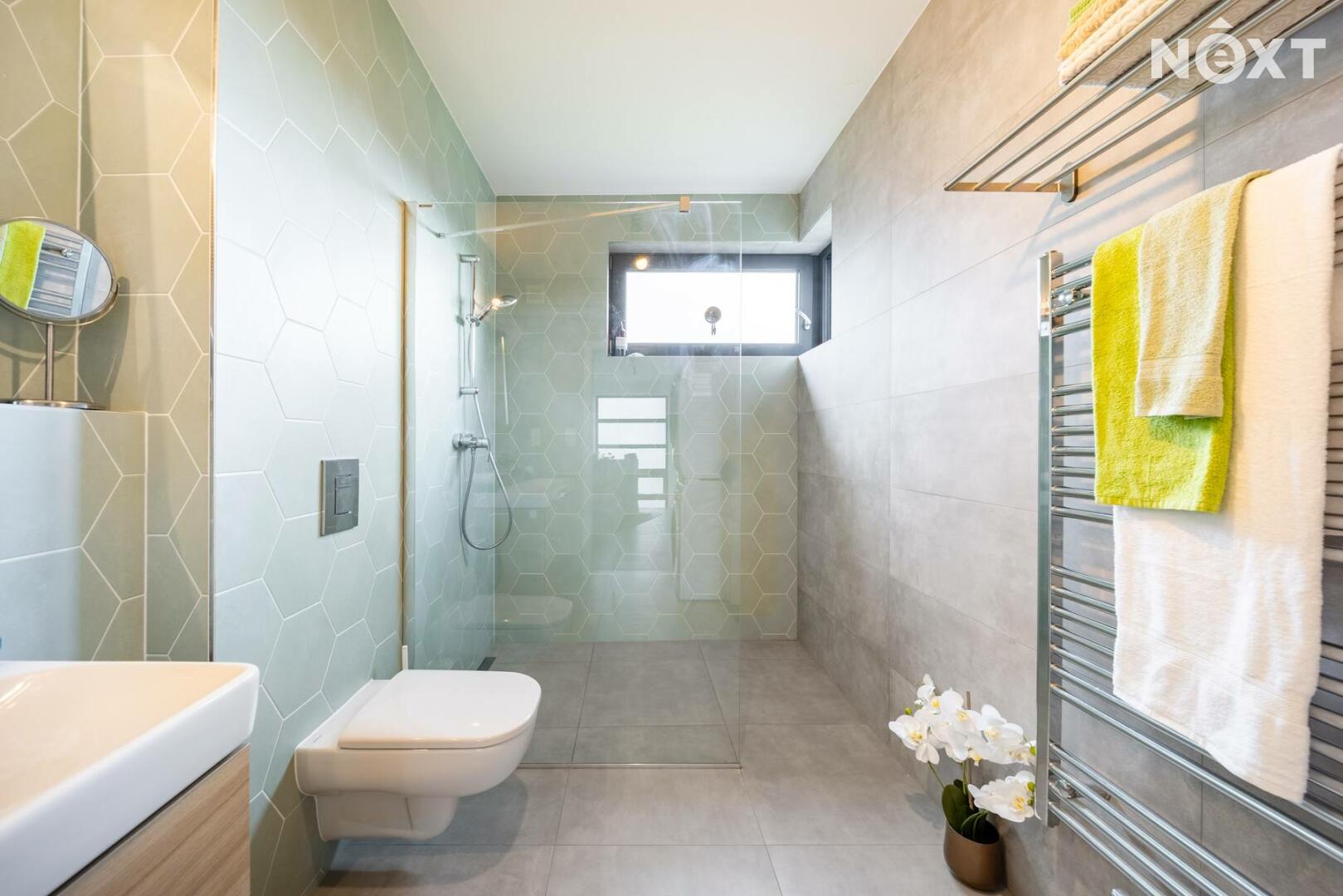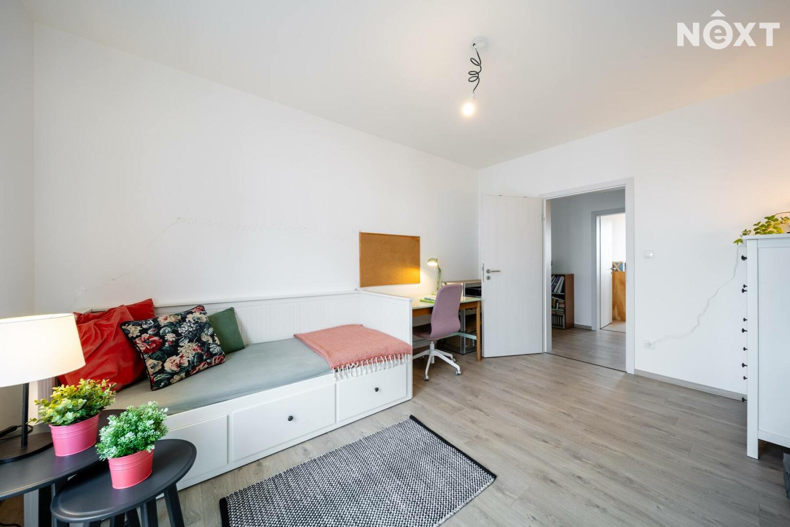 Elegantní prosklené schodiště vede do prvního patra, kde se nachází soukromá část domu. Hlavní ložnice o 16,09 m² působí vzdušně a nabízí klid s příjemným výhledem. Druhý pokoj o 13,95 m² je ideální jako dětský pokoj nebo pracovna. Třetí pokoj o velikosti 12,6 m² může sloužit jako druhý dětský pokoj, hobby místnost nebo pracovna pro dva. Nechybí ani čtvrtá místnost o 9,89 m², vhodná jako šatna, menší pracovna nebo pokoj pro hosty. Koupelna v patře má 7,59 m², je vybavena vanou i sprchovým koutem a díky oknu působí příjemně, svěže a umožňuje přirozené větrání.