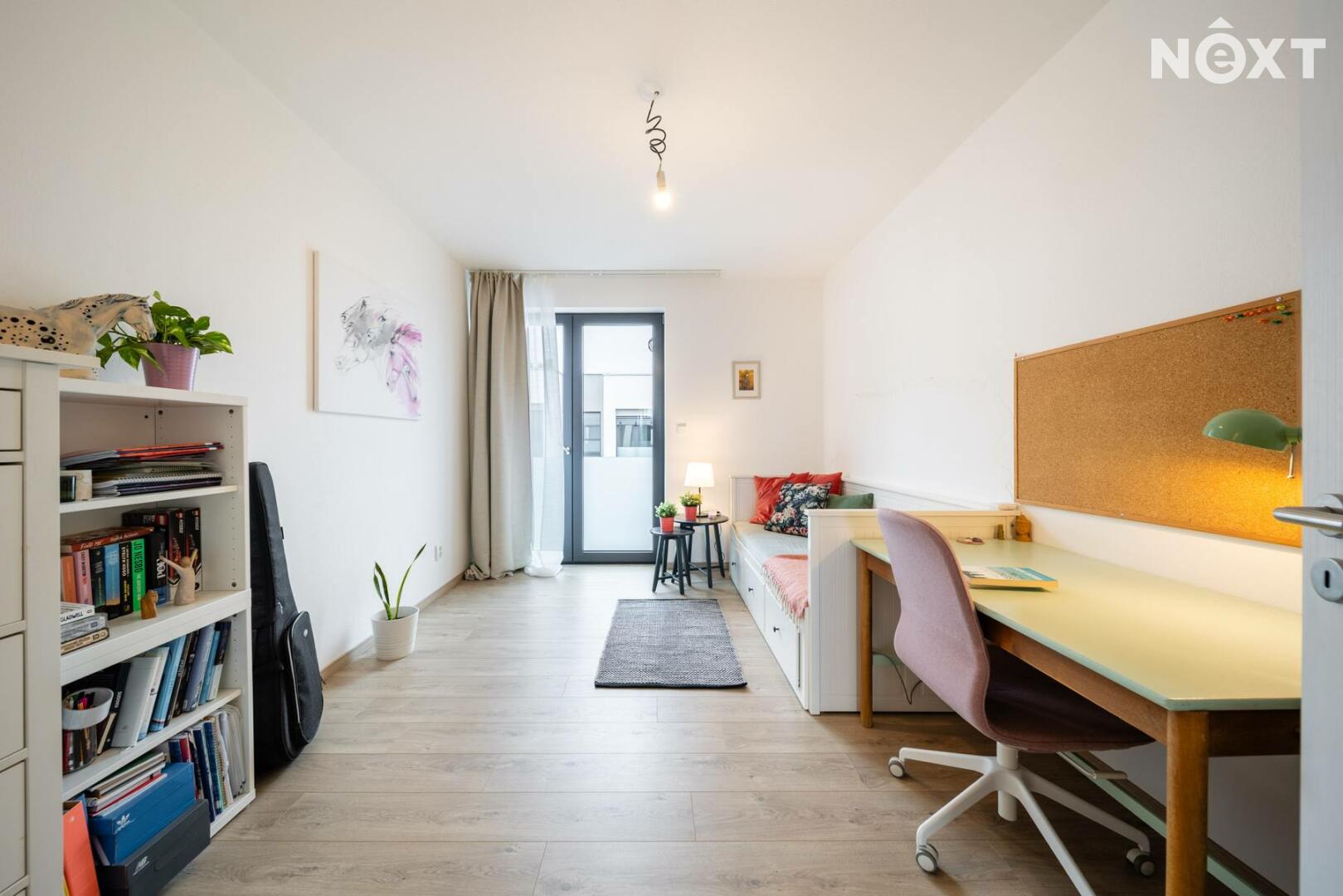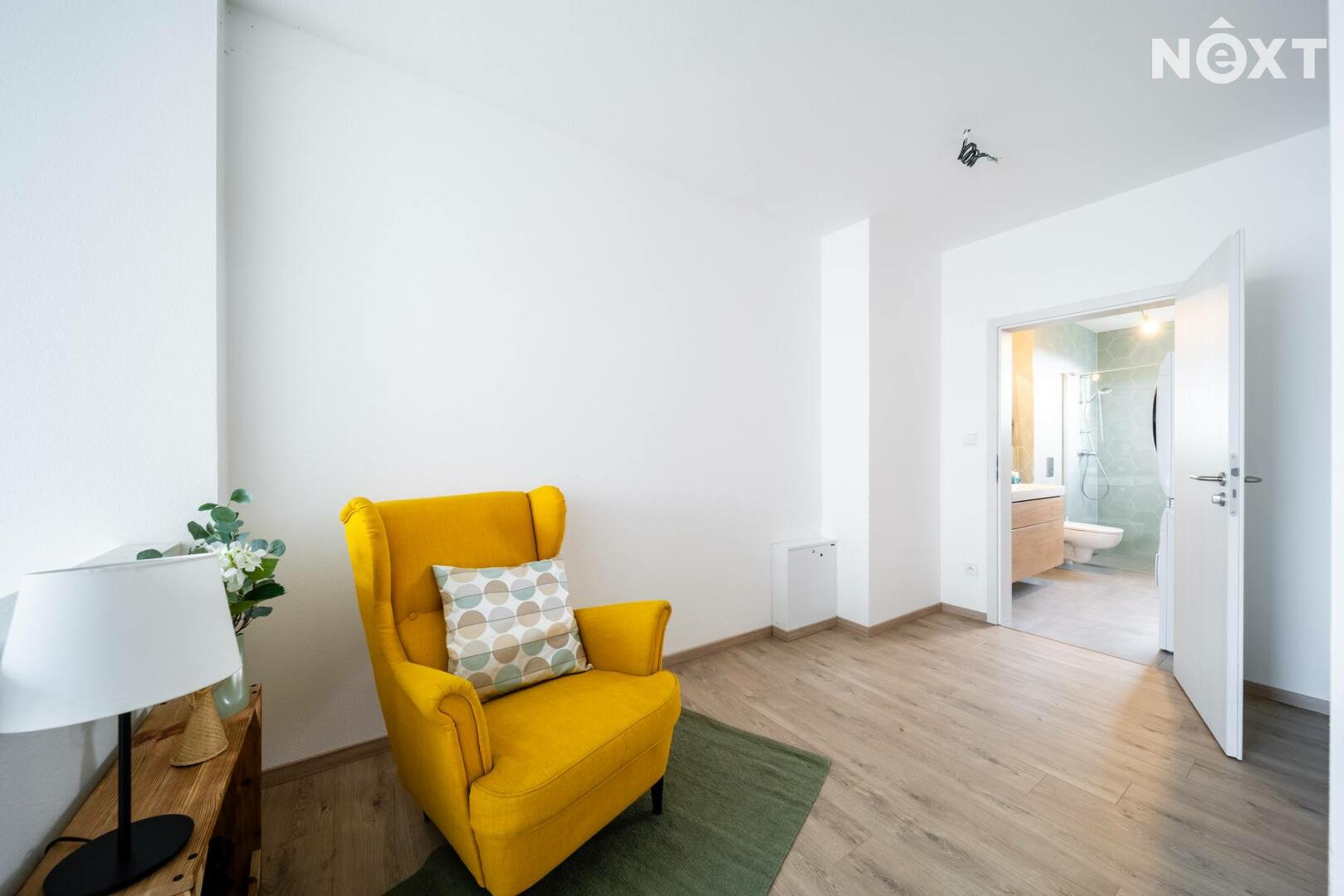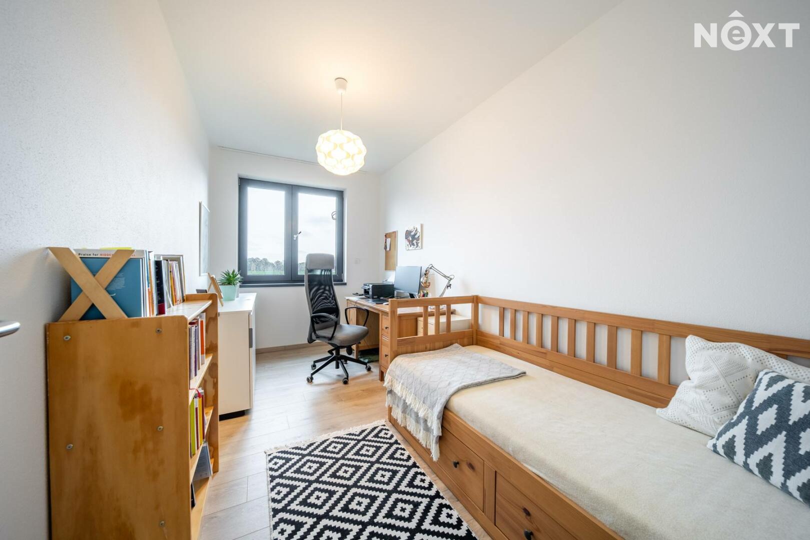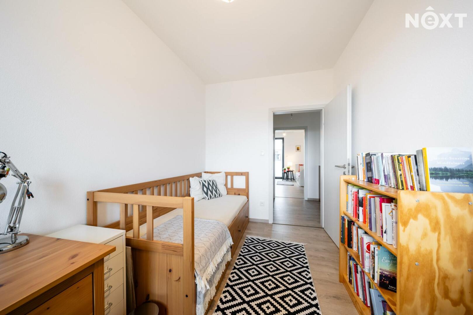 Elegantní prosklené schodiště vede do prvního patra, kde se nachází soukromá část domu. Hlavní ložnice o 16,09 m² působí vzdušně a nabízí klid s příjemným výhledem. Druhý pokoj o 13,95 m² je ideální jako dětský pokoj nebo pracovna. Třetí pokoj o velikosti 12,6 m² může sloužit jako druhý dětský pokoj, hobby místnost nebo pracovna pro dva. Nechybí ani čtvrtá místnost o 9,89 m², vhodná jako šatna, menší pracovna nebo pokoj pro hosty. Koupelna v patře má 7,59 m², je vybavena vanou i sprchovým koutem a díky oknu působí příjemně, svěže a umožňuje přirozené větrání.