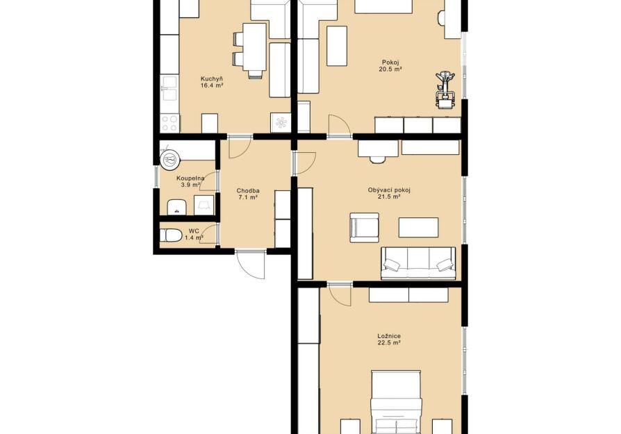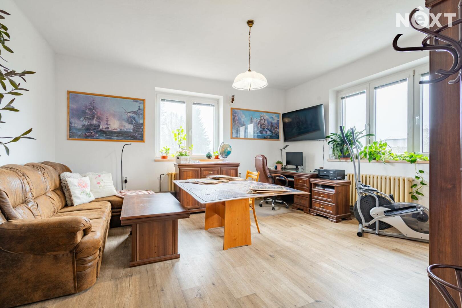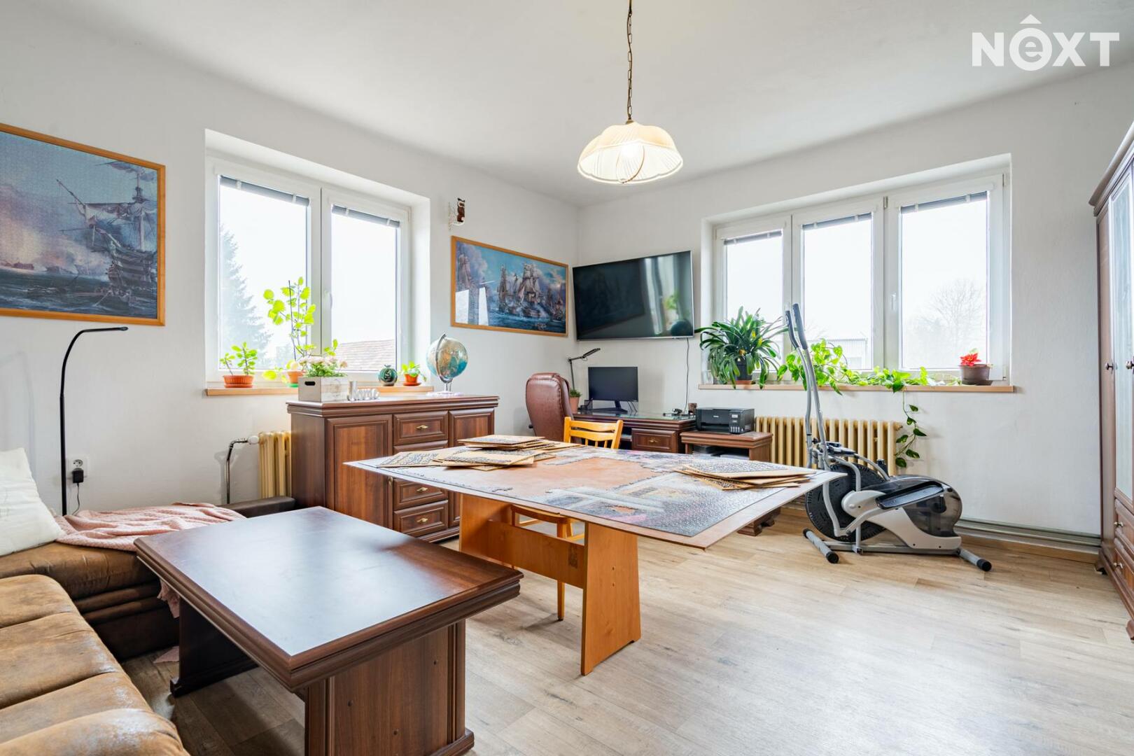 Byt prošel v roce 2021 částečnou rekonstrukcí – upraveny byly podlahy, kuchyně i koupelna. Dispozice nabízí prostorný obývací pokoj, kuchyň s jídelní částí a dva samostatné pokoje. Součástí prodeje je i sklepní místnosti a praktická komora umístěná přímo na patře.