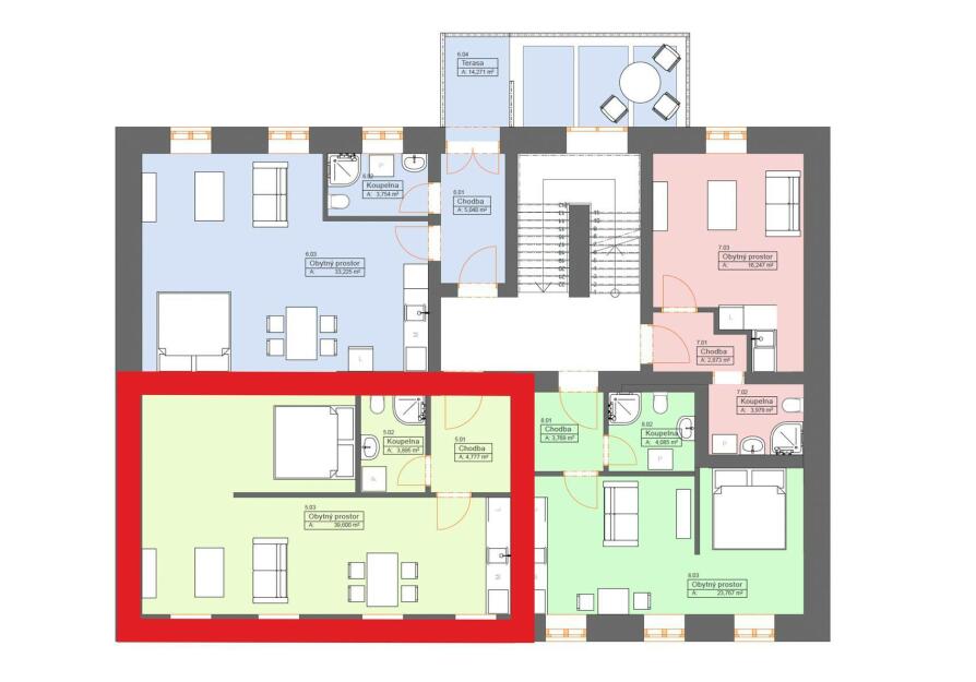 Byt se skládá ze vstupní chodby, koupelny, dvou obytných místností a prostoru, ve kterém si může nový majitel vybudovat kuchyňský kout zcela podle svých představ a potřeb.