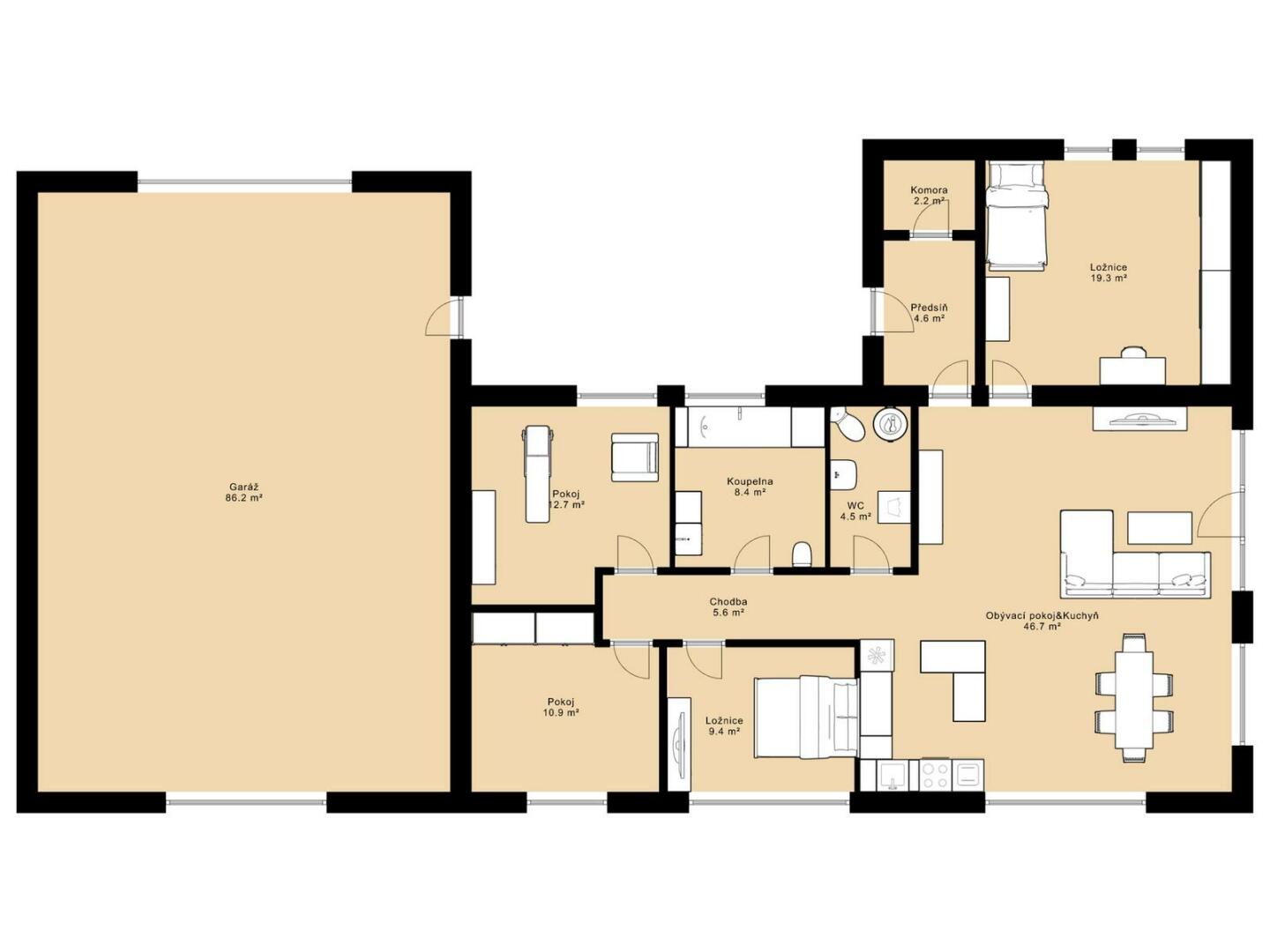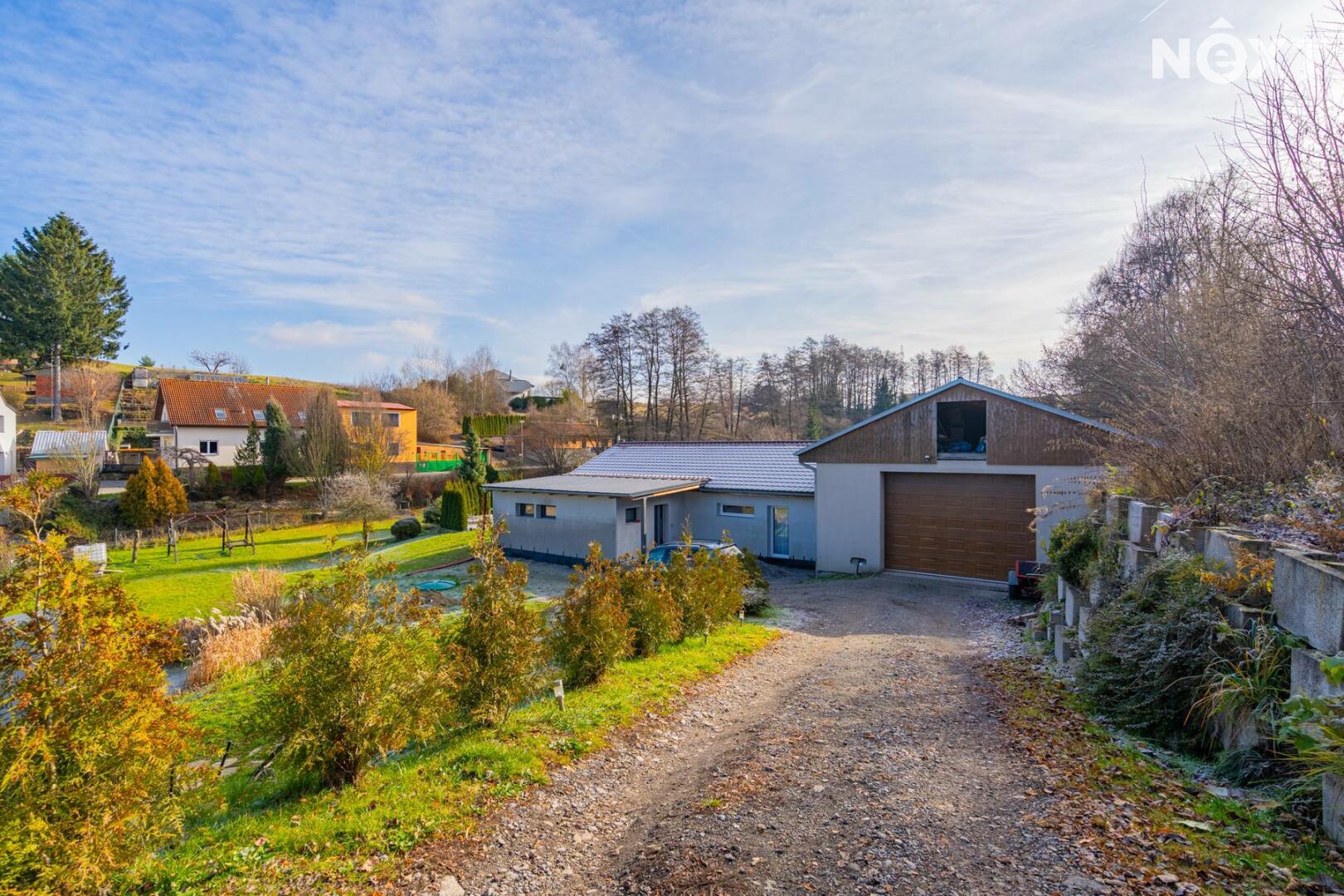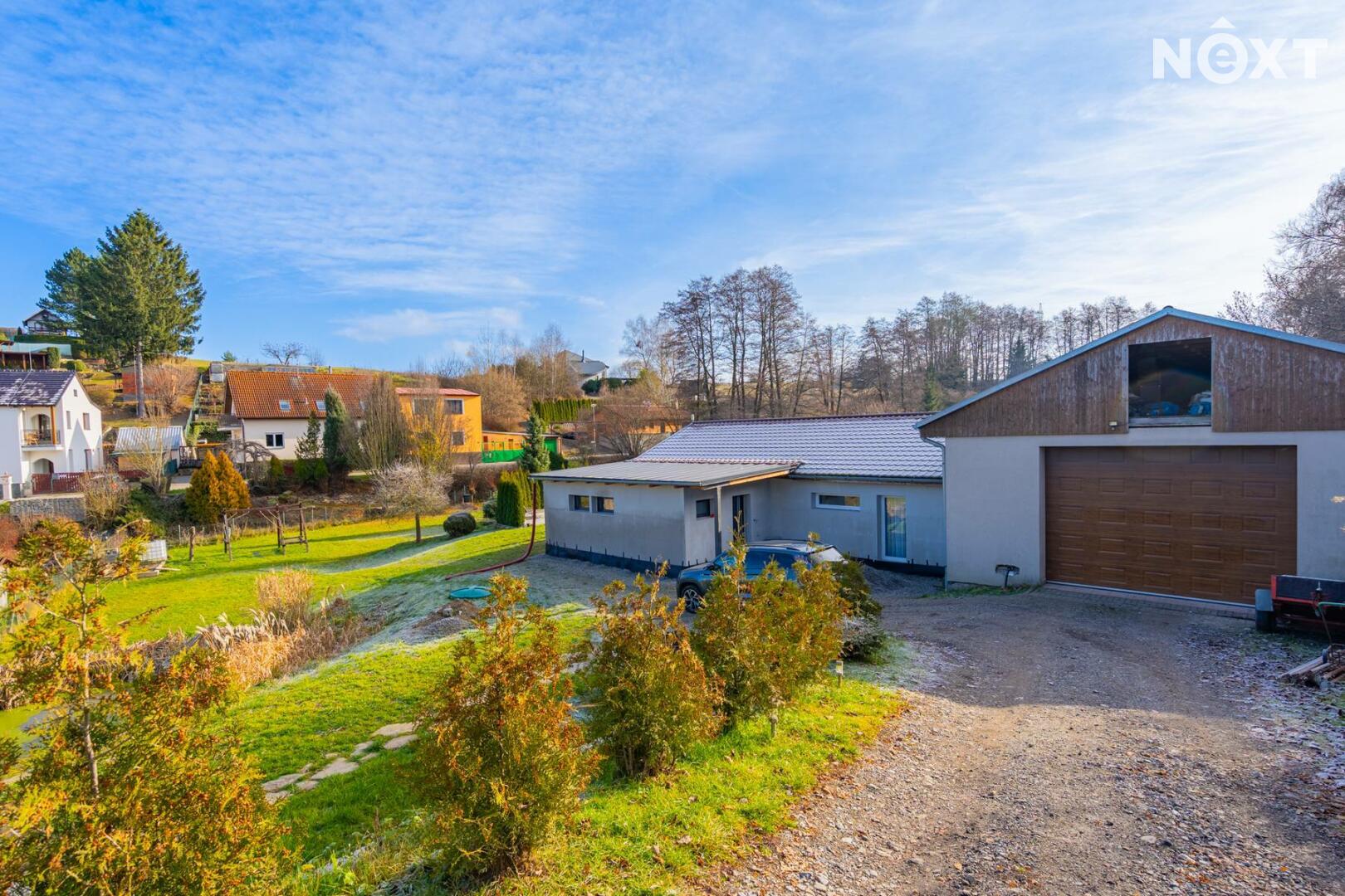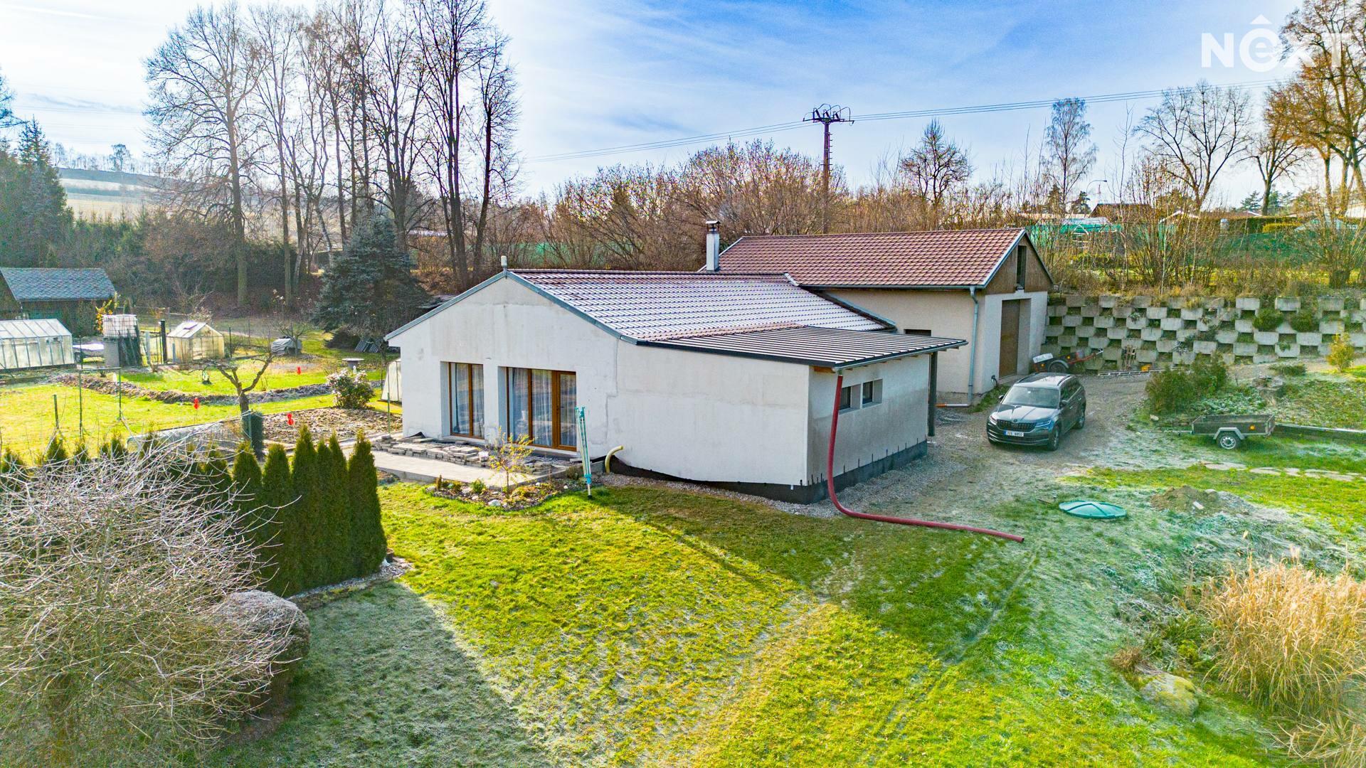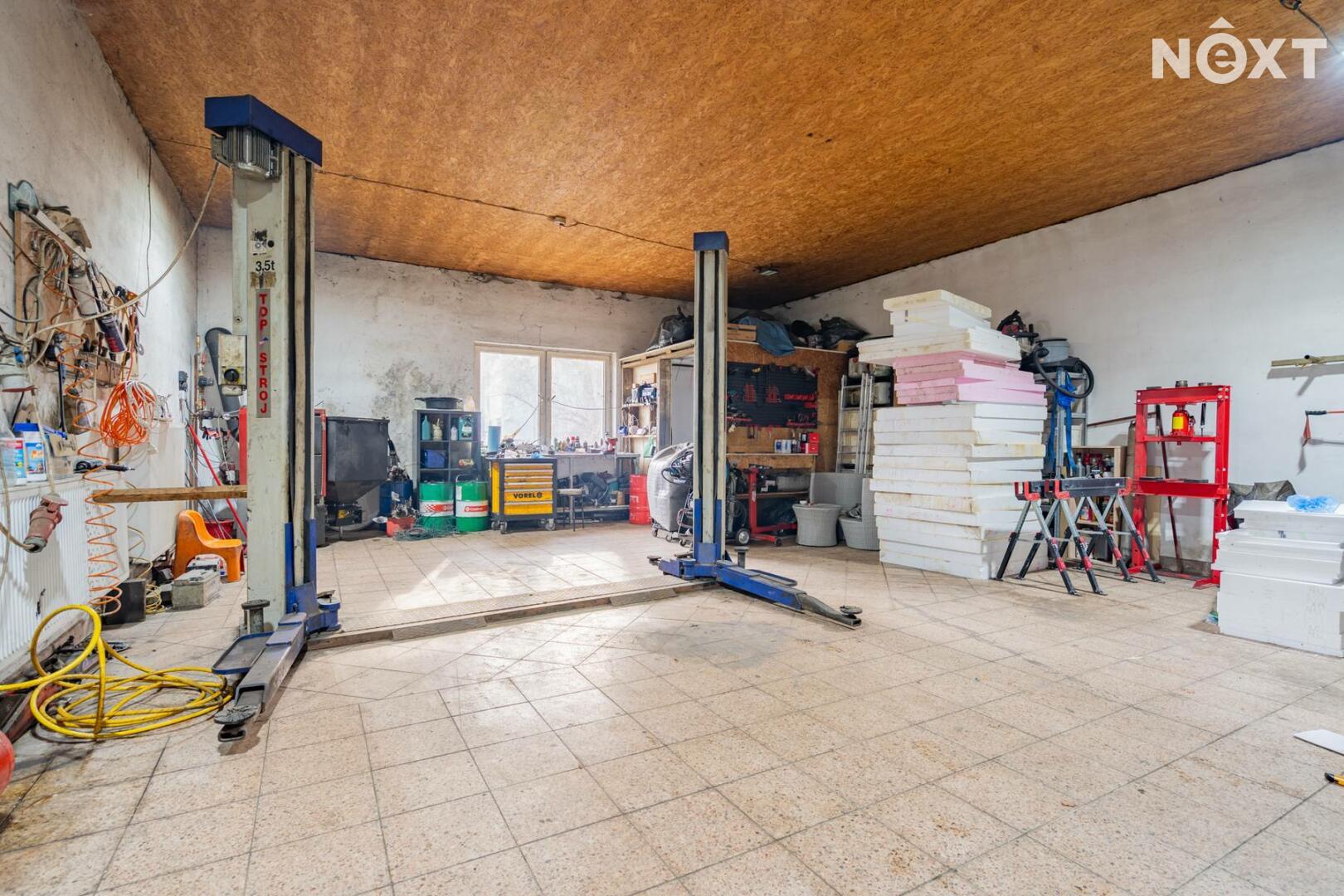 Na dům navazuje velká dvougaráž, která v současné době slouží jako autodílna. V ní je umístěn kotel na dřevěné pelety s rozvody do podlahového topení v celém domě, přičemž je možné připojit také elektrokotel. Ohřev vody zajišťuje elektrický bojler v technické místnosti. Dům byl budován postupně od roku 2019 a je před kolaudací, kterou zajistí stávající majitel. Objekt je zateplený, bude dokončena fasáda i venkovní dlažby okolo domu. PENB štítek je zadaný ve výrobě.