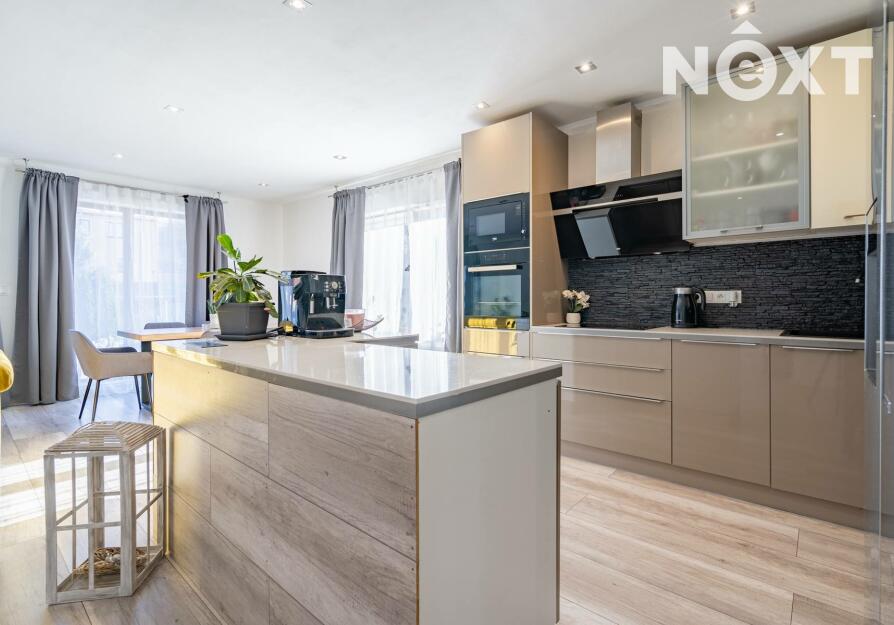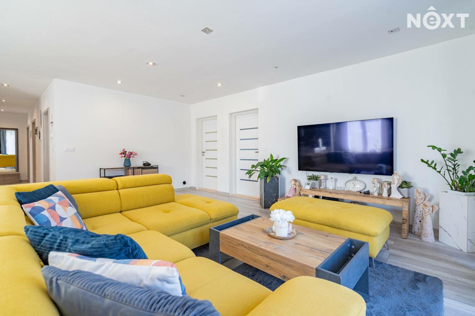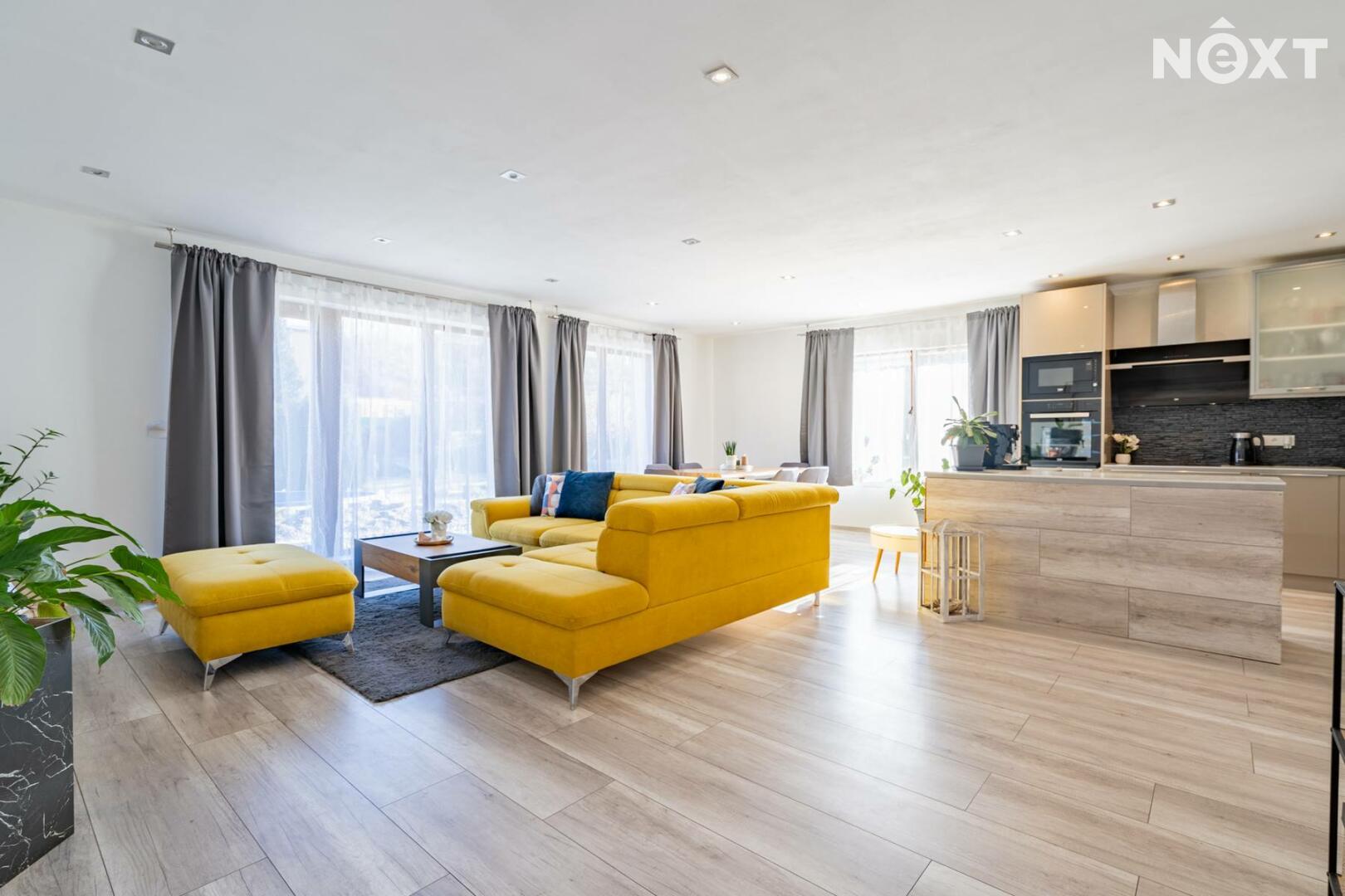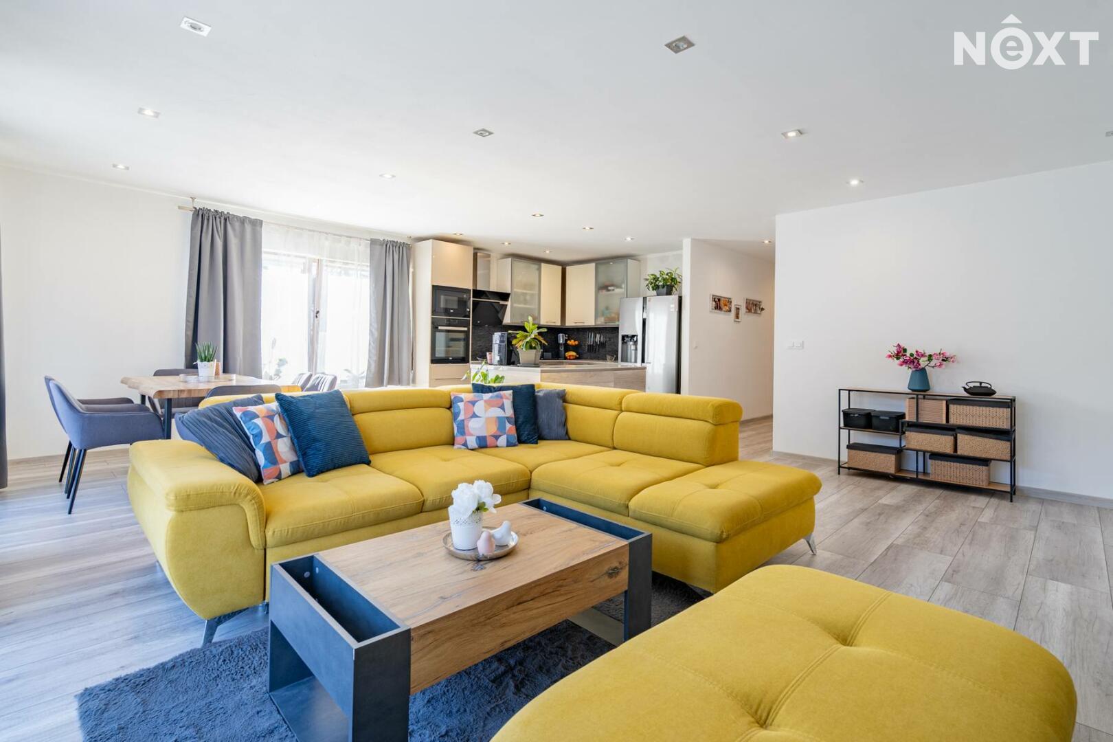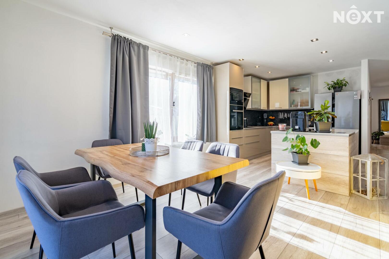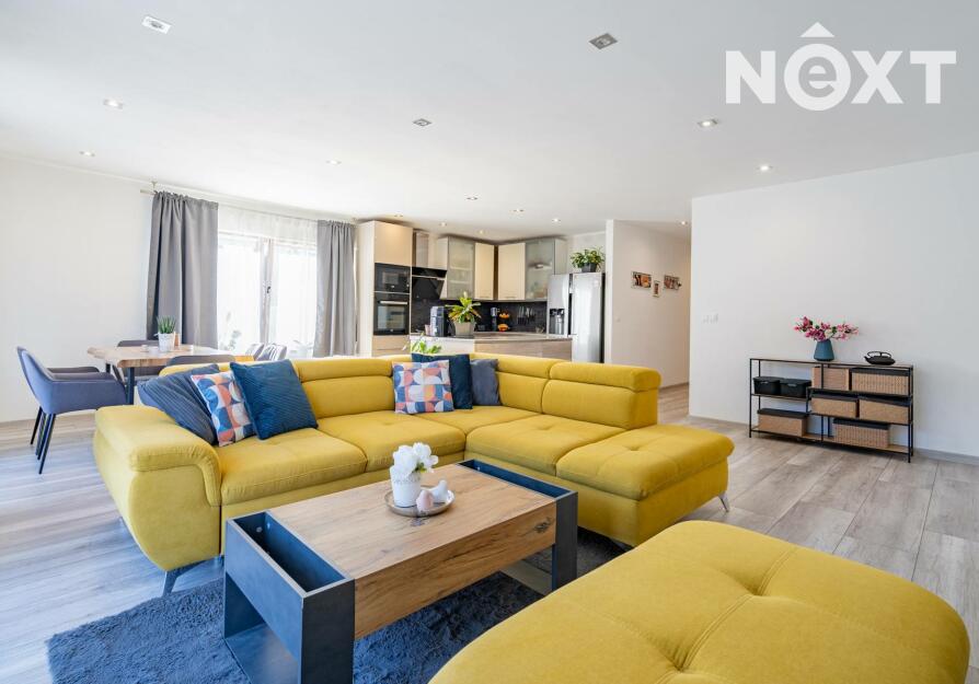 Dům má zastavěnou plochu 216 m². Po vstupu se nachází zádveří se samostatnou šatnou, odkud vede vstup do velmi prostorného obývacího pokoje s velkými francouzskými okny orientovanými do zahrady. Obývací pokoj je propojen s kuchyní, která nabízí dostatek úložného prostoru, vestavnou myčku, elektrickou troubu, mikrovlnnou troubu, indukční varnou desku i lednici. Celý interiér působí vzdušně, je plný přirozeného světla a nabízí příjemnou domácí atmosféru. Z obývacího pokoje lze vstoupit do dětského pokoje.