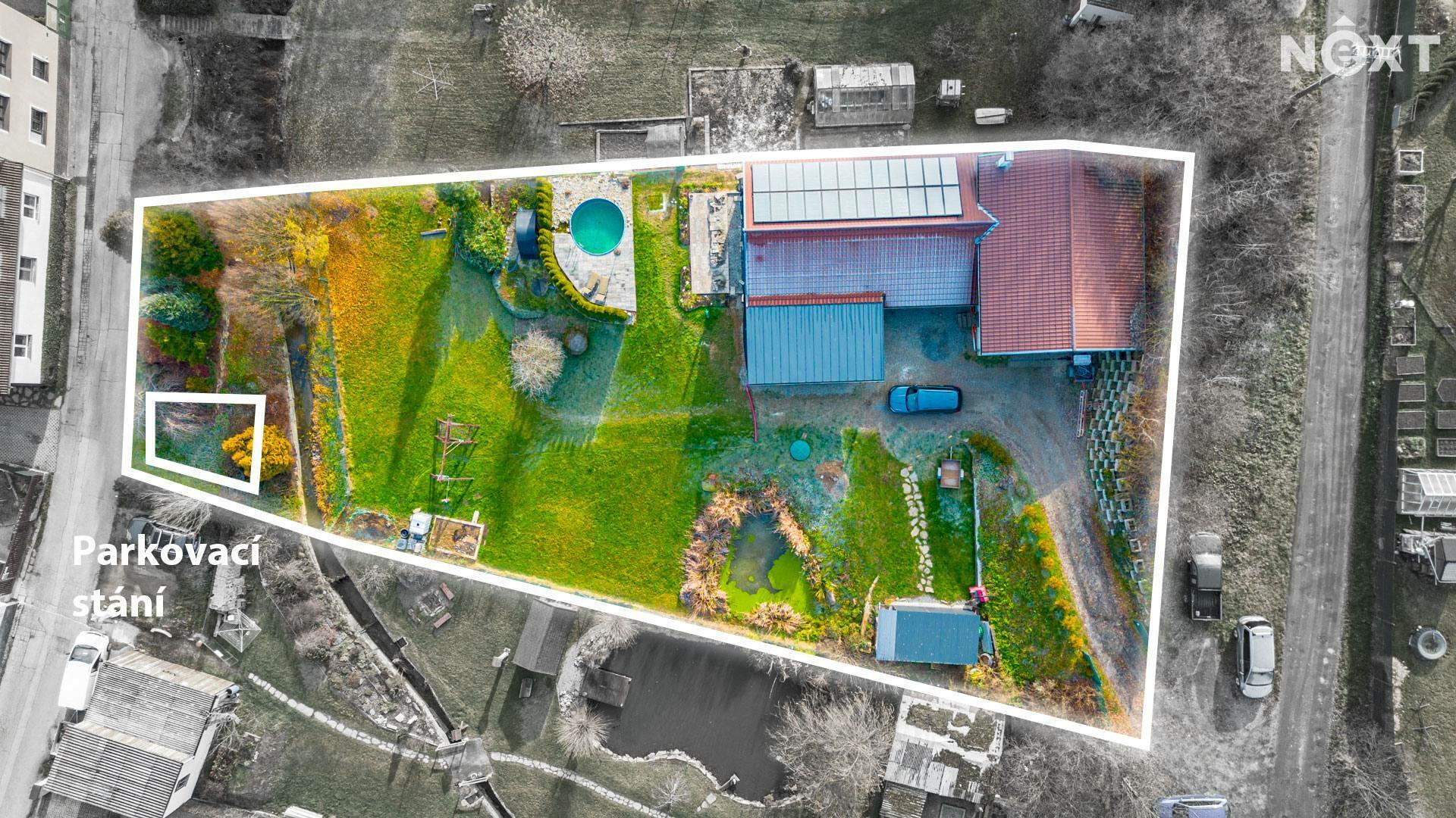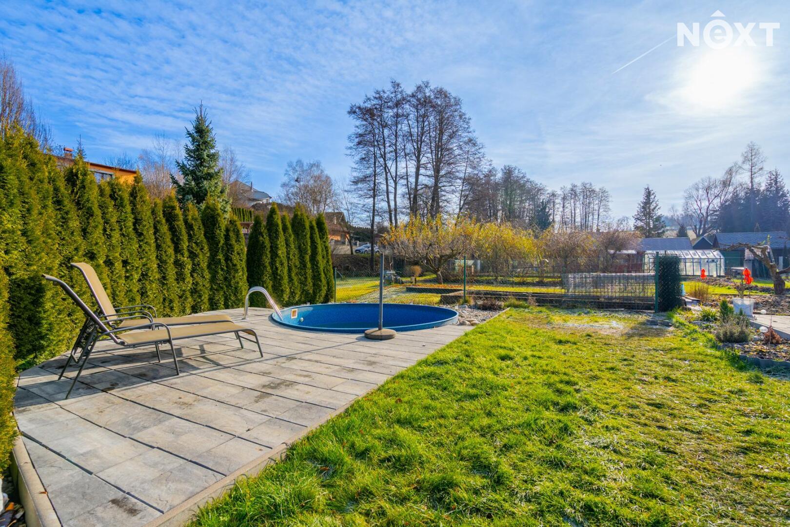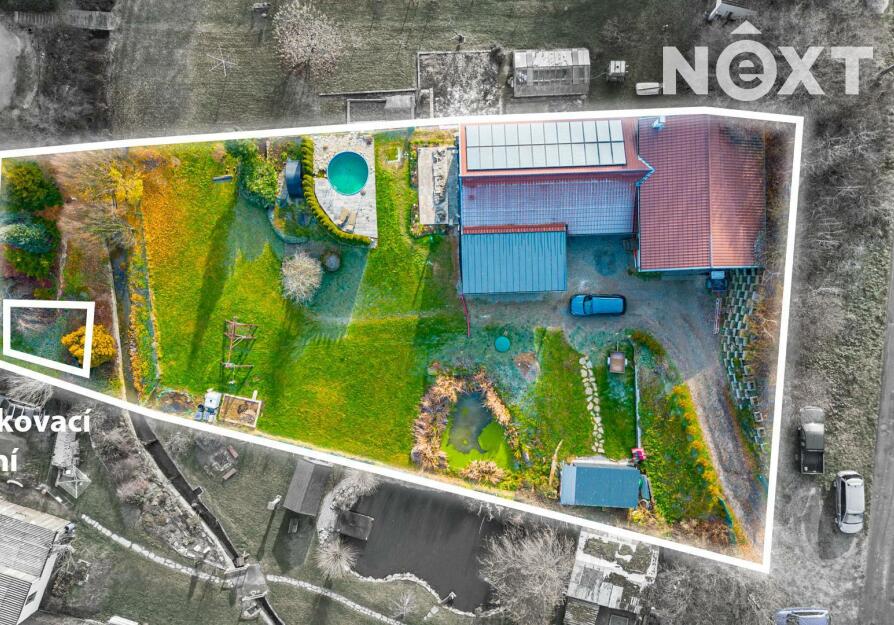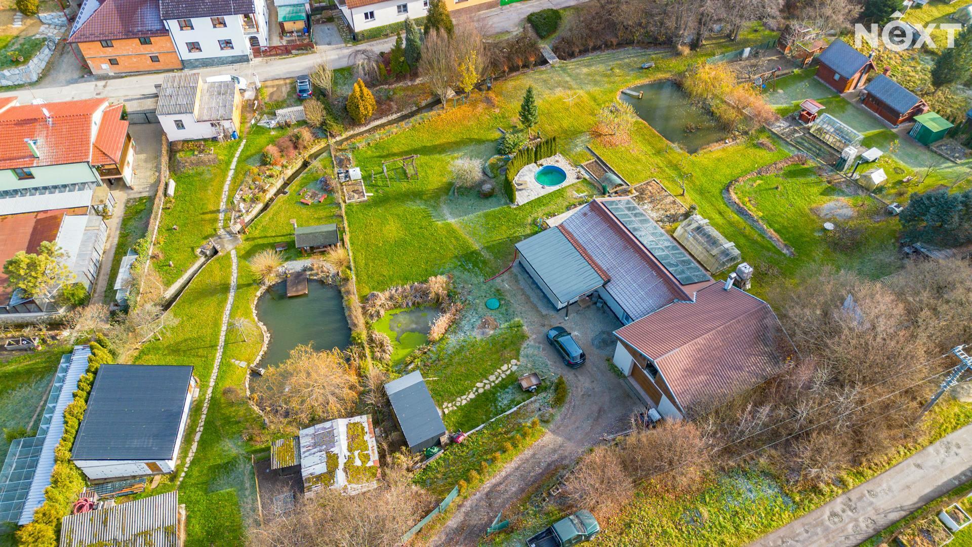 Na pozemku je vlastní studna s pitnou vodou a čistička odpadních vod. Zahrada nabízí příjemné soukromí a dost místa pro rodinný život – je zde terasa zastíněná stromy, bazén, dětské hřiště, zahradní domek na techniku a další úložný prostor. Pozemkem protéká potůček a za ním se nachází možnost dalšího parkování. Dům má tedy dva nezávislé příjezdy.