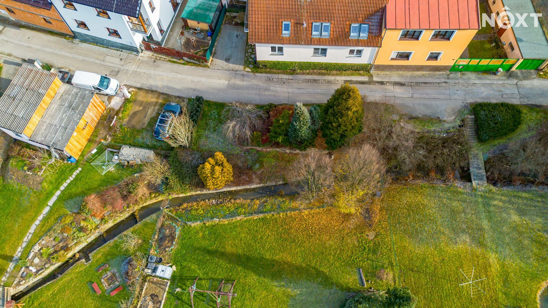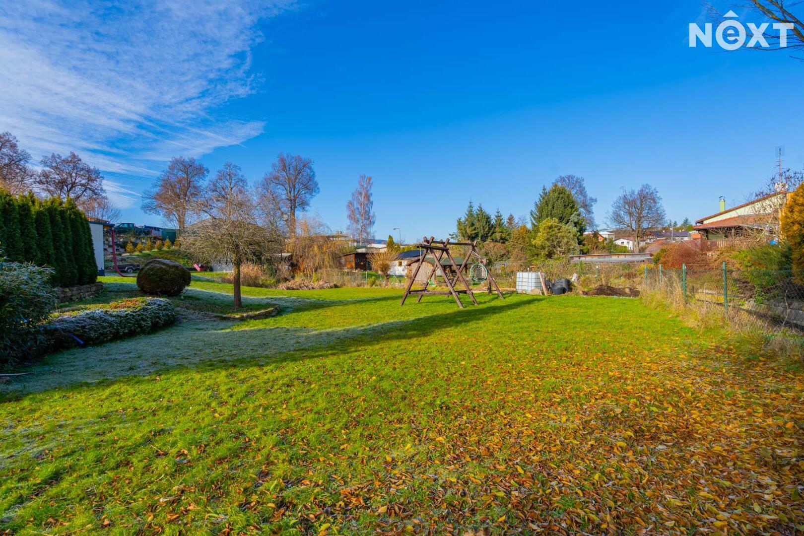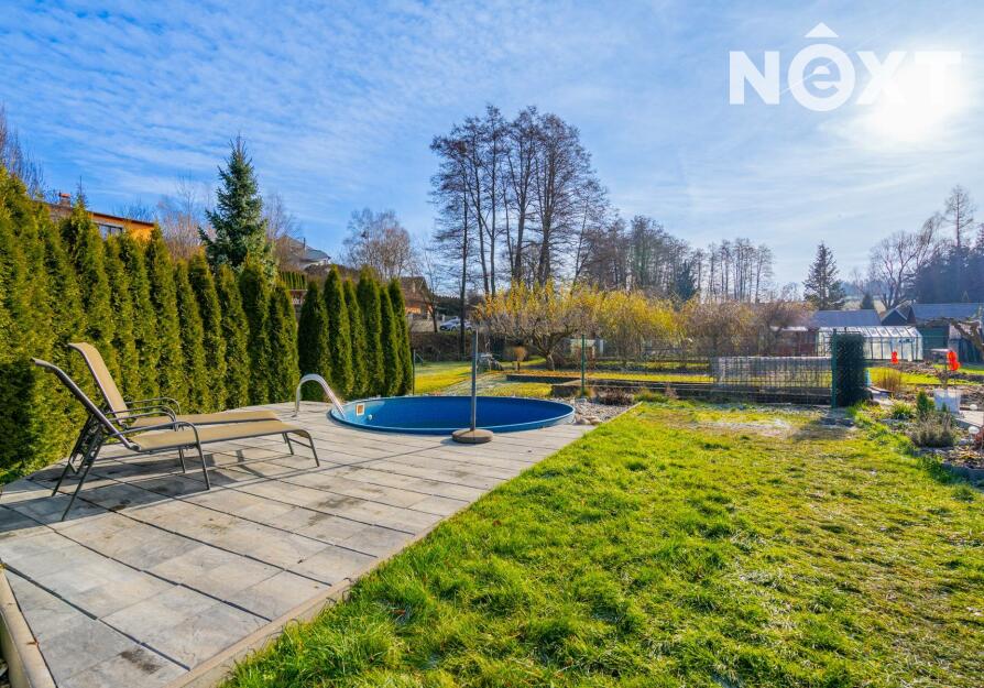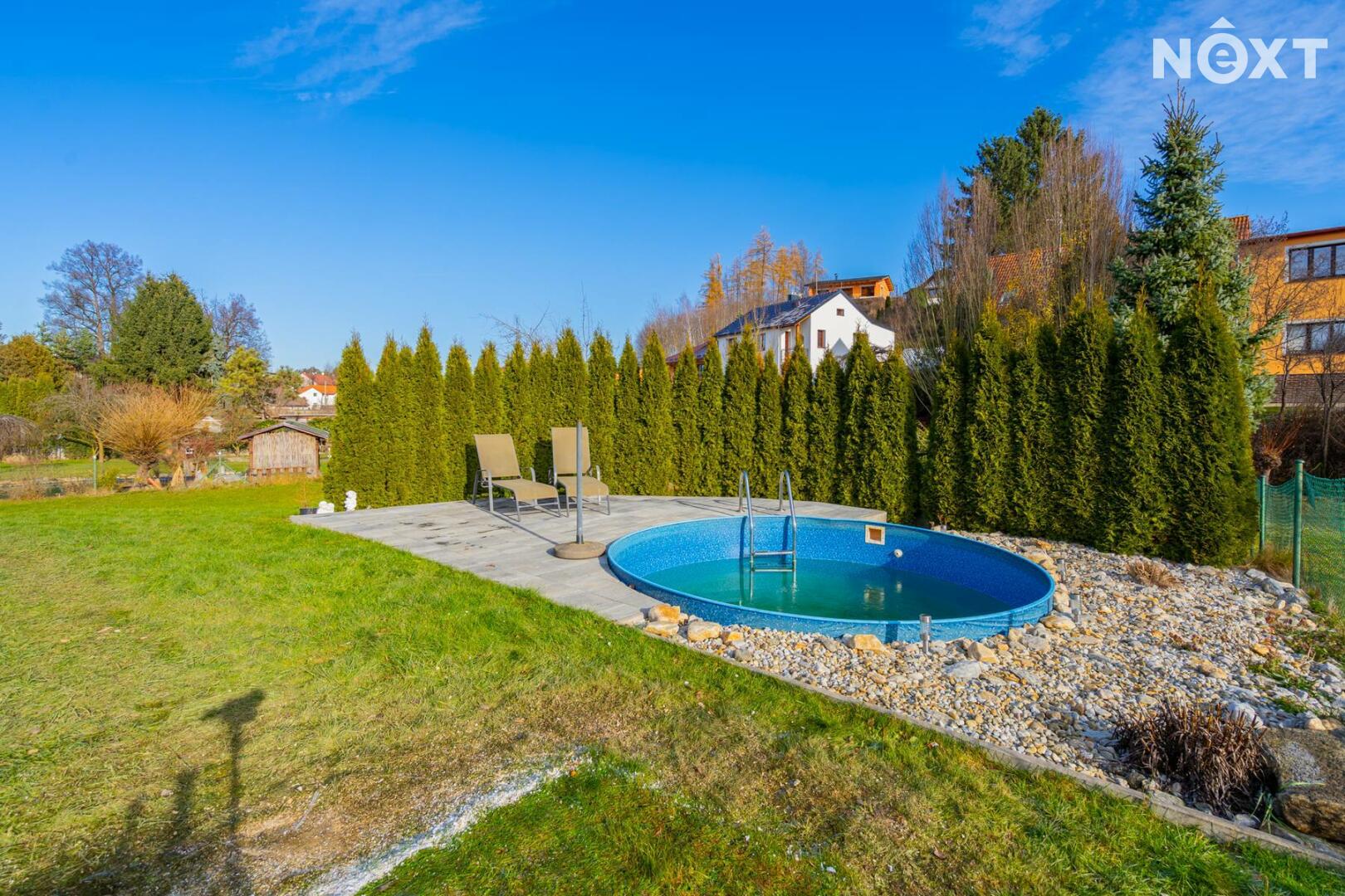 Na pozemku je vlastní studna s pitnou vodou a čistička odpadních vod. Zahrada nabízí příjemné soukromí a dost místa pro rodinný život – je zde terasa zastíněná stromy, bazén, dětské hřiště, zahradní domek na techniku a další úložný prostor. Pozemkem protéká potůček a za ním se nachází možnost dalšího parkování. Dům má tedy dva nezávislé příjezdy.