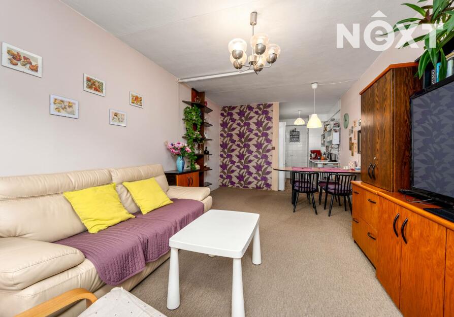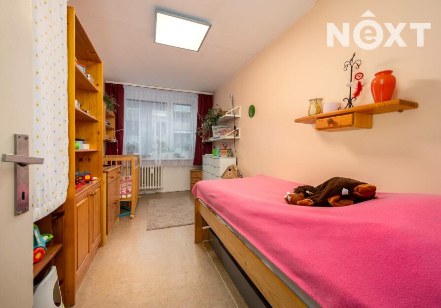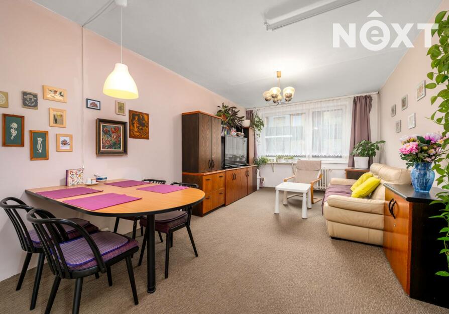 Dispozičně nabízí obývací pokoj s kuchyňským koutem, ložnici se vstupem na zasklenou lodžii a další samostatný pokoj. Z prostorné předsíně je vstup do velké šatny/komory, a dále do koupelny s vanou a na samostatnou toaletu. Byt má plastová okna orientovaná na západní stranu, na podlahách je PVC a koberec, vytápění i ohřev vody jsou řešeny dálkově. K bytu náleží také sklepní kóje (2m2).