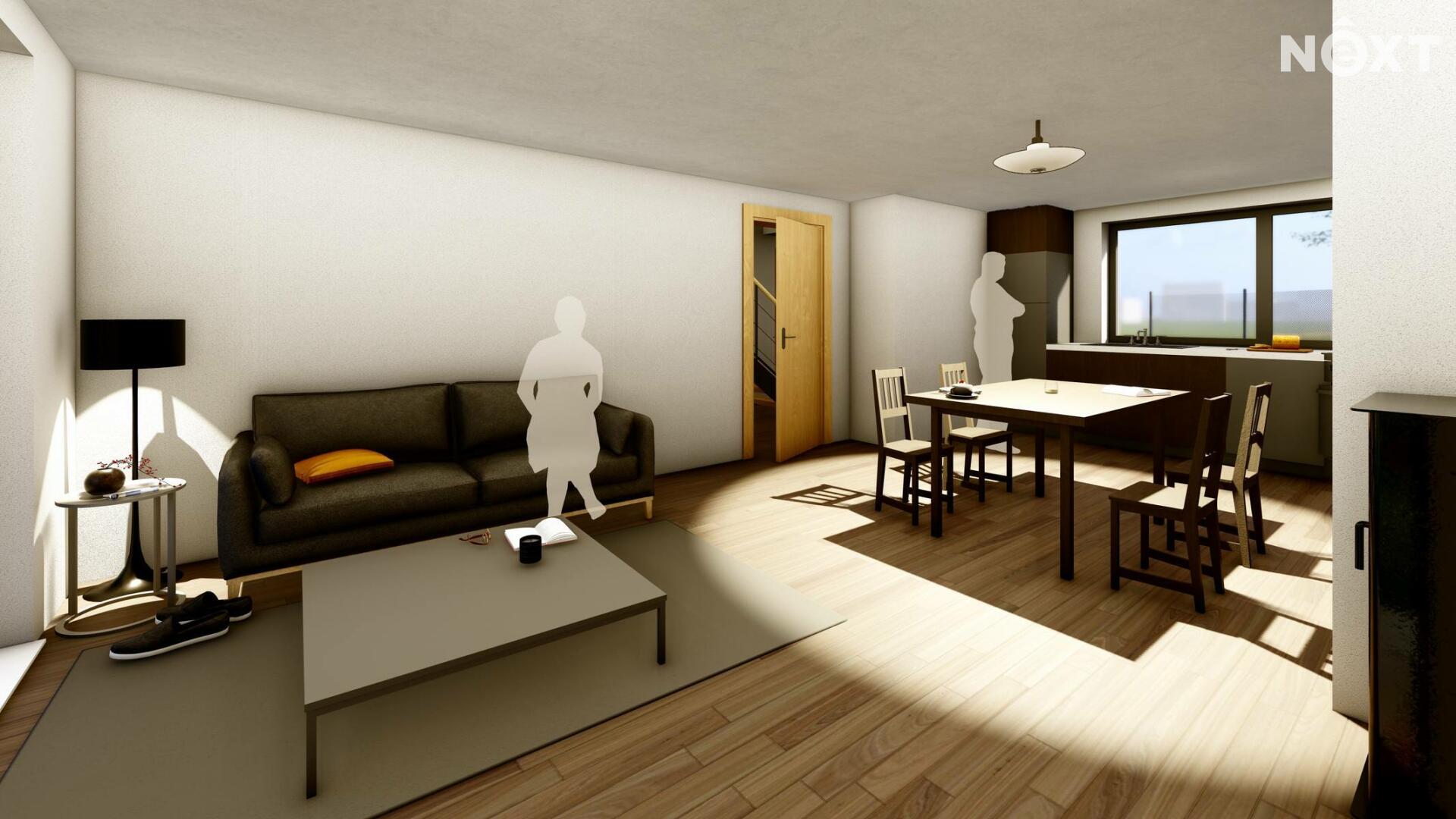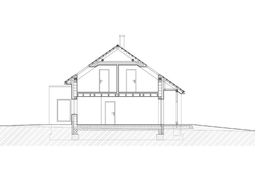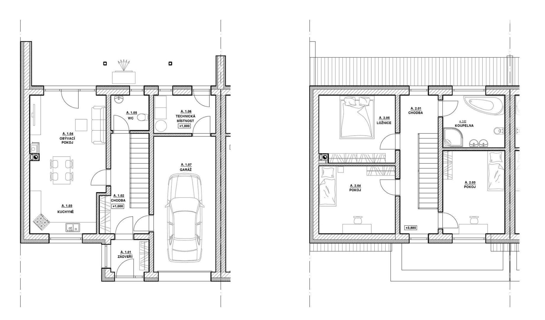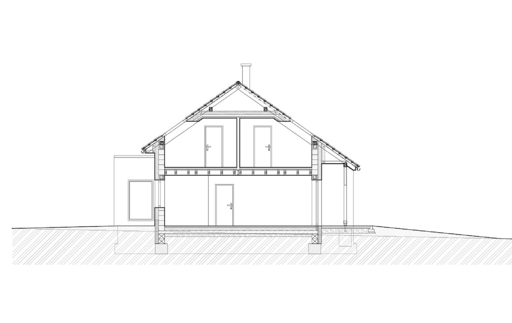 Dispozice domu: 1. NP: Vstupní zádveří navazuje na chodbu se schodištěm, ze které se vstupuje do velkého obývacího pokoje s kuchyňským koutem. Z obytného prostoru je přímý vstup na zastřešenou terasu a zahradu. Z chodby je přístupná garáž, sociální zařízení a také technická místnost s dalším vstupem na terasu.