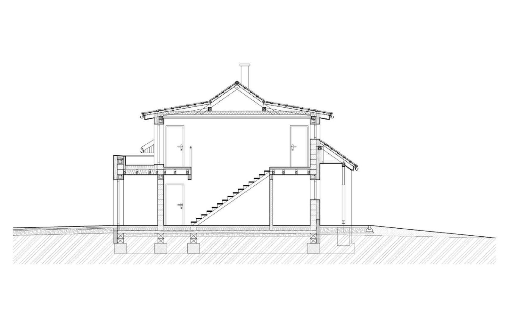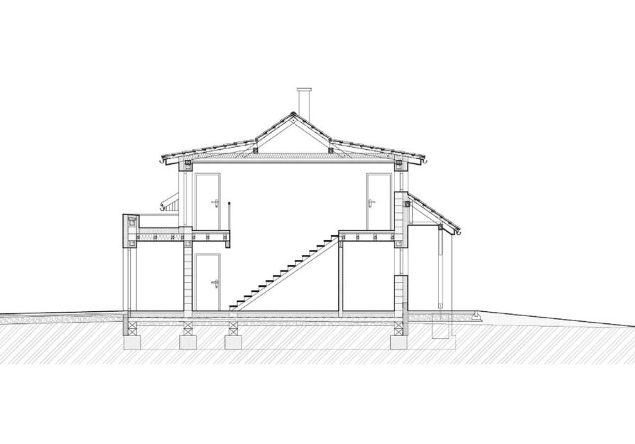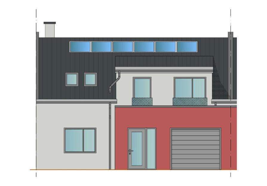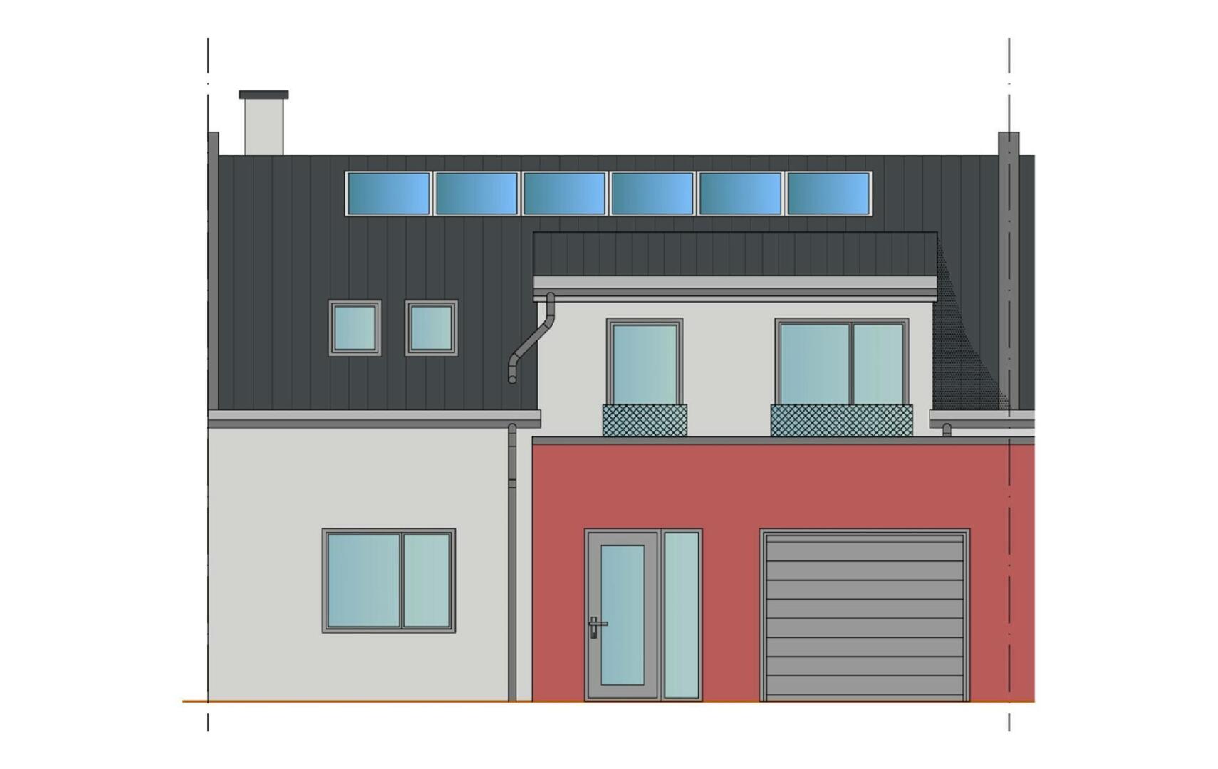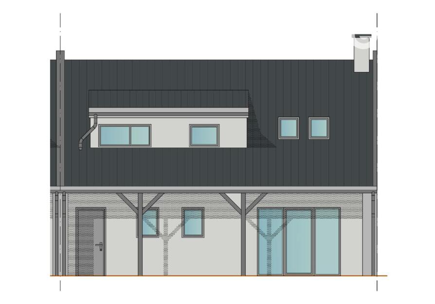 Dispozice domu: 1. NP: Vstupní zádveří navazuje na chodbu se schodištěm, ze které se vstupuje do velkého obývacího pokoje s kuchyňským koutem. Z obytného prostoru je přímý vstup na zastřešenou terasu a zahradu. Z chodby je přístupná garáž, sociální zařízení a také technická místnost s dalším vstupem na terasu.