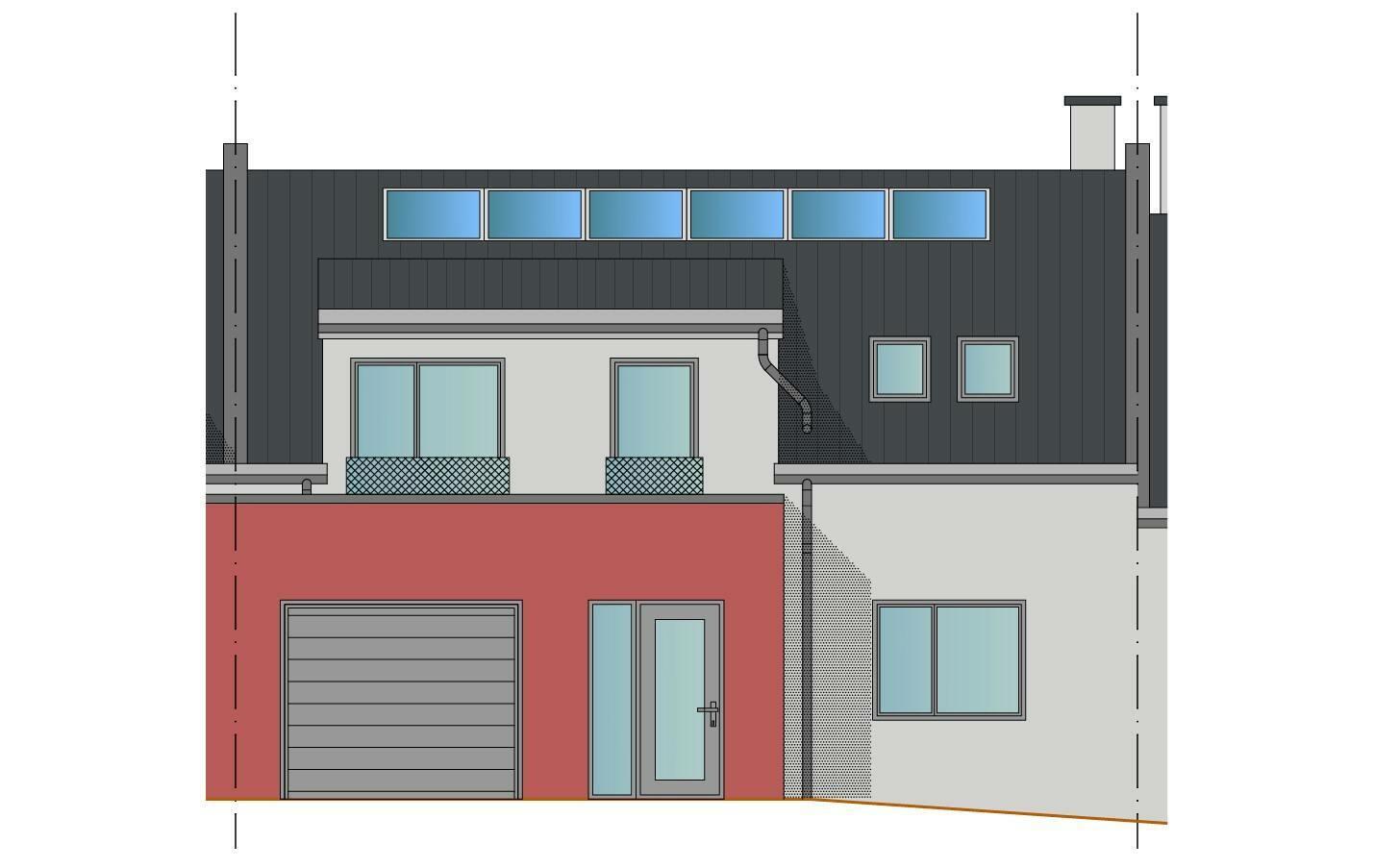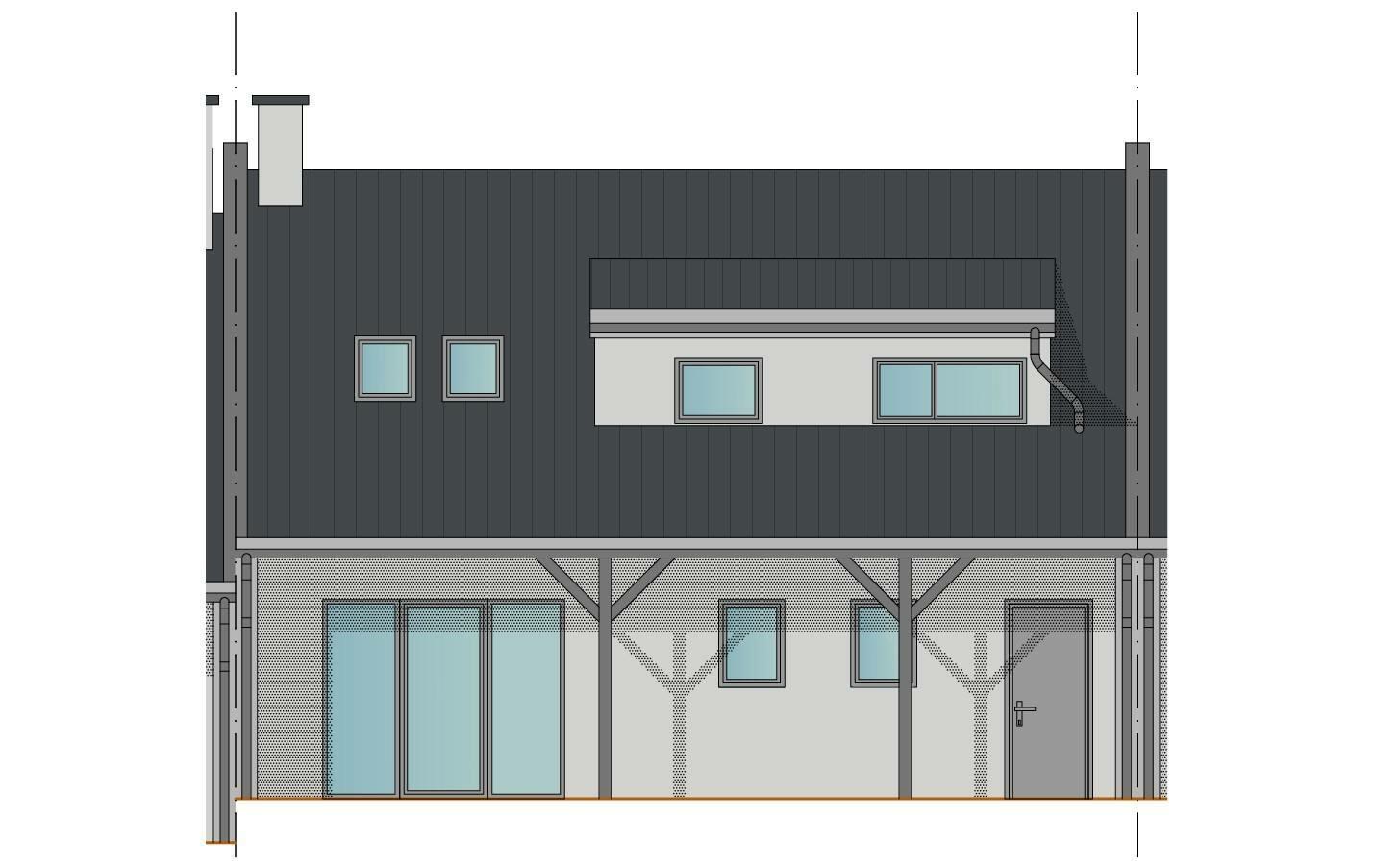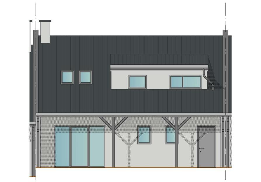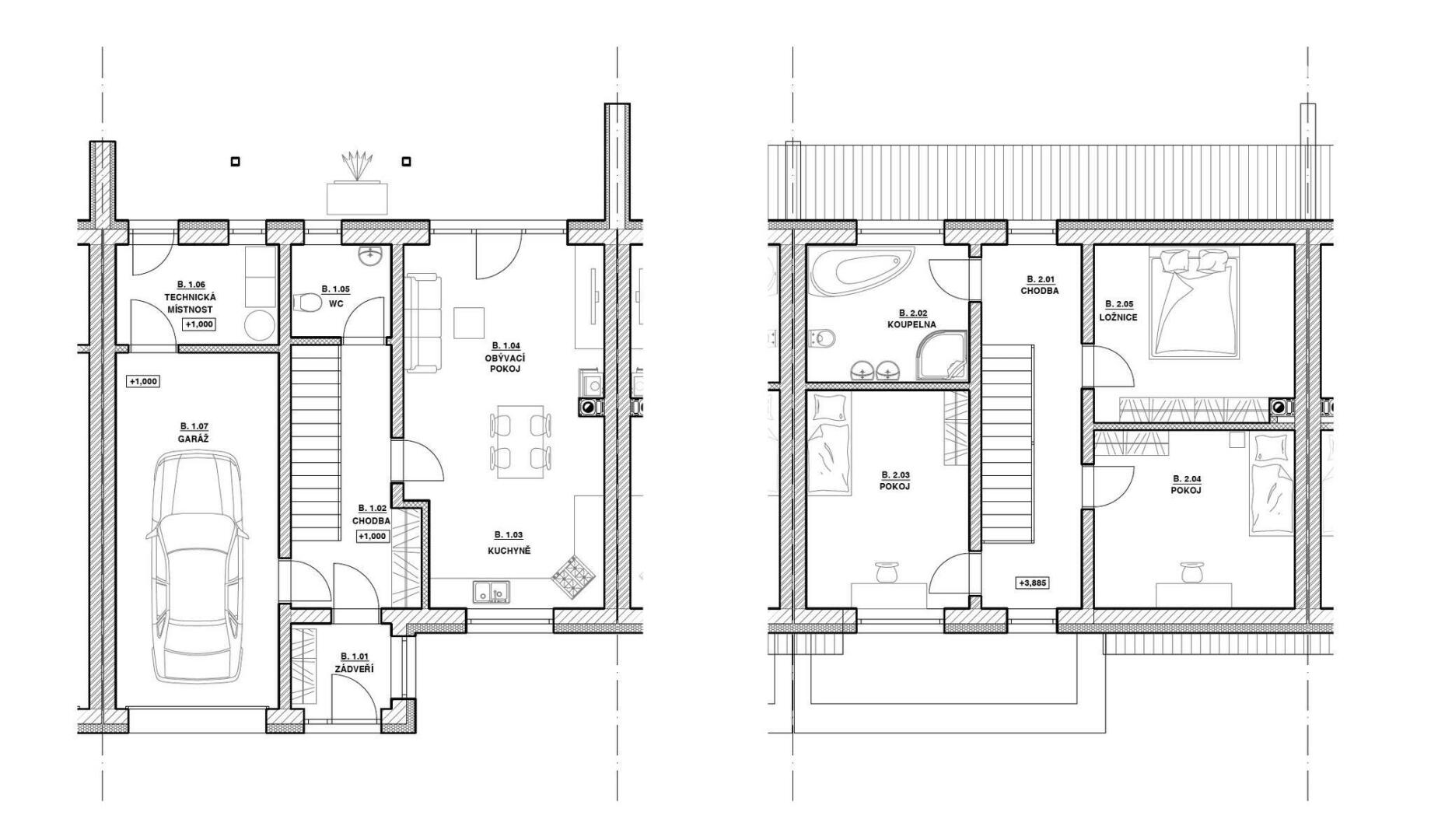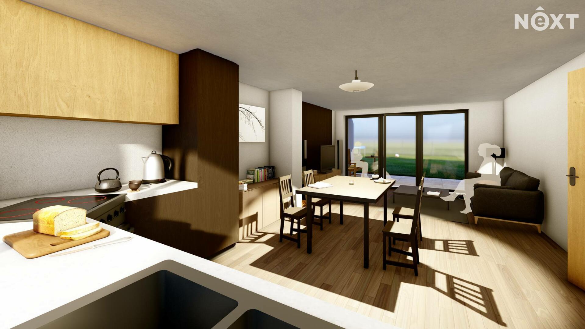 Dispozice domu: 1. NP: Vstupní zádveří navazuje na chodbu se schodištěm, ze které se vstupuje do velkého obývacího pokoje s kuchyňským koutem. Z obytného prostoru je přímý vstup na zastřešenou terasu a zahradu. Z chodby je přístupná garáž, sociální zařízení a také technická místnost s dalším vstupem na terasu.