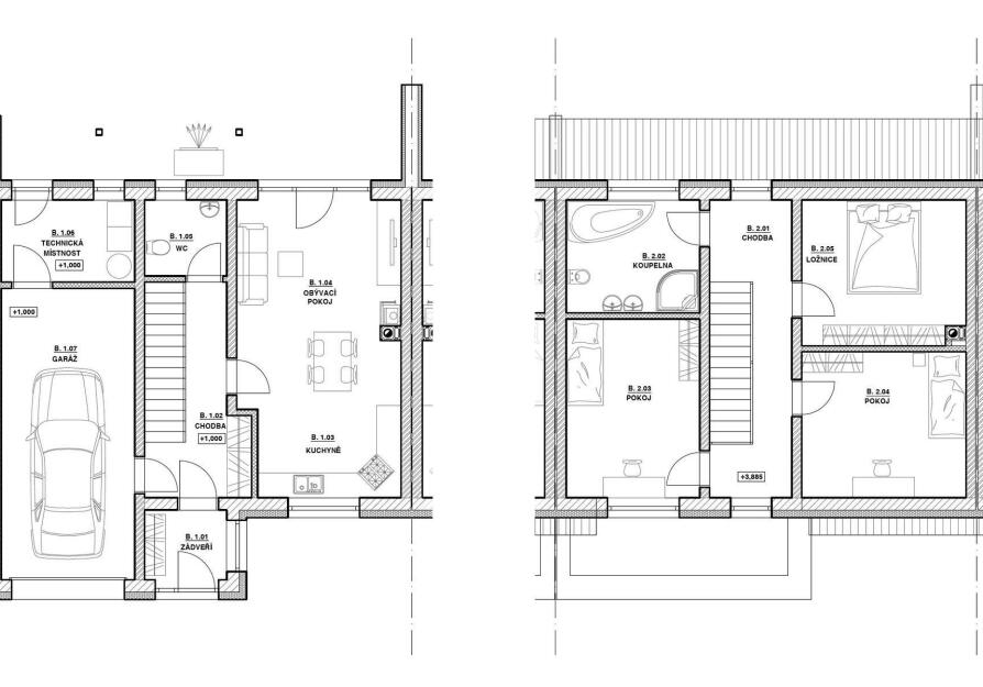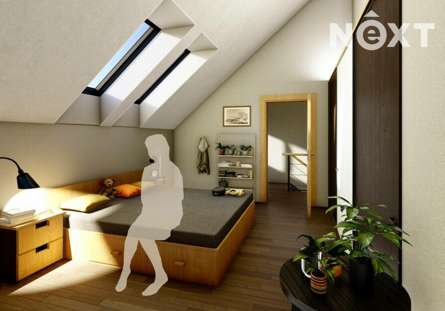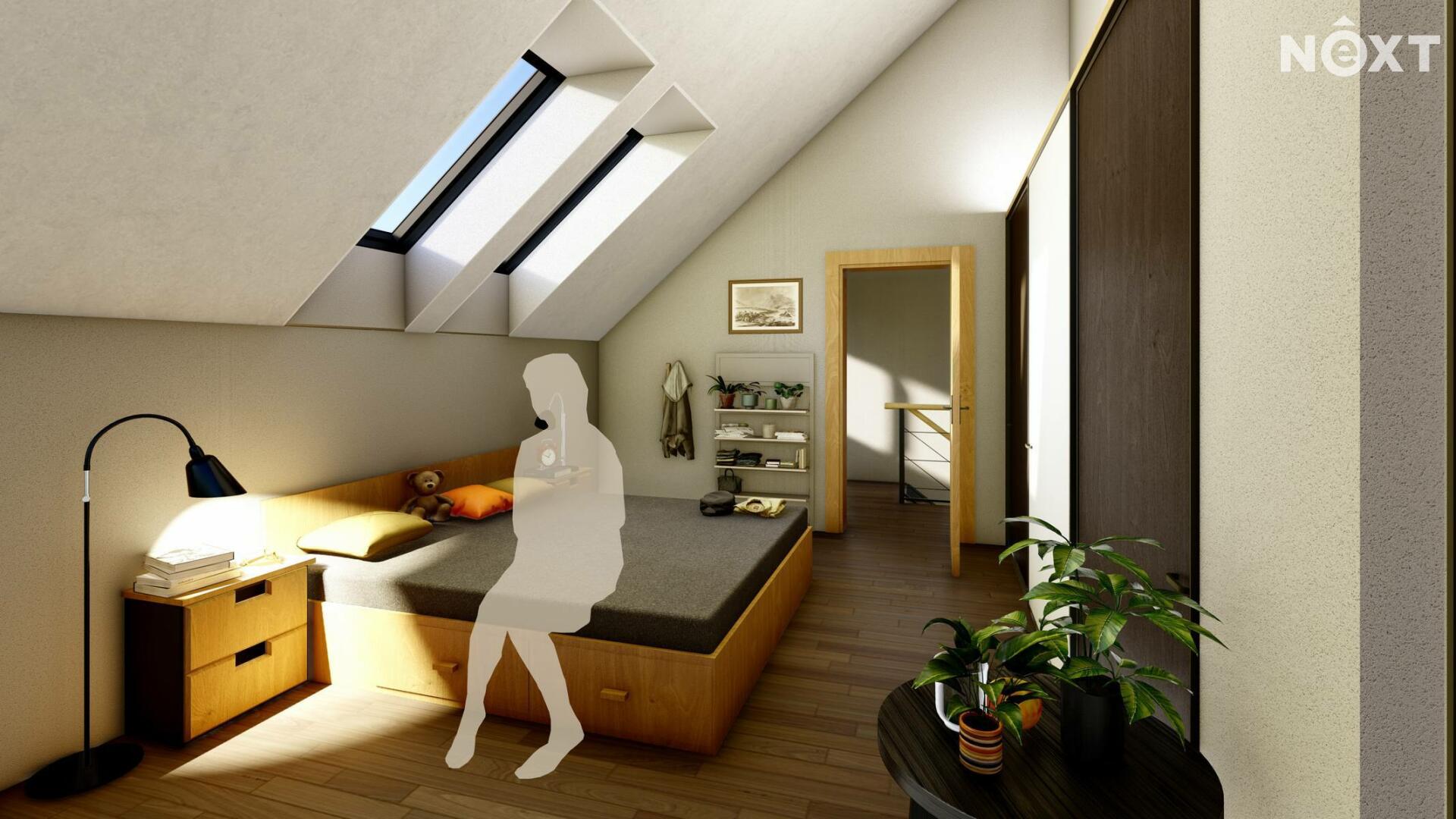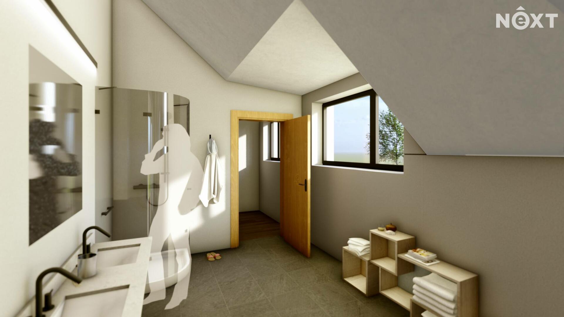 2. NP: Najdete zde tři prostorné ložnice a velkou koupelnu s WC, vanou, sprchou a dvojitým umyvadlem. Z chodby i jedné ložnice je vstup na venkovní balkon s výhledem do klidné části obce.