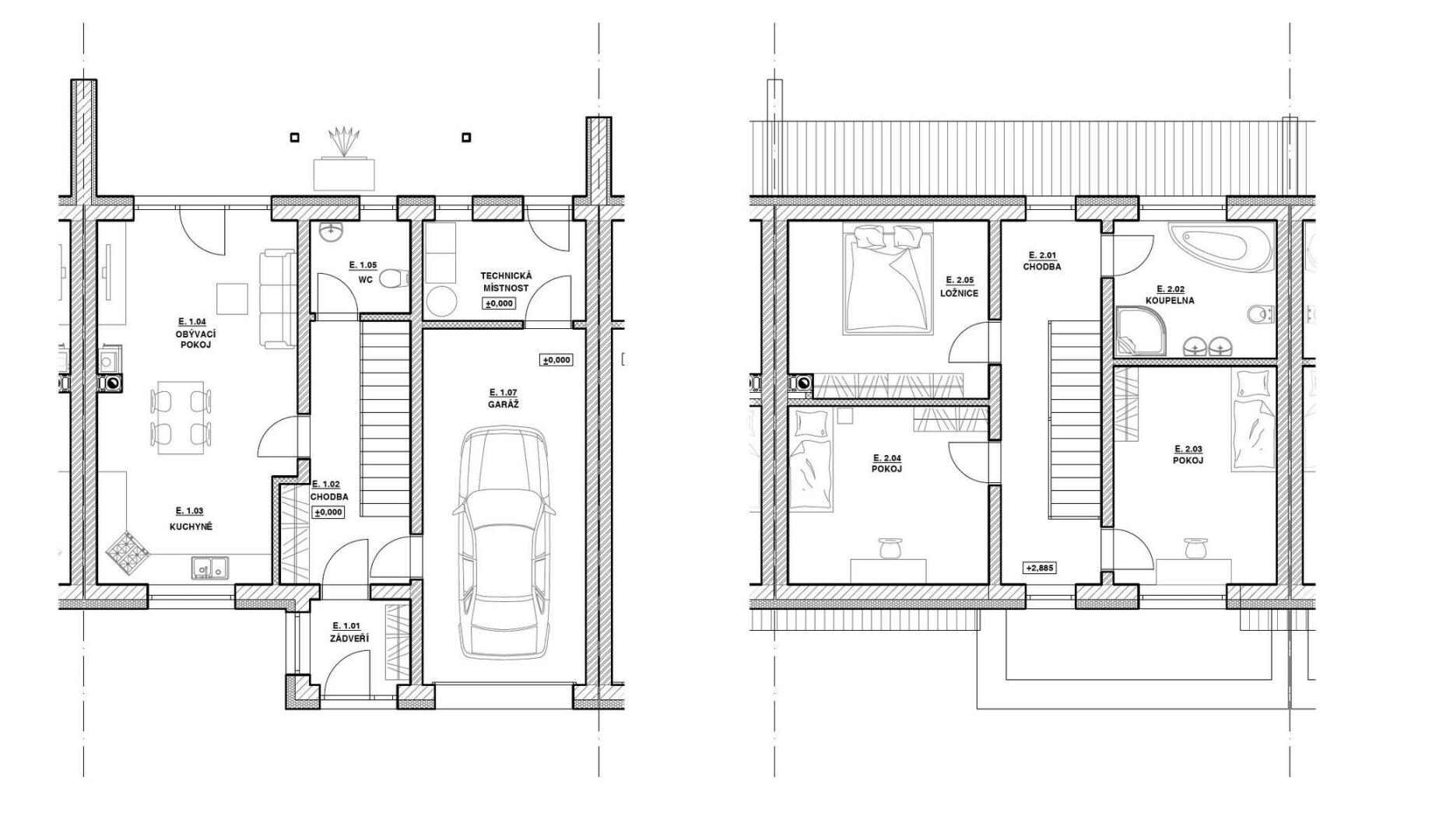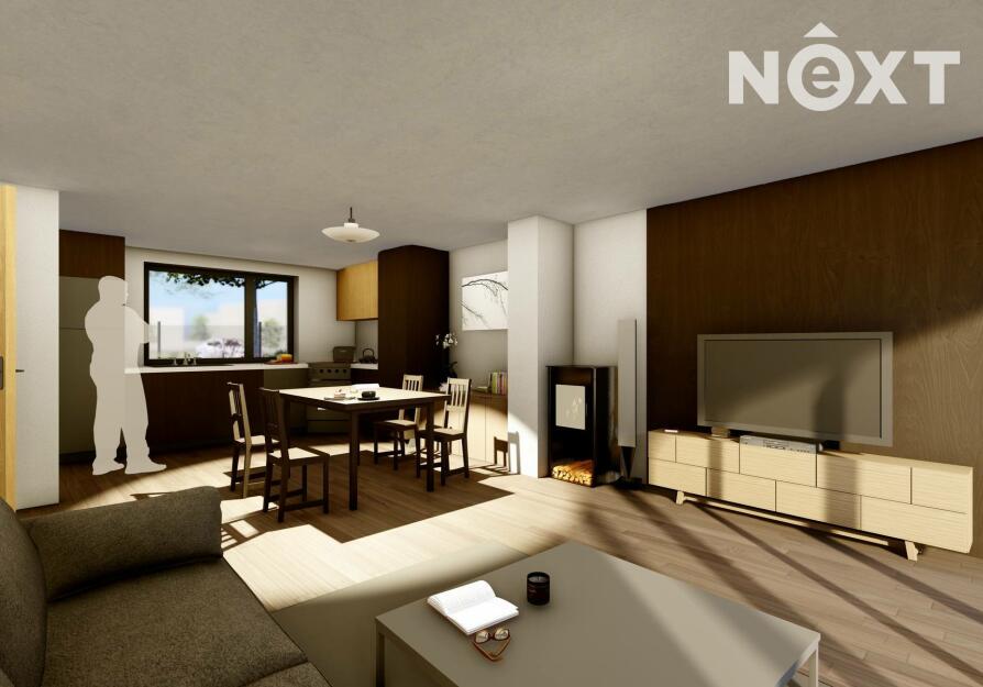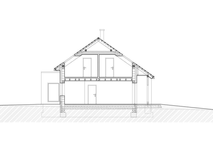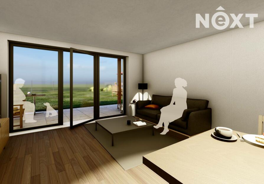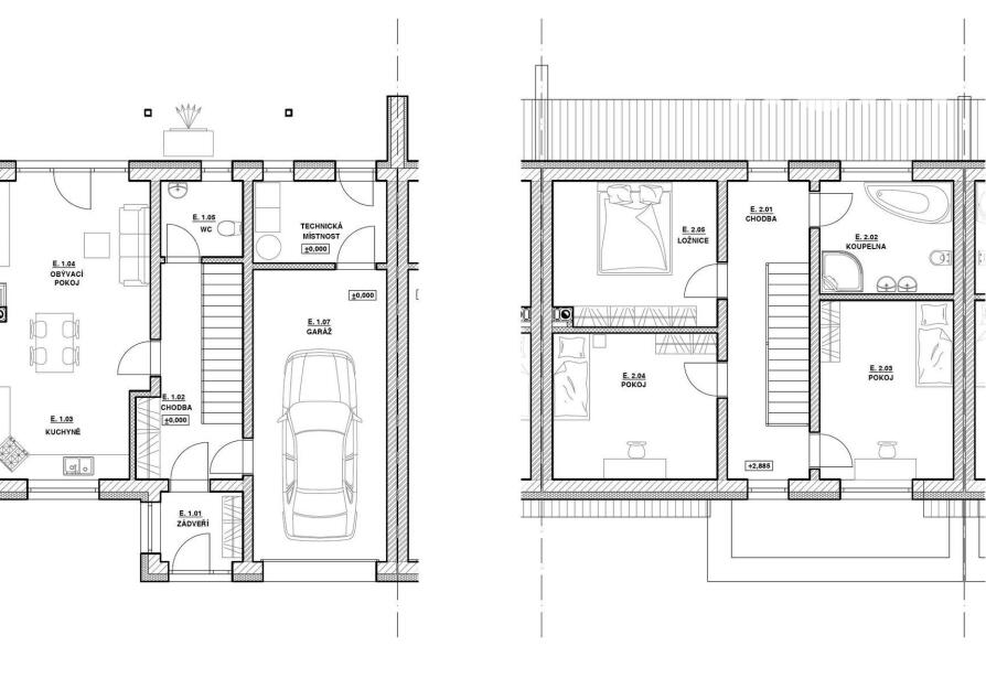 Dispozice domu: 1. NP: Vstupní zádveří navazuje na chodbu se schodištěm, ze které se vstupuje do velkého obývacího pokoje s kuchyňským koutem. Z obytného prostoru je přímý vstup na zastřešenou terasu a zahradu. Z chodby je přístupná garáž, sociální zařízení a také technická místnost s dalším vstupem na terasu.