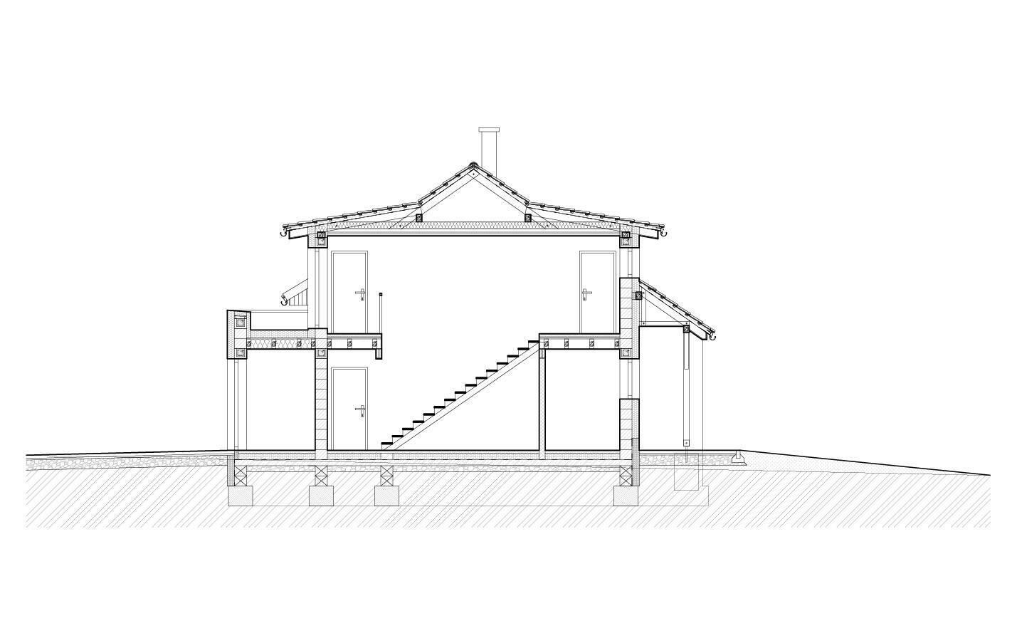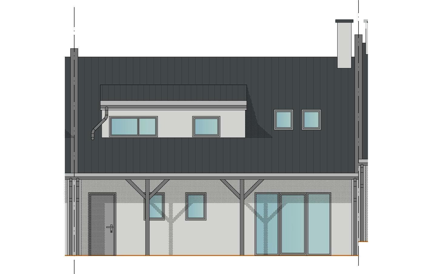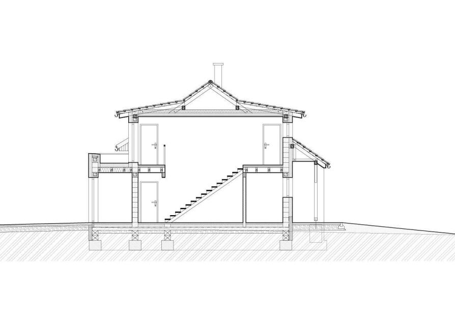 Dispozice domu: 1. NP: Vstupní zádveří navazuje na chodbu se schodištěm, ze které se vstupuje do velkého obývacího pokoje s kuchyňským koutem. Z obytného prostoru je přímý vstup na zastřešenou terasu a zahradu. Z chodby je přístupná garáž, sociální zařízení a také technická místnost s dalším vstupem na terasu.