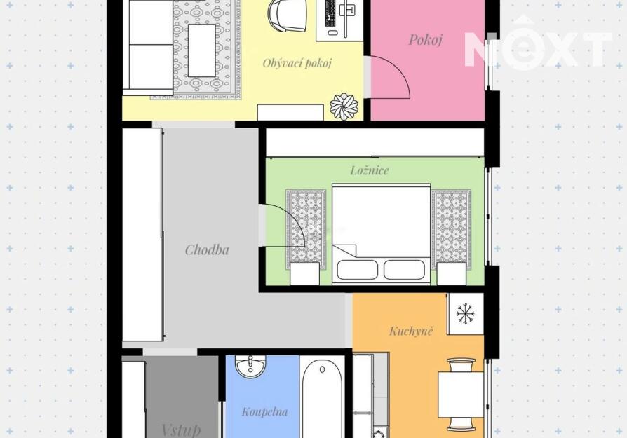 Dispozice bytu nabízí dostatek prostoru pro rodinu, pár i jednotlivce, kteří preferují pohodlné bydlení v klidné části města, ale zároveň chtějí mít vše potřebné na dosah.