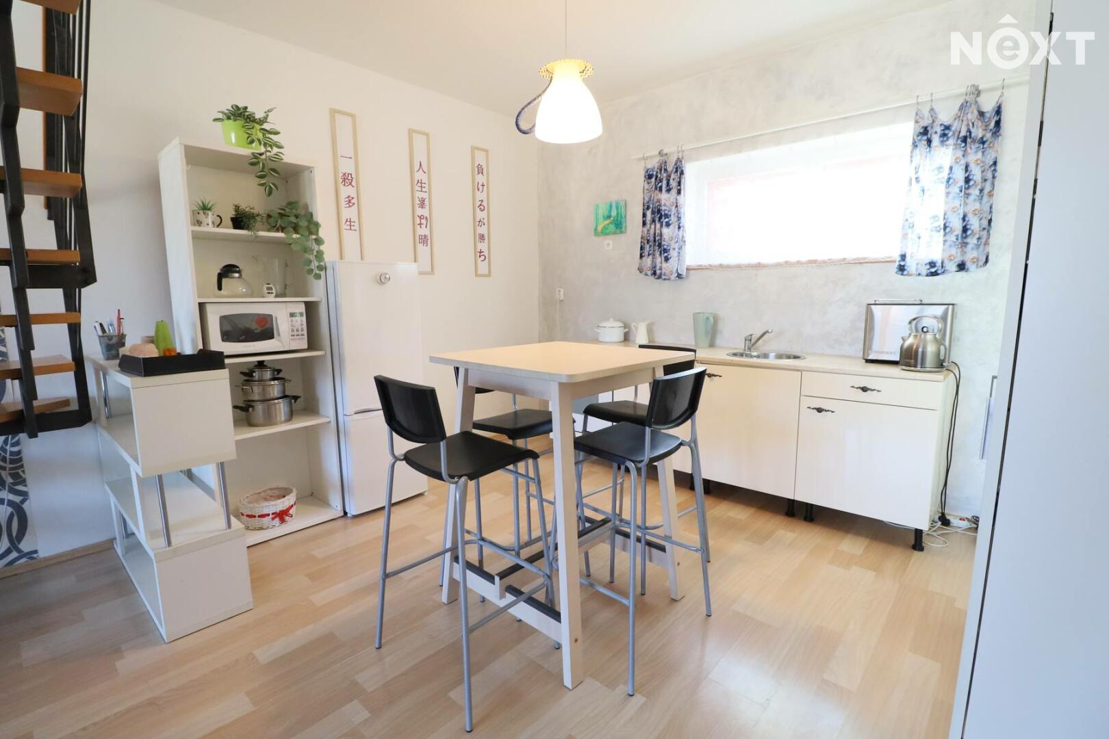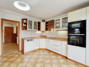 Druhé dveře na balkon vedou do velkorysého obývacího pokoje s kuchyňským koutem. Tento světlý a vzdušný prostor lze nechat otevřený, nebo rozdělit na více zón. Na podlahách plovoucí podlaha, PVC a dlažba. Okna plastová a střešní dřevěná.